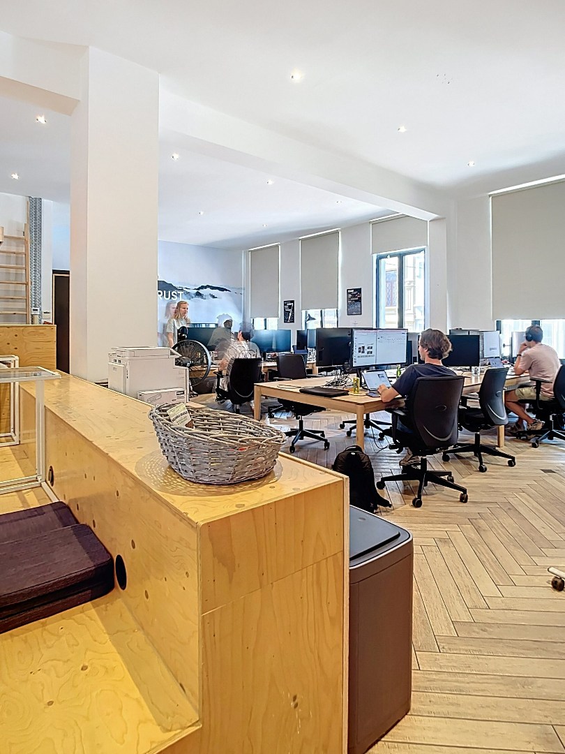 Het kantoor biedt +/- 430 m² verdeeld over drie verdiepingen, telkens met kitchenette en sanitair. Boven geniet je van een ruim terras en beneden van een gemeenschappelijke koer.