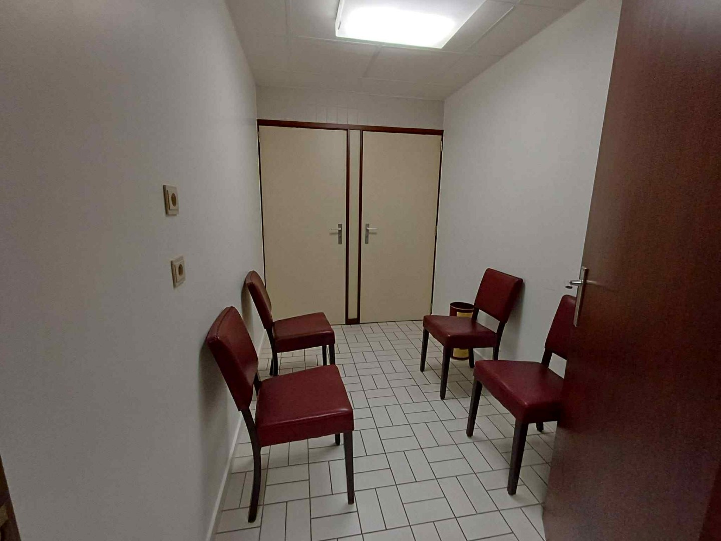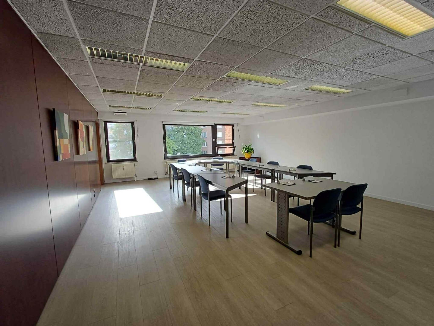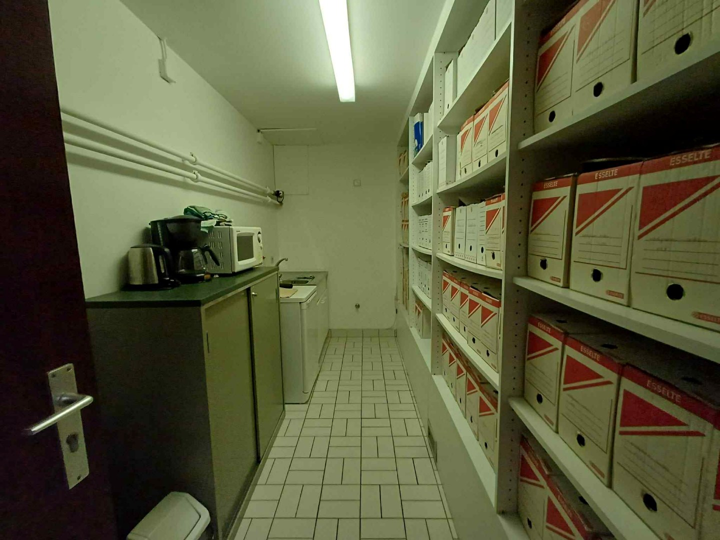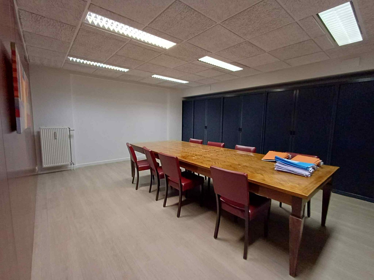 Achteraan: links een apart kantoor/vergaderzaal met ingemaakte kasten, rechts kitchenette.