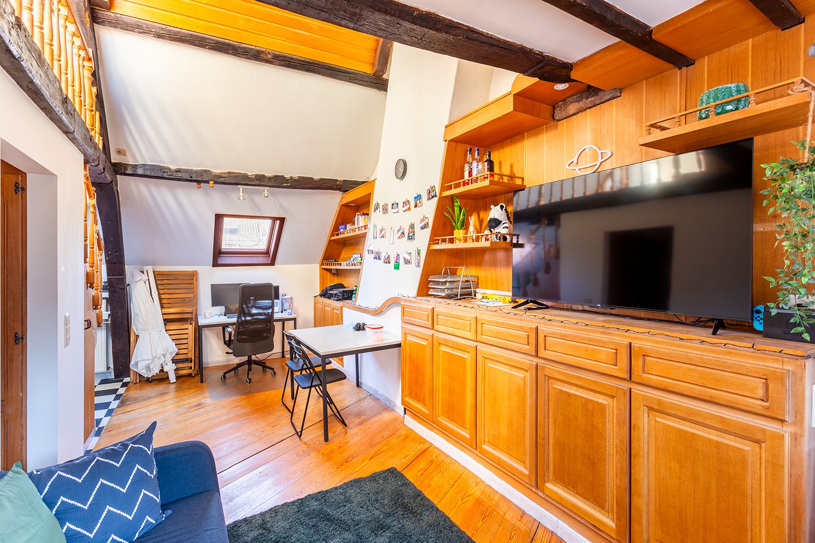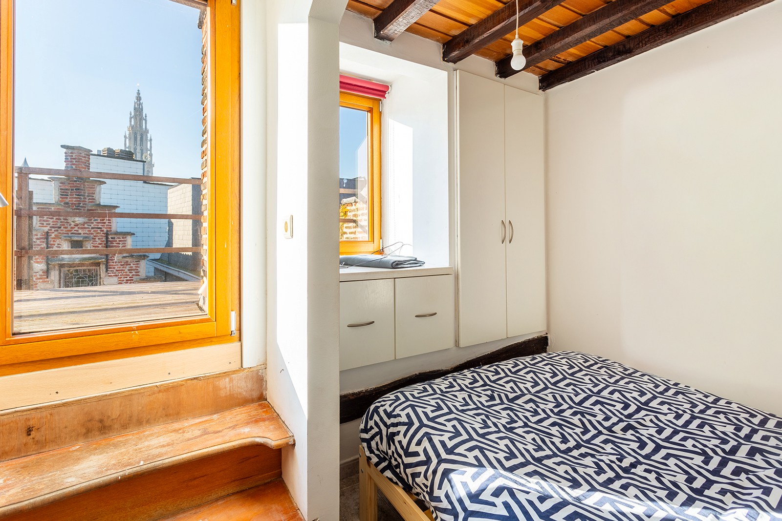 Super gezellig duplex appartement in historisch pand op topligging in hartje centrum Antwerpen. Indeling: inkomhal met vestiaire, leefruimte op parket 20m² met vele bergkasten, ingerichte keuken (koelkast met vriesvak, kookvuur, dampkap), badkamer met douche en toilet, slaapkamer 9m² op het verdiep, prachtig zonneterras 12 m² met zicht op de Kathedraal. Beschikbaar vanaf 1 februari. Maandelijkse kosten € 50 voor water en licht gang. Cv op gas en elektra met eigen meter. Derde verdieping zonder lift. Aansluiting voor wasmachine.