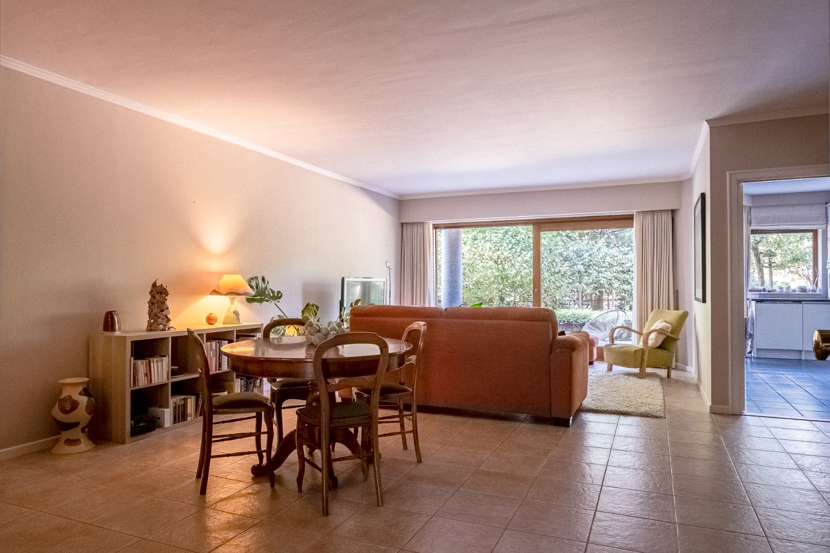 Ruim appartement (117m²) met veel lichtinval en gelegen op het gelijkvloers van residentie ‘Country gardens’. Zeer rustig gelegen aan overzijde van groengebied en toch op wandelafstand van winkels en openbaar vervoer. Indeling: inkomhal met ingemaakte vestiairekasten en veiligheidsdeur; apart toilet; ruime leefruimte op natuursteen vloer; ingerichte keuken met kasten en toestellen (kookfornuis, dampkap, spoelbak, vaatwasser, koelkast en diepvries) en met aansluitingen voor was- en droogautomaat; via keuken en leefruimte toegang tot een ruim en zonnig zuidwest gericht terras (20m²); badkamer met ligbad/douchscherm, dubbel lavabomeubel, toilet en wandkast; 2 slaapkamers (16m² - 14m²) op parket; ondergrondse autostaanplaats bij te huren voor 50€/maand. Algemene onkosten: 100€/maand (incl privatief water, poetsen hal, elektriciteit gemene delen, ...) EPC: 422 kWh/m²