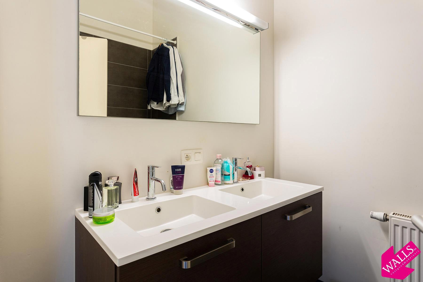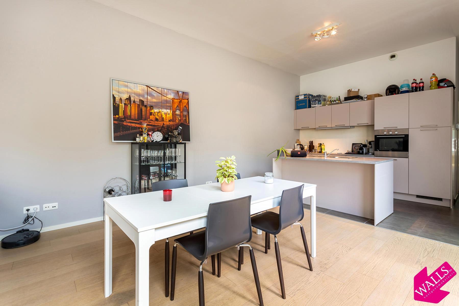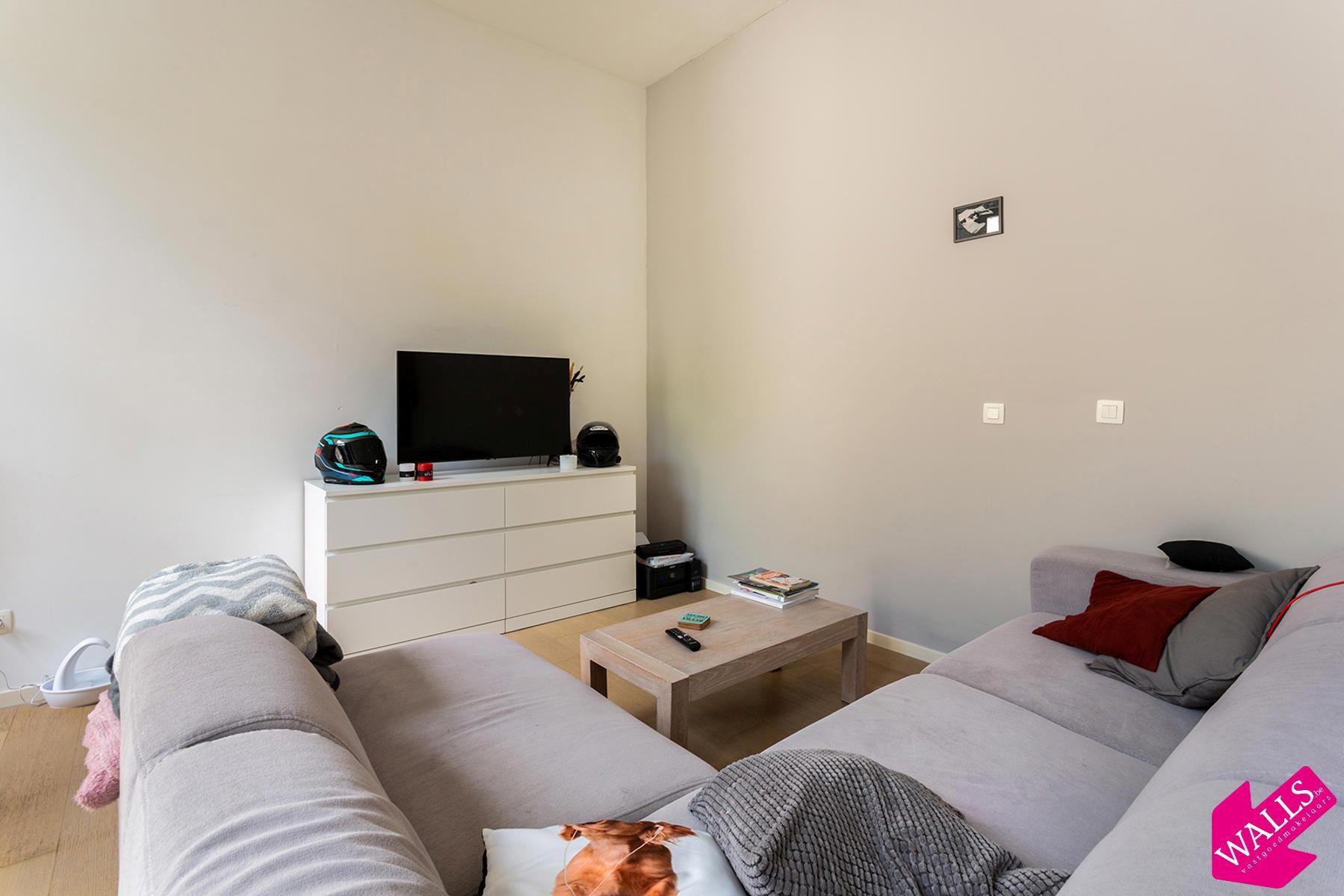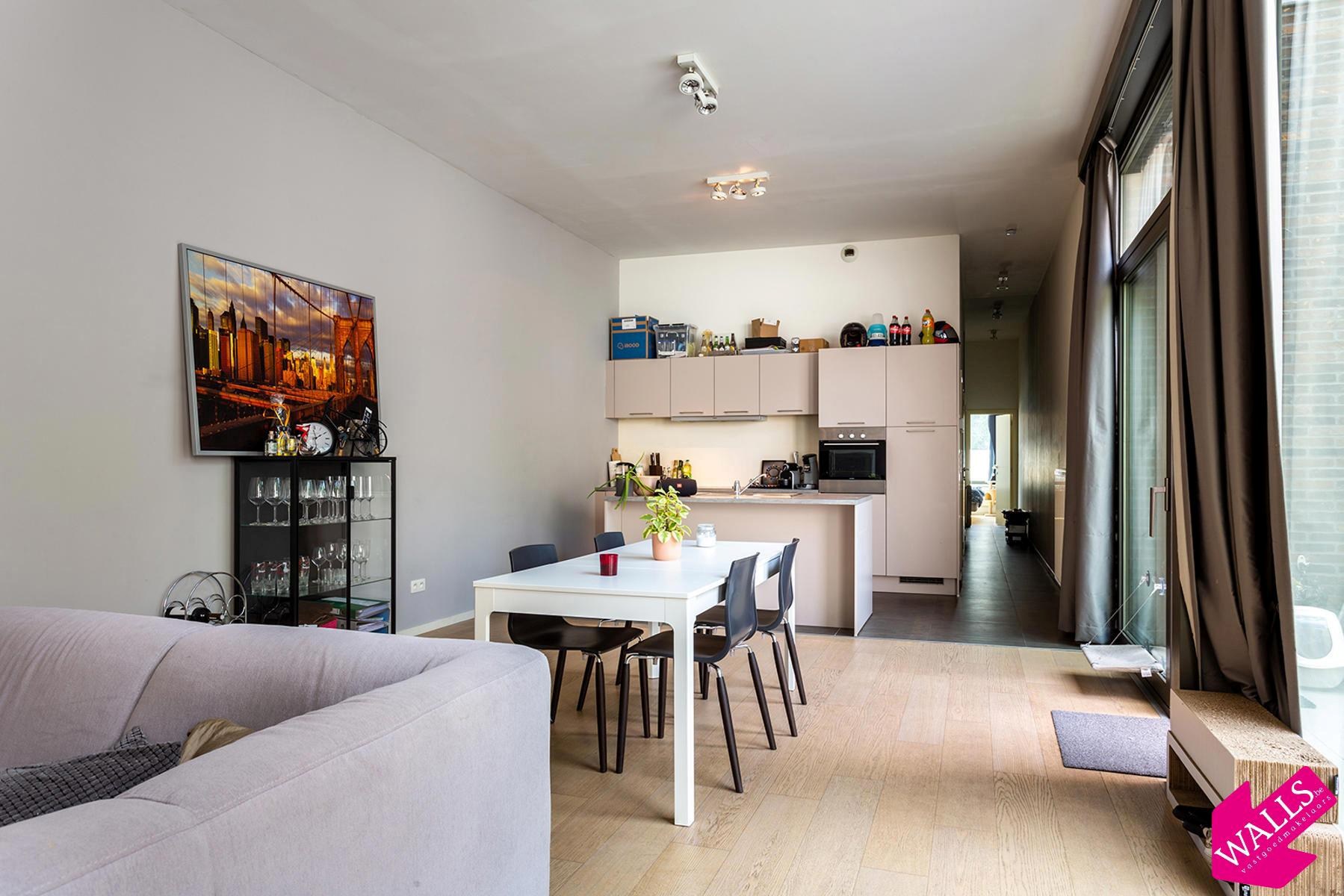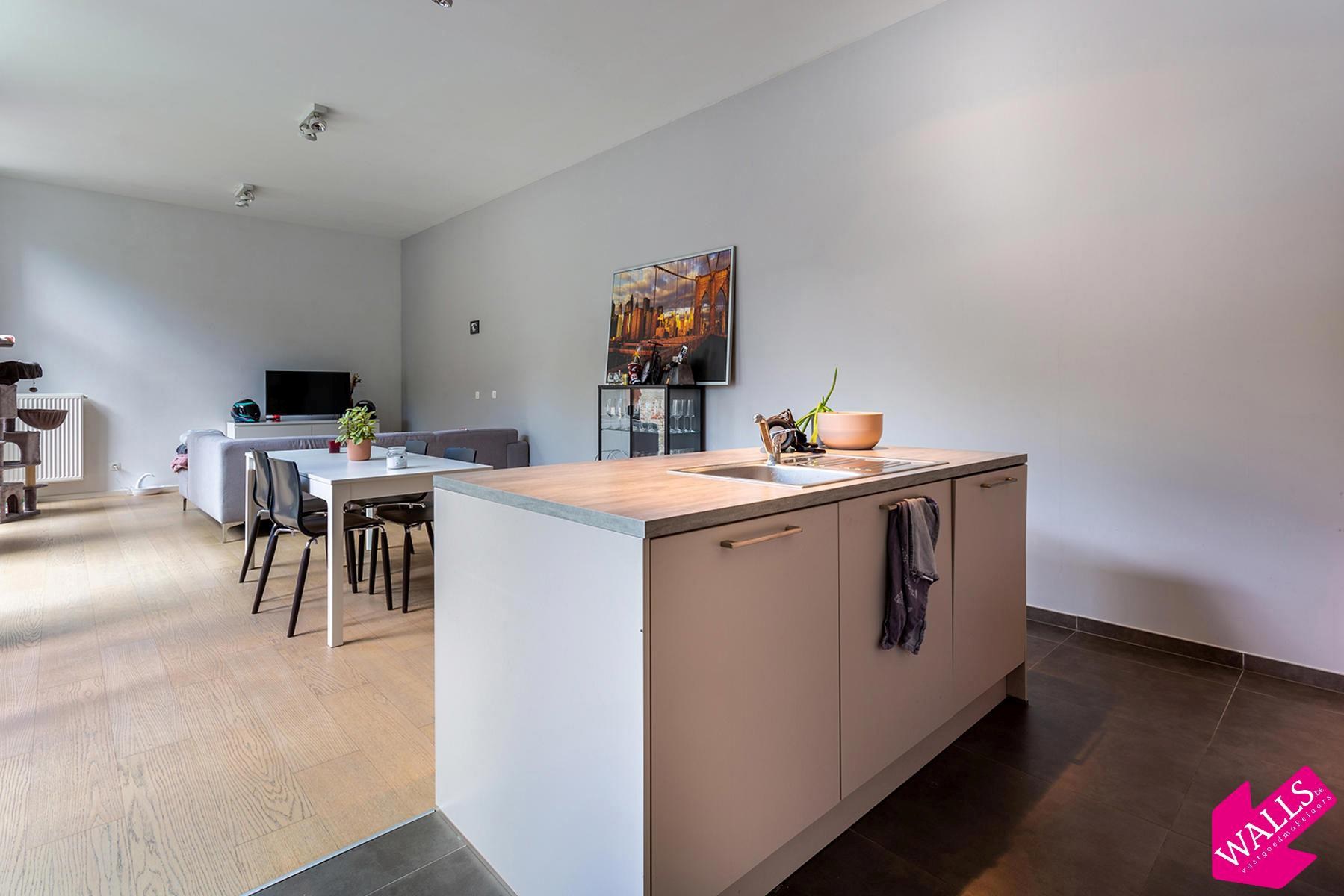 inkomhal met afzonderlijk toilet en ruime berging voor wasmachine & droogkast, zeer ruime en lichte leefruimte op parket met zicht op de tuin en open volledig ingerichte keuken met grote frigo, oven, afwasmachine, kookvuur-dampkap en keukeneiland waar je aan kan gaan zitten, videofoon, badkamer met ligbad en dubbel lavabomeubel. 1 aparte slaapkamer.