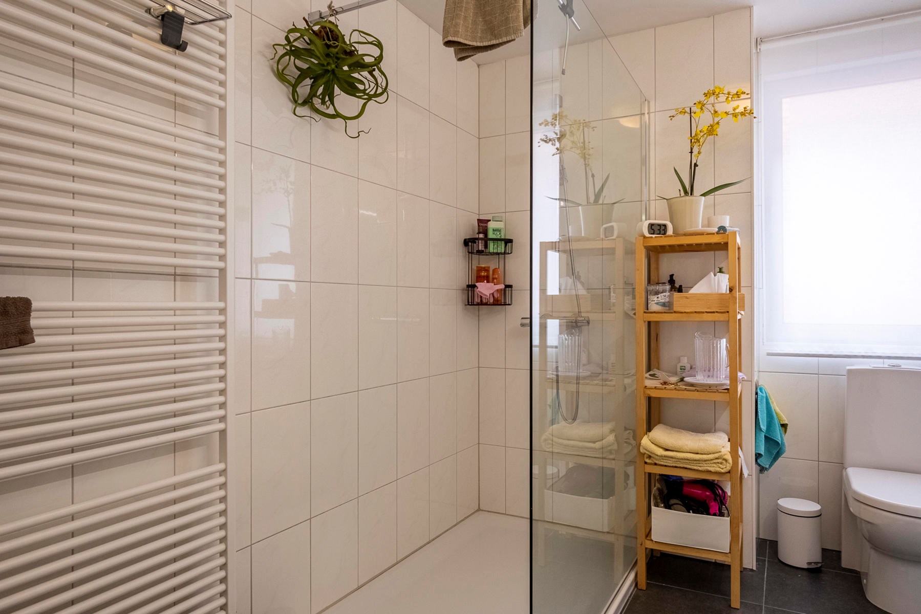 2de verdieping met lift van een zeer verzorgd gebouw. Inkomhal, leefruimte op tegel met een moderne half open keuken – voorzien van alle nodige toestellen (combi-oven, koelkast met vriesvak, elektrisch kookveld, dampkap en vaatwasser). Vanuit de woonkamer heeft u toegang tot het terras dat uitkijkt op de binnentuin. Moderne badkamer met inloopdouche, dubbele lavabo en WC. Verder beschikt het appartement nog over een apart gastentoilet. 2 ruime slaapkamers ( 11 m² + 13 m² ) en 3e kleinere kamer (logeerkamer of buro).