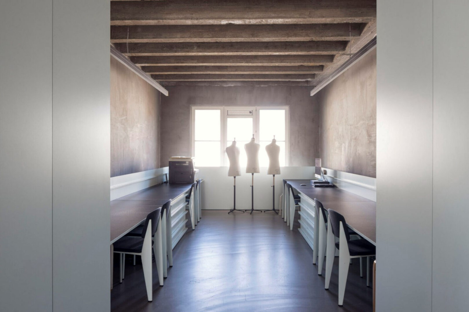 Op de tweede verdieping wacht een kantoorruimte van ca. 925 m², ingericht volgens een ontwerp van niemand minder dan Raf Simons. Verwacht geen standaard white box: hier werk je tussen zichtbare houten balken, karaktervolle details en overvloedig daglicht. Stijlvol, sfeervol, inspirerend.