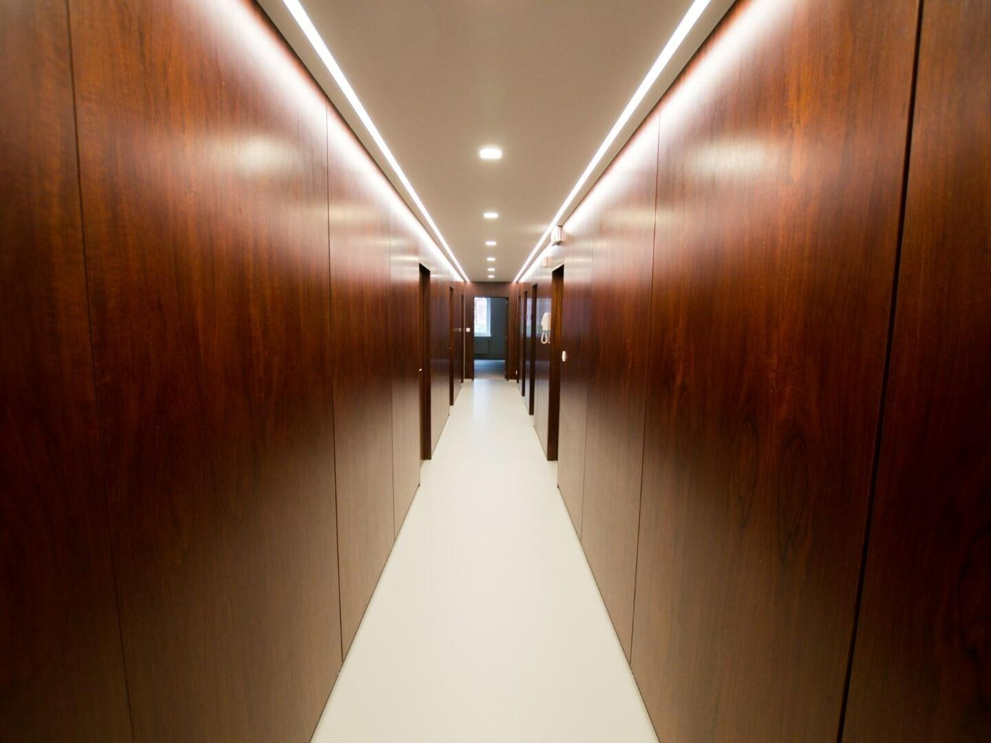 Vooraan: twee aparte kantoorruimtes met ingemaakte kasten in donker hout.