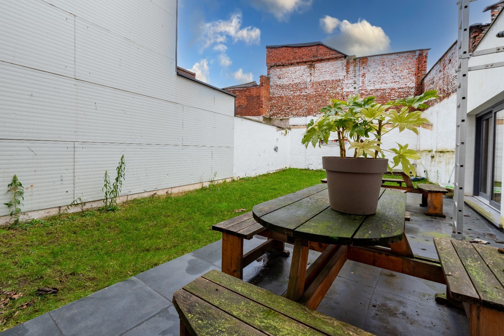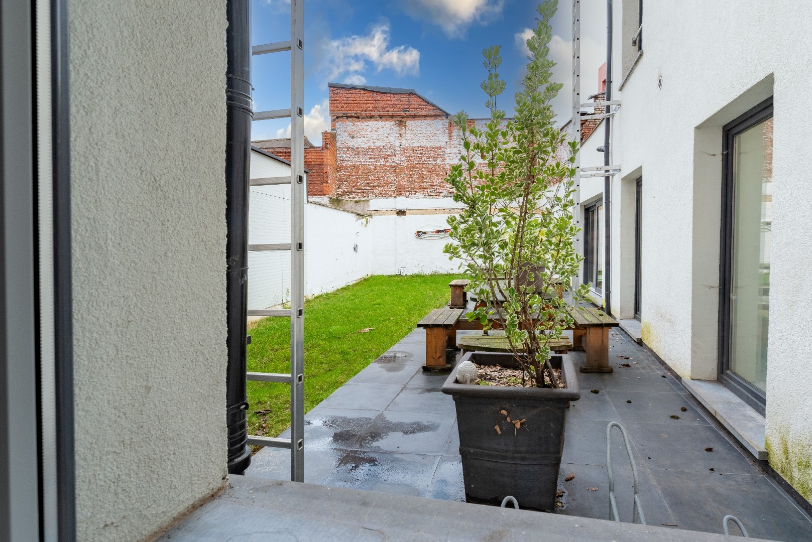Het gemeenschappelijk terras van het appartement biedt een rustige plek om te ontspannen.