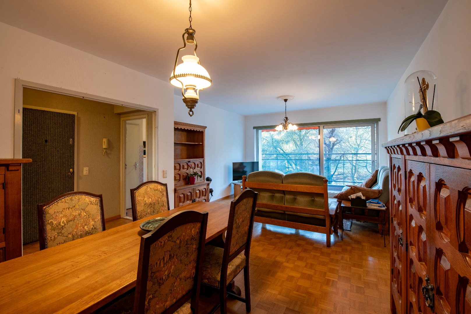 Het aangename appartement van ca. 85 m² bevindt zich op de tweede verdieping van een verzorgd residentieel gebouw. Via de inkomhal met ingemaakte vestiairekast betreed je de verschillende ruimtes van het appartement. De leefruimte is voorzien van een parketvloer, de keuken is functioneel ingericht, de badkamer is voorzien van een ligbad en een lavabomeubel. Verder beschikt het appartement over twee slaapkamers en twee ruime terrassen met een aangenaam uitzicht op het groen. De maandelijkse provisie voor de algemene onkosten bedraagt €235.