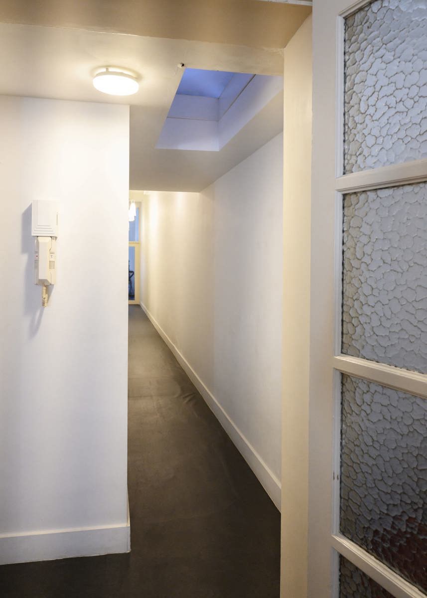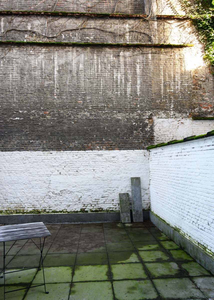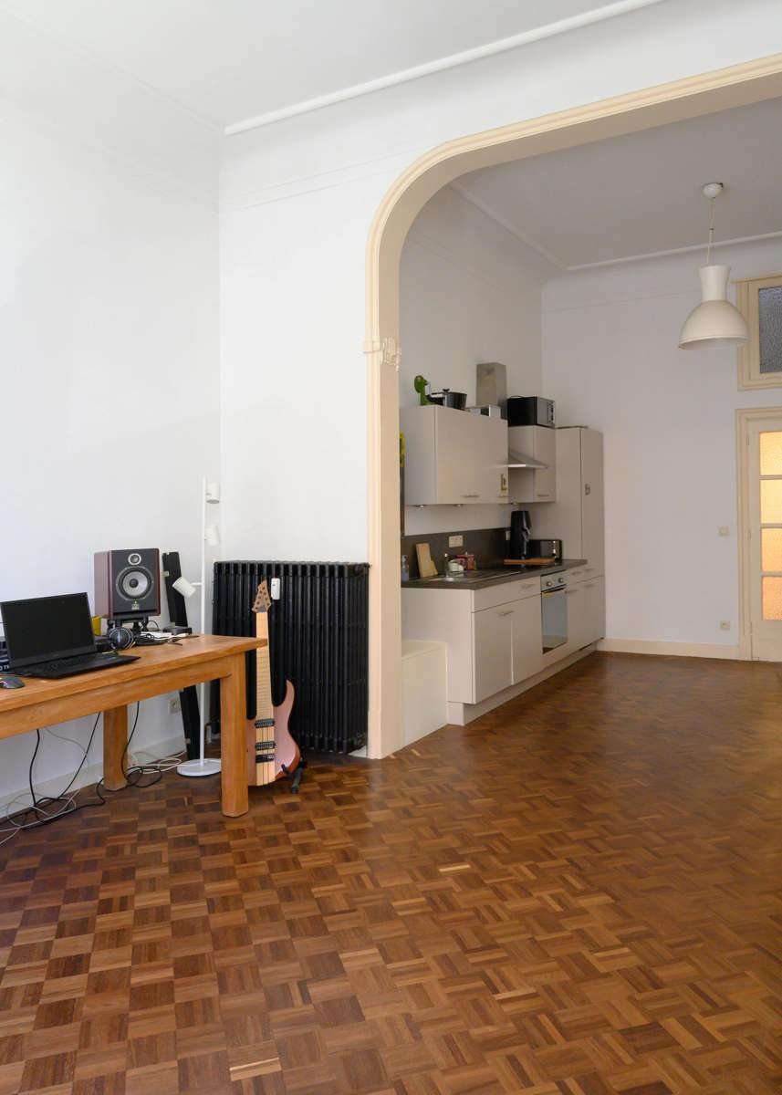 Via de gemeenschappelijke inkomhal met authentieke geblokte vloer betreden we het gelijkvloerse appartement. De private inkomhal geeft toegang tot de woonruimte via een dubbele deur met glas. De woonruimte is gelegen aan de voorzijde van het appartement en bestaat uit een woonkamer met open keuken. De keuken is uitgerust met een kookvuur, oven en koelkast met vriesvak. In het pand werden de authentieke elementen, zoals de molurus, behouden. Via de gang komen we terecht in de badkamer. Deze bestaat uit een bad met douche en lavabomeubel. Als laatste is er nog de slaapkamer. Deze ligt aan de achterzijde van het appartement en geeft toegang tot het terras. Door de grote raampartijen achteraan baadt de slaapkamer in het licht.