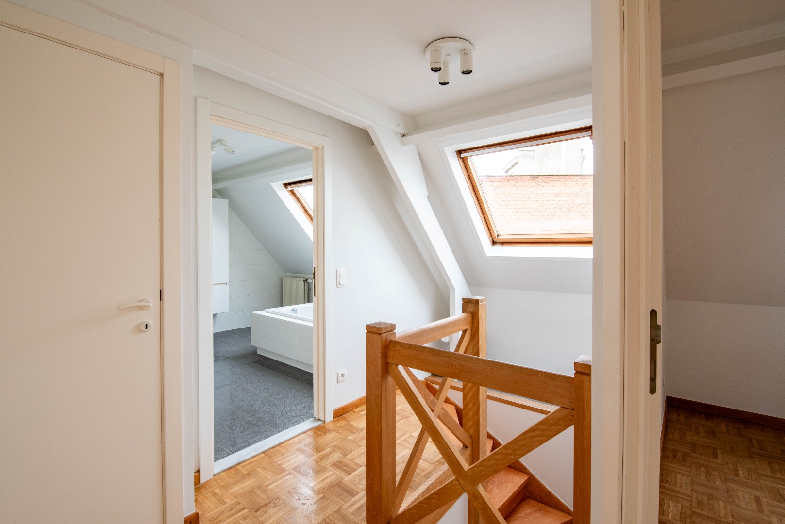 Hal, grote badkamer met ligbad, aparte douche en dubbel lavabomeubel. Twee volwaardige slaapkamers waarvan 1 met extra bergruimte op de duplex.