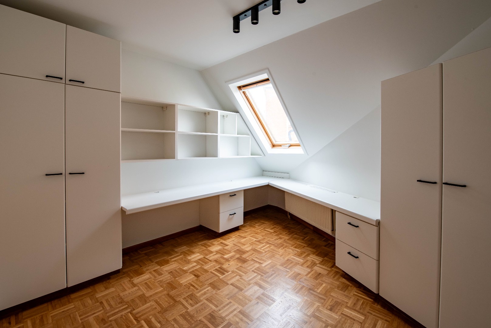 Hal met apart toilet. 1e slaapkamer voorzien van vele vaste kasten/bureau.