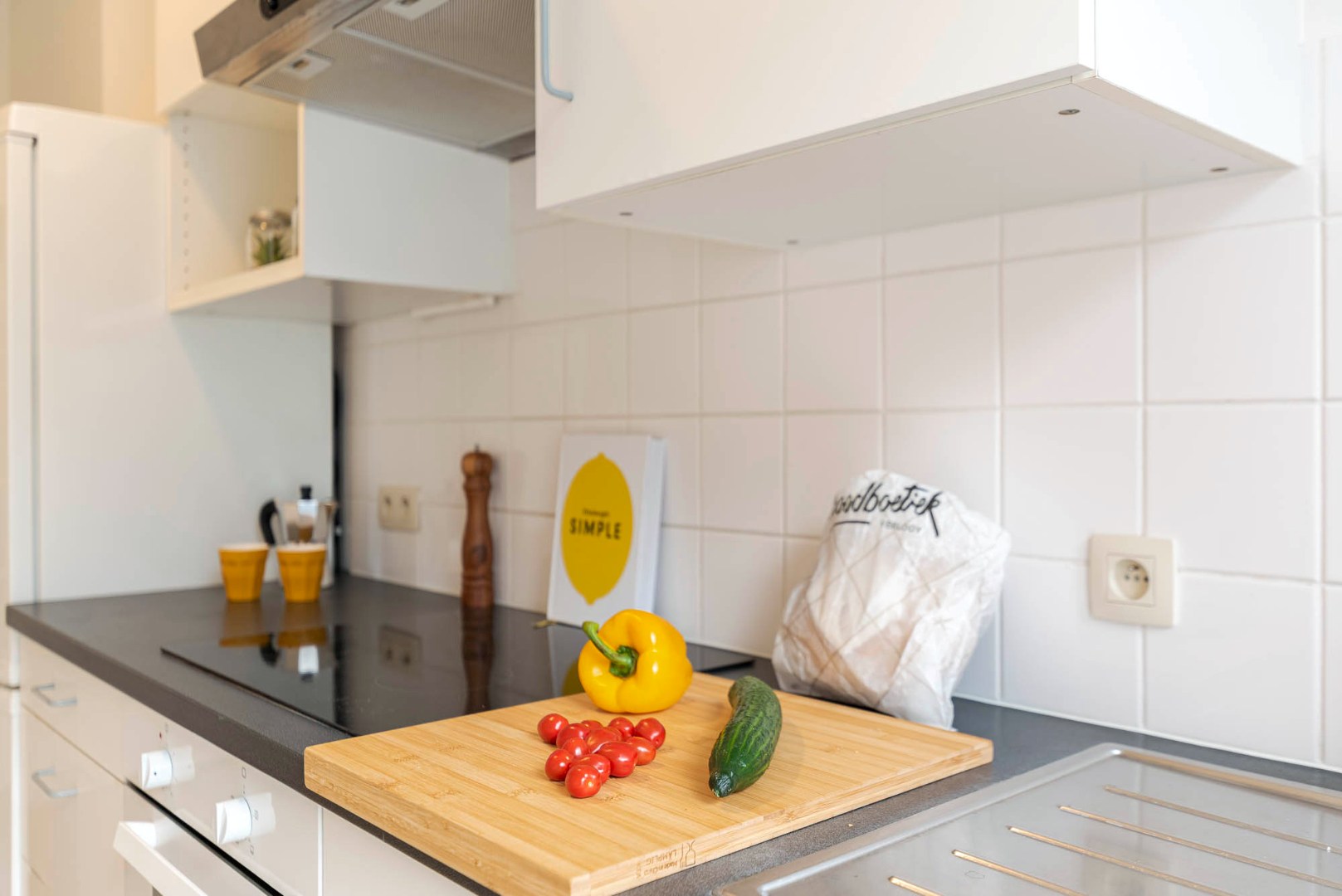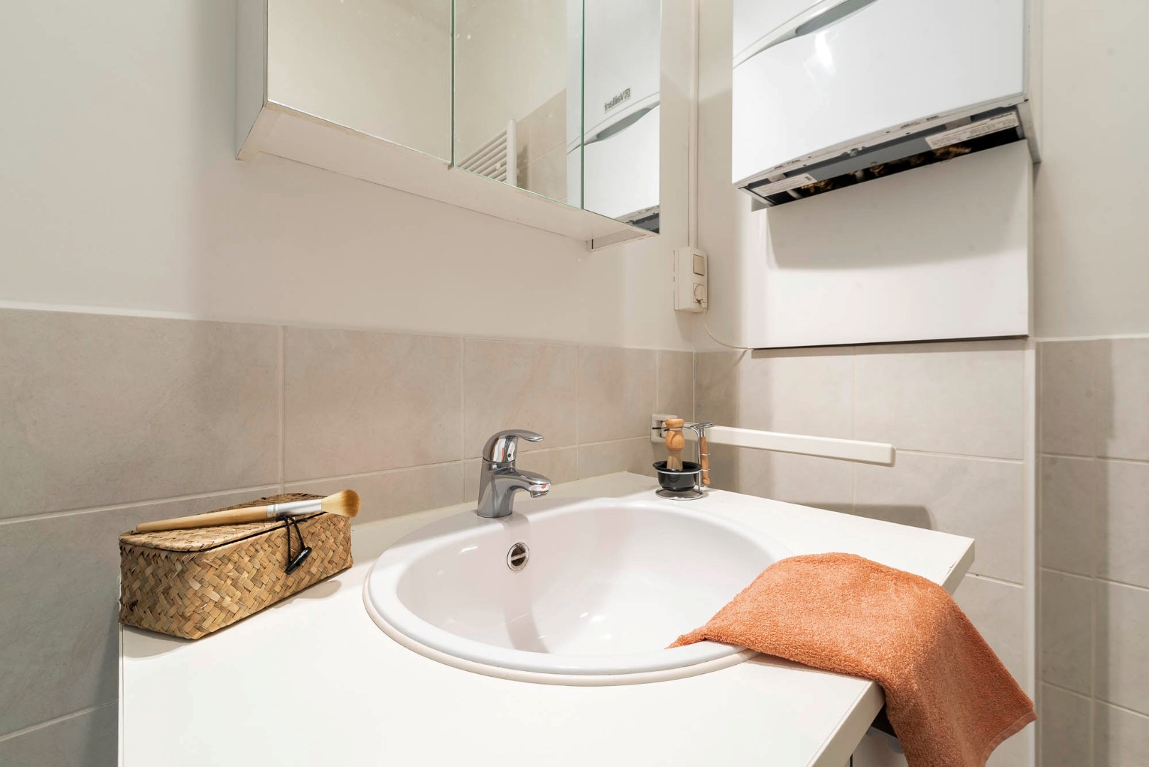 Inkomhal met ingemaakte vestiairekast, leef en eetruimte met een origineel (sier) schouw uit de jaren 40. Keuken voorzien van een vaatwasser, koelkast en vriezer, nieuwe elektrisch kookvuur, oven en dampkap. Verder bevindt zich hier ook de aansluiting voor de wasmachine. Klein balkonnetje aan de achterkant. De badkamer is voorzien van een bad met douchescherm en douchefunctie en een lavabo. Apart Toilet.