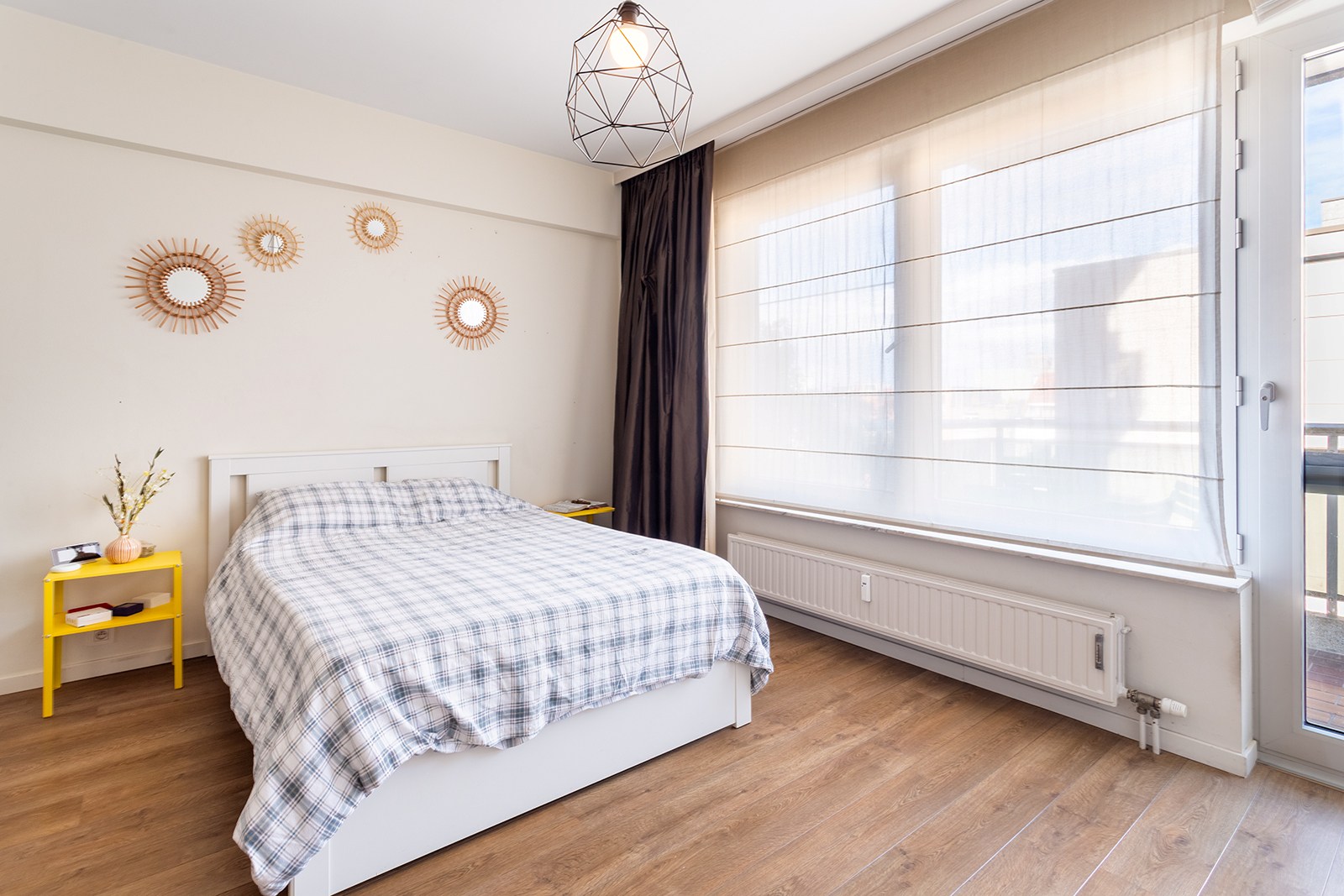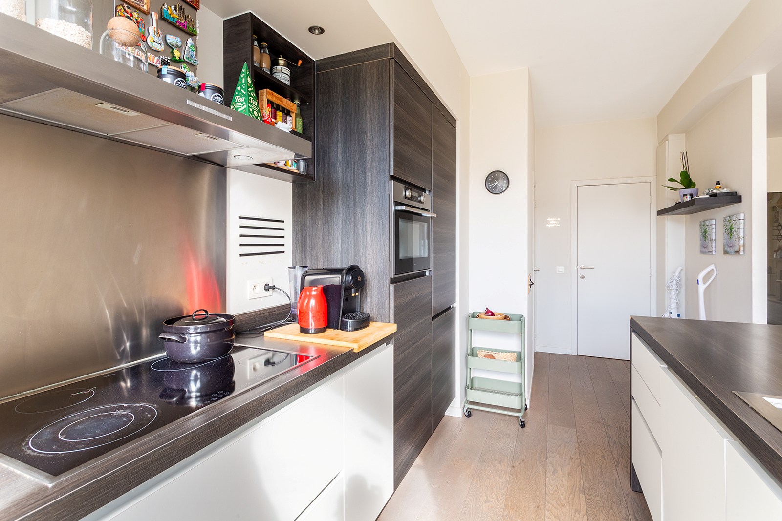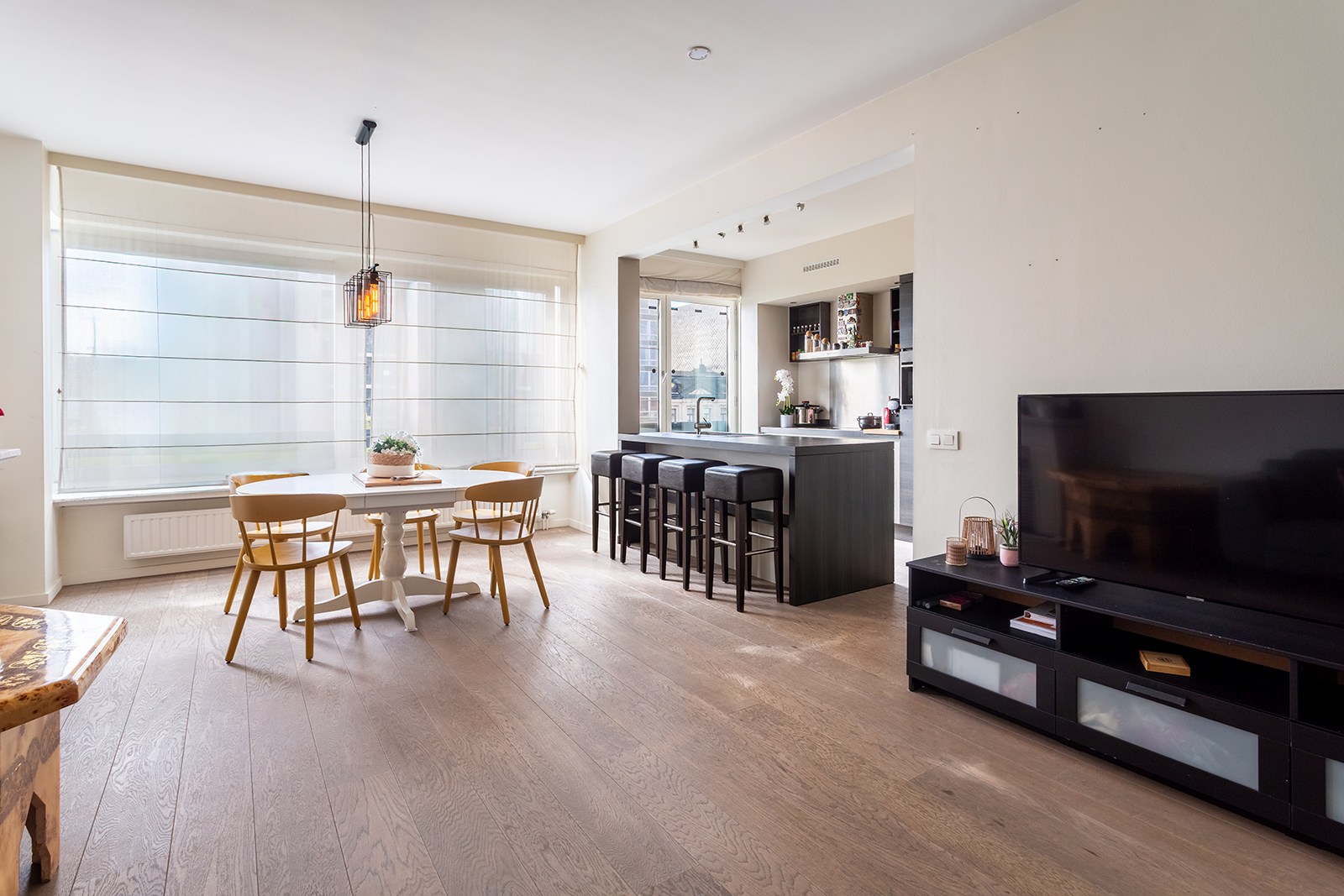 De mooie parketvloer, doorheen het appartement, verbindt de verschillende ruimtes en versterkt het warme en stijlvolle karakter van dit appartement.