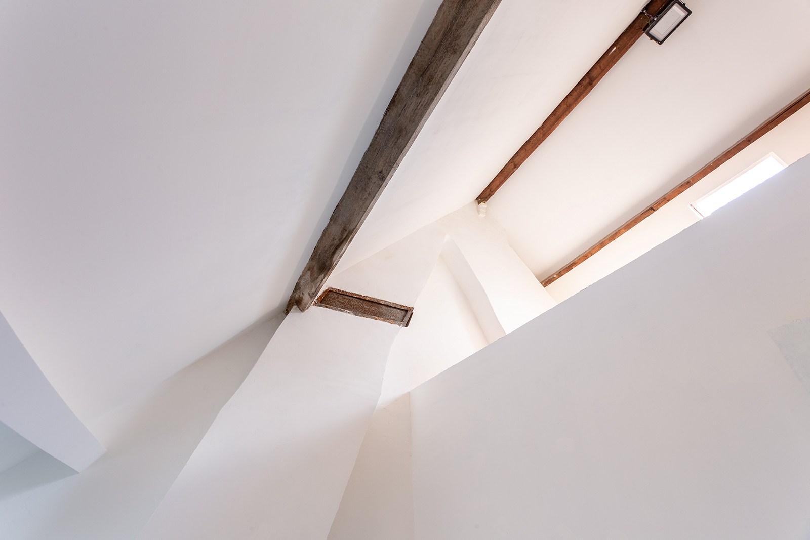 Bij binnenkomst via de inkomhal kom je rechts in de woonkamer, die achteraan aansluit op een ruime keuken en een aparte douchekamer met wastafel en toilet. Op de eerste verdieping bevinden zich twee slaapkamers en een ruime badkamer met ligbad, wastafel, tweede toilet en aansluitingen voor wasmachine en droogkast. Op de tweede verdieping en de zolderverdieping zijn telkens nog twee slaapkamers voorzien. Daarnaast beschikt de woning over een ruime kelder.