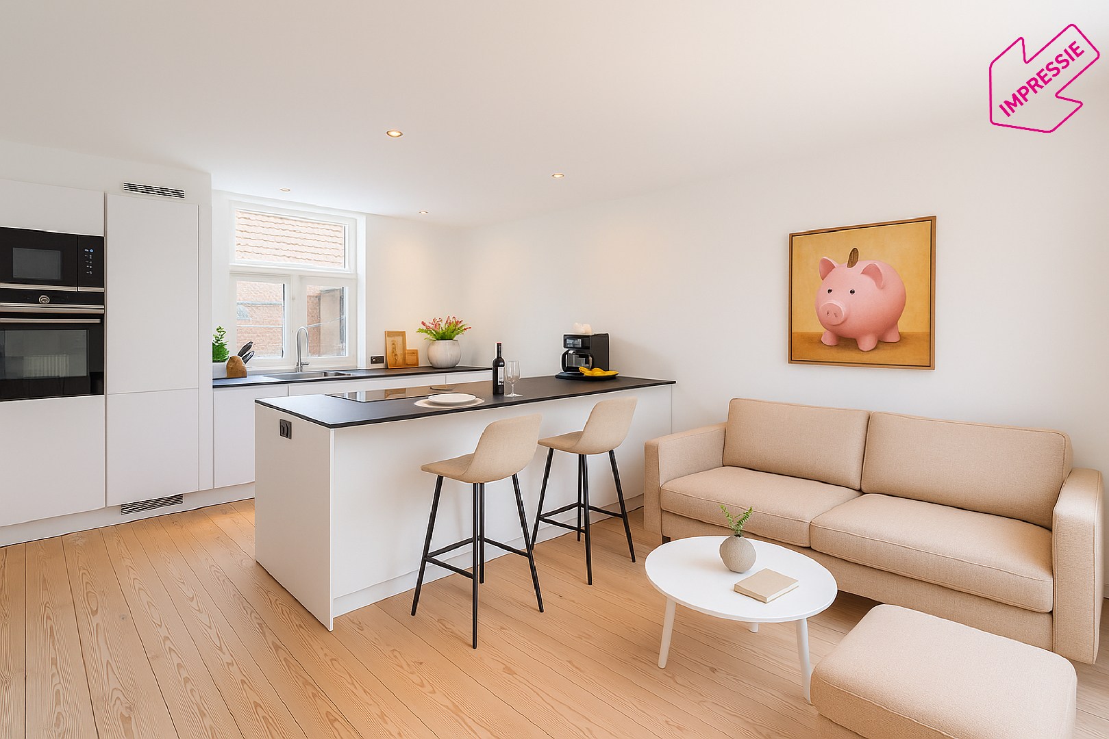 De gelijkvloerse verdieping omvat een ruime slaapkamer, een luxueuze badkamer met grote inloopdouche, een afzonderlijk toilet en een praktische berging met technische ruimte. Op de eerste verdieping vind je de moderne keuken met groot kookeiland, volledig uitgerust met inbouwtoestellen, en een gezellige eetruimte. De bovenste verdieping biedt de mogelijkheid om in te richten als woonkamer of als grote masterbedroom onder het dak – beide opties zorgen voor een knusse, warme sfeer.