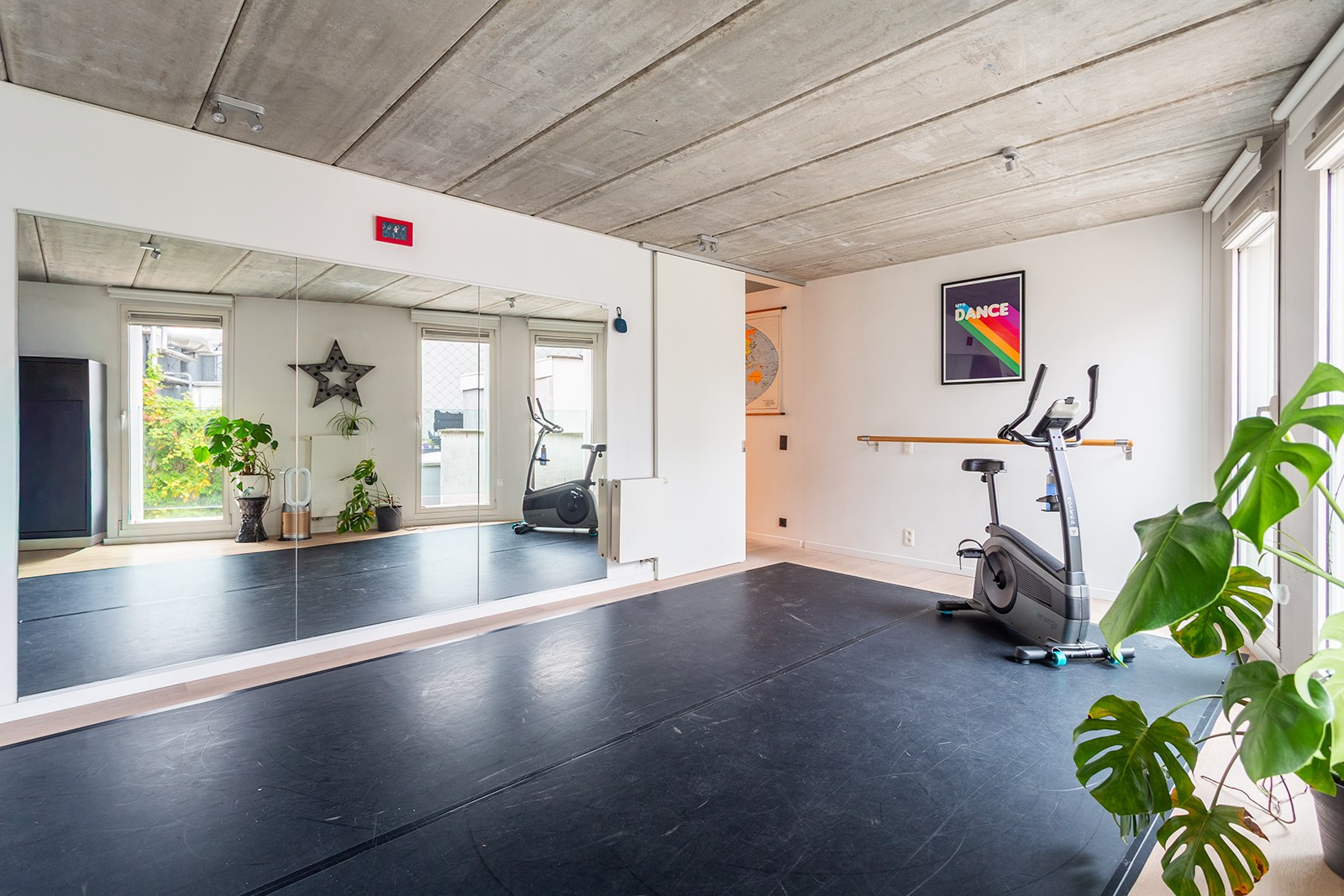 Er is momenteel één ruime masterbedroom en een grote tweede ruimte die nu dienstdoet als dansstudio, maar eenvoudig opnieuw kan worden opgesplitst in twee aparte slaapkamers, zoals oorspronkelijk voorzien. Zo biedt het appartement de mogelijkheid tot drie volwaardige slaapkamers.