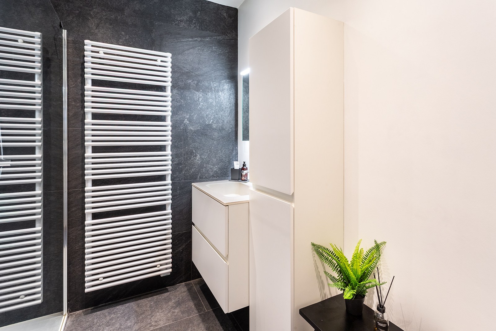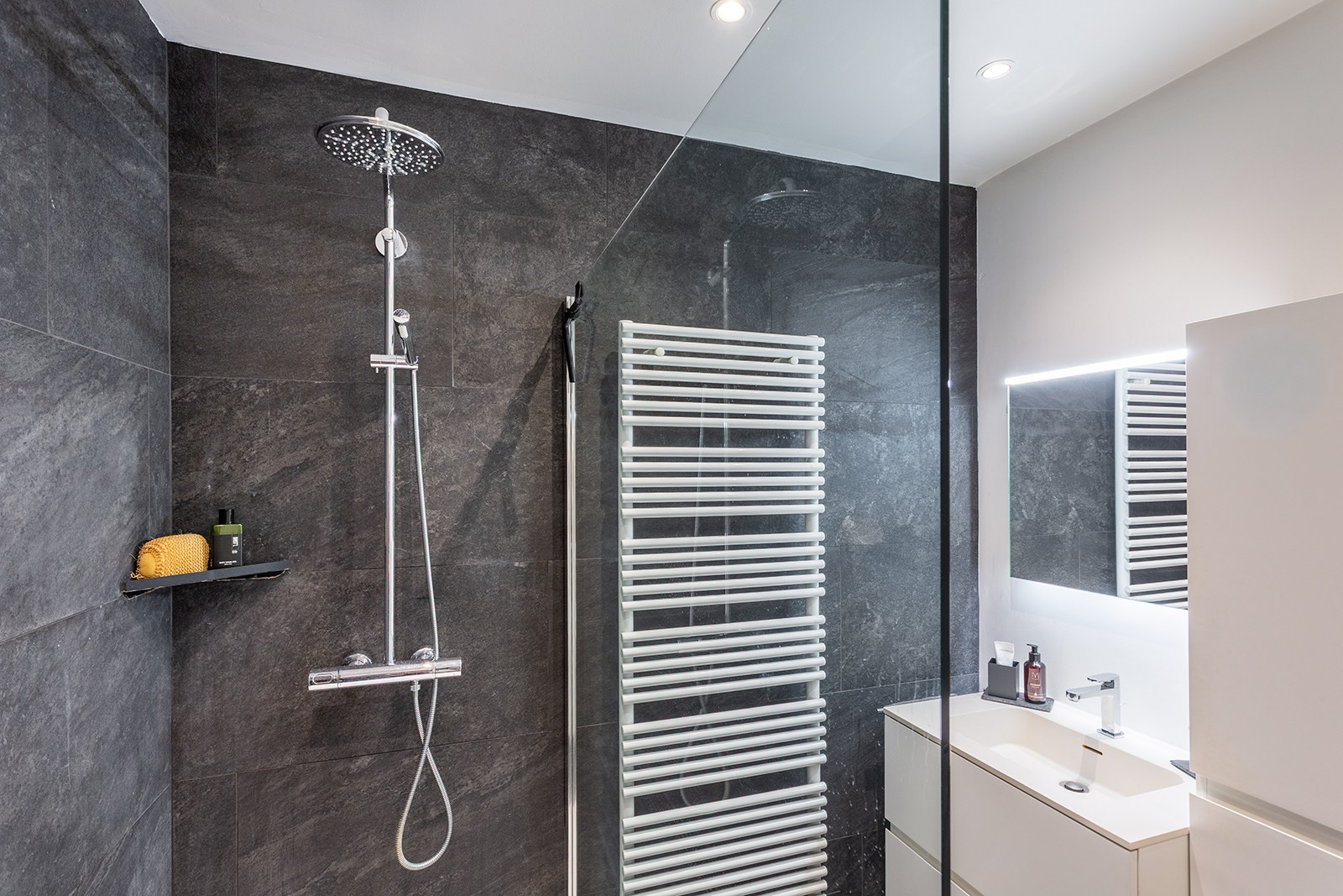Verder beschikt het appartement over een apart gastentoilet en een recent gerenoveerde badkamer met inloopdouche en lavabo.