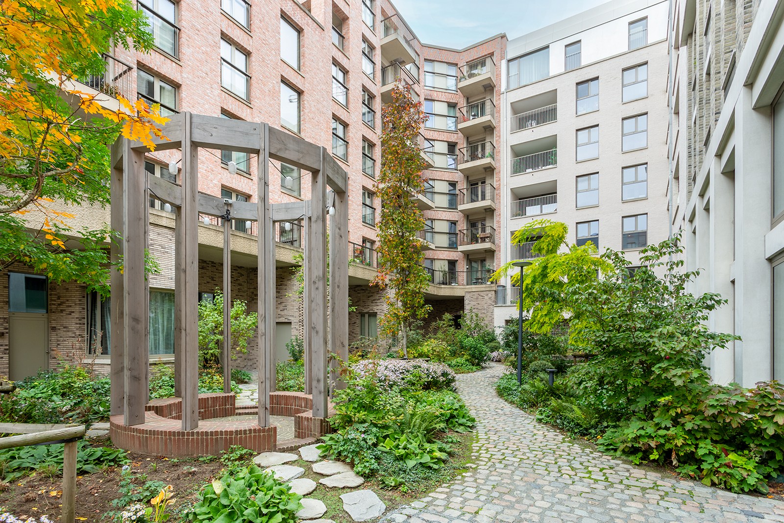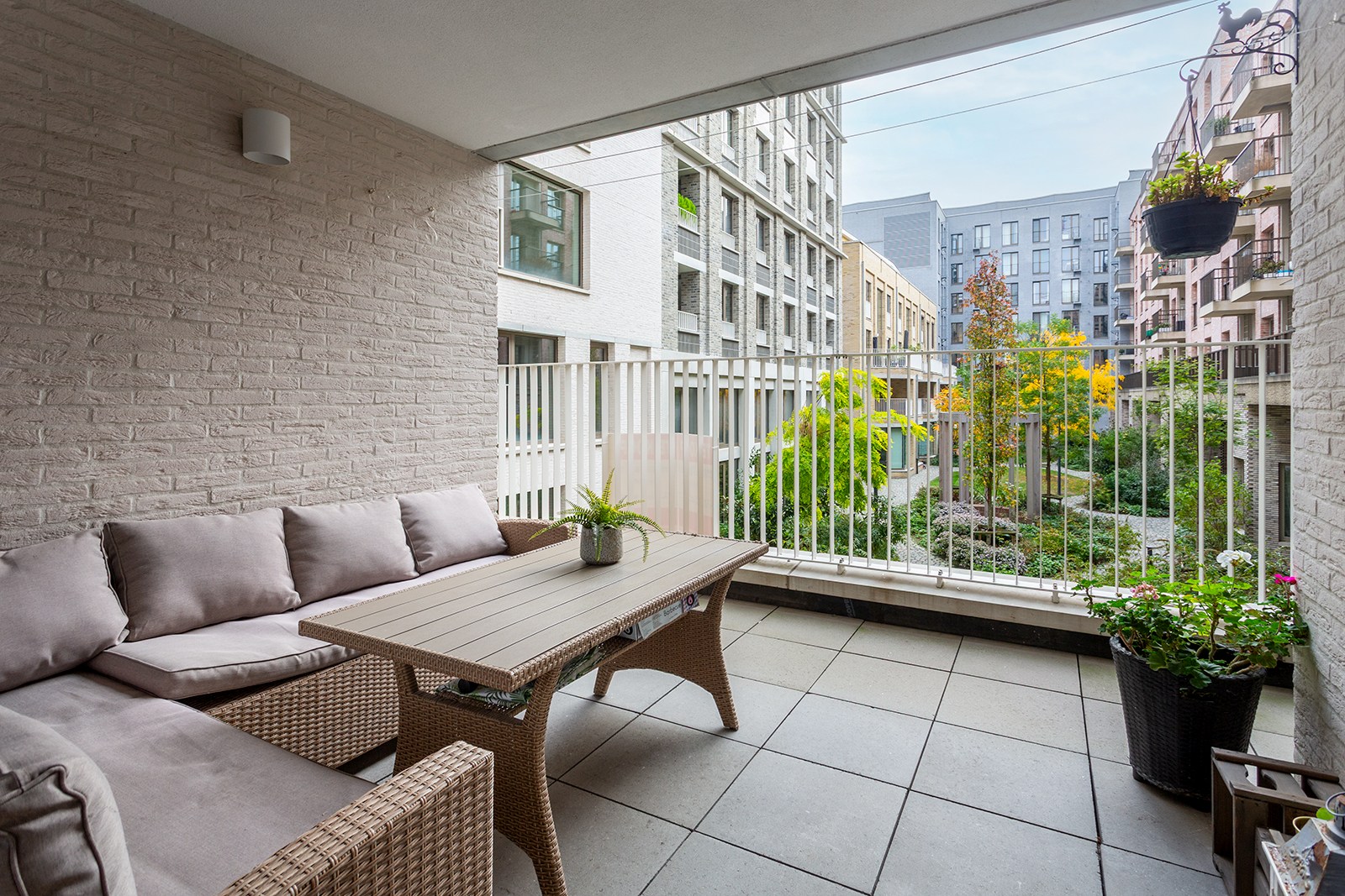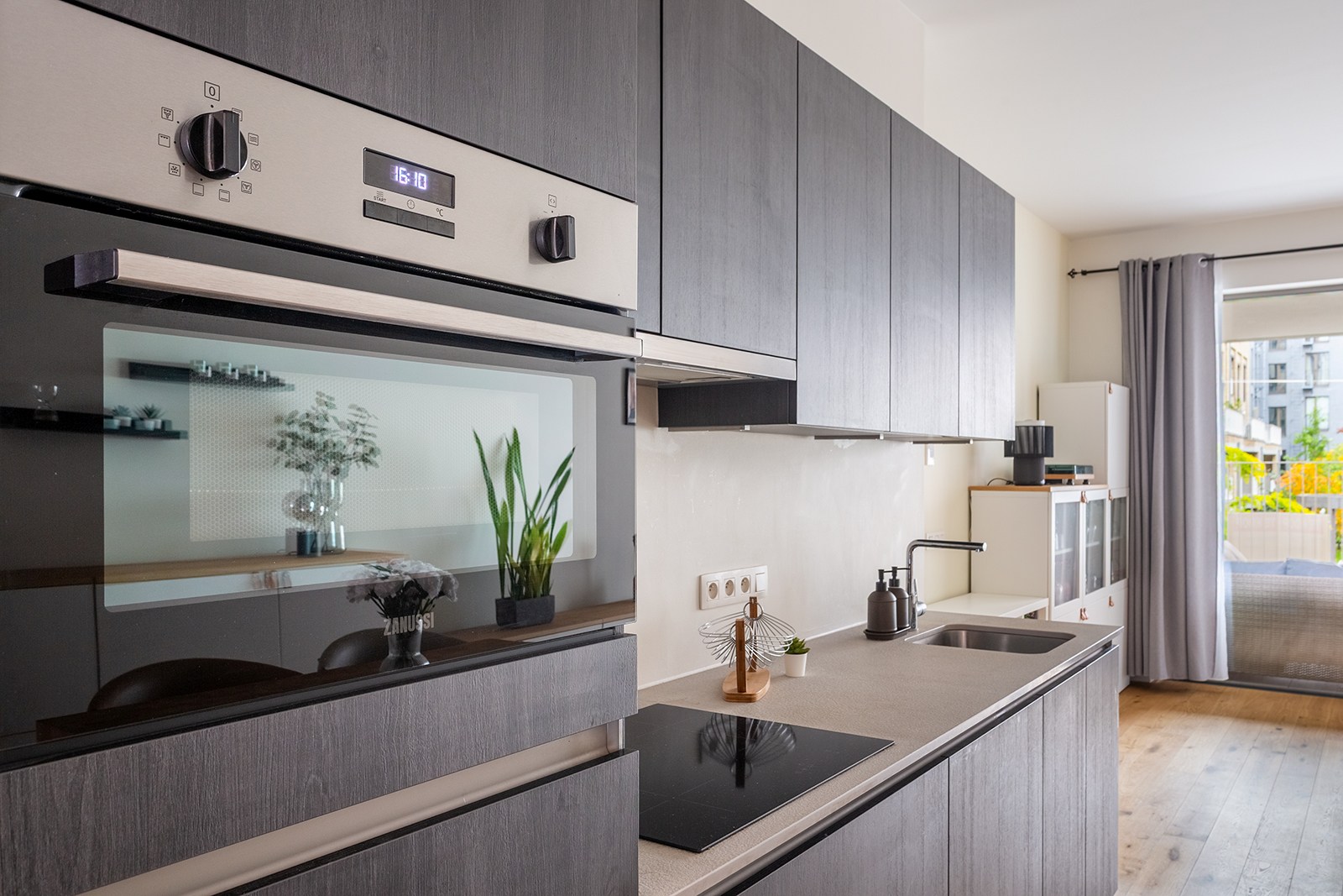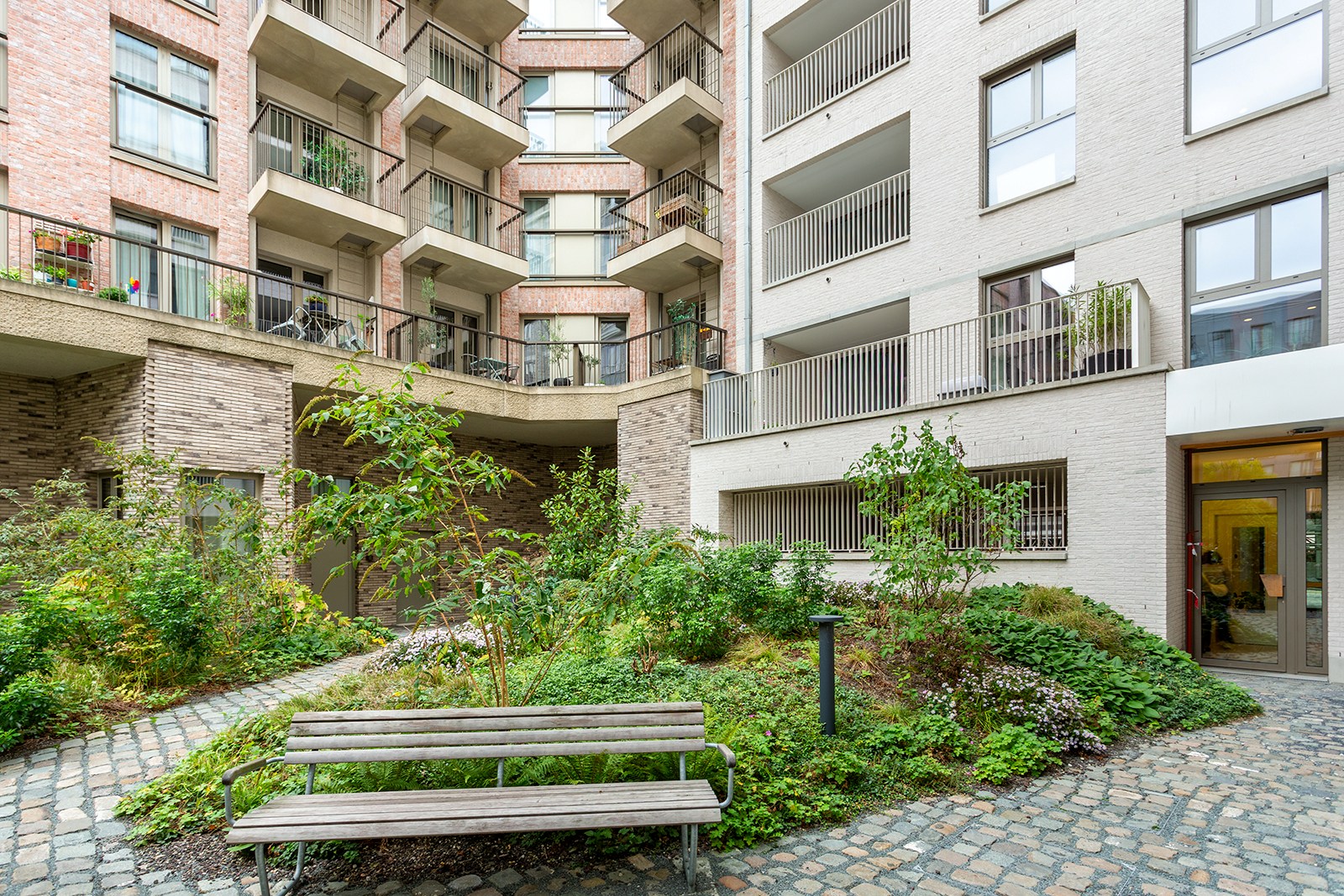 De volledig uitgeruste open keuken vormt samen met de eetruimte een uitnodigende plek om te koken, bij te praten en te genieten. Via de grote schuiframen stap je zo het zonnige terras van 14,4 m² op, met een mooi uitzicht over de groene, gemeenschappelijke binnentuin. Een echte meerwaarde in het hart van de stad.
