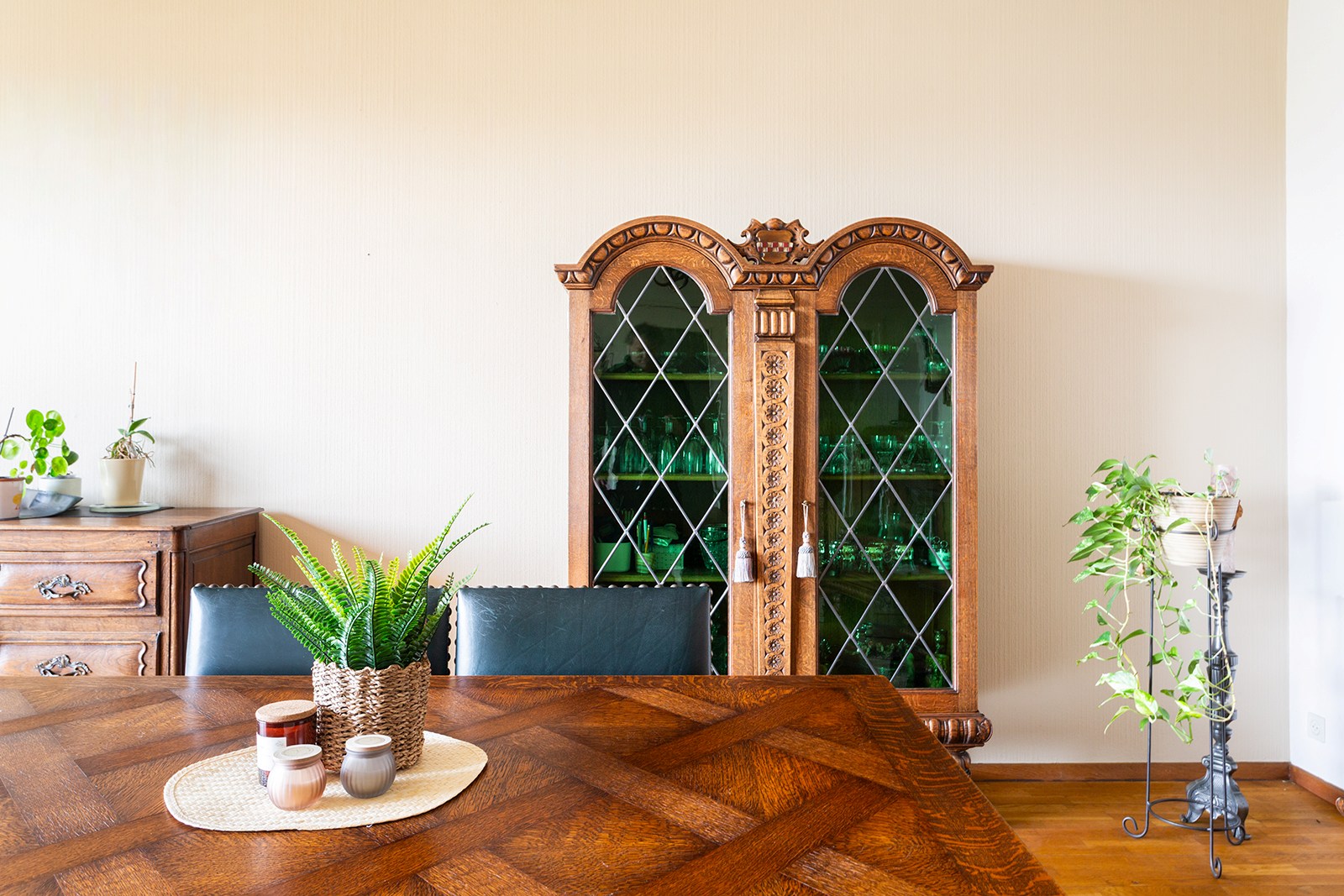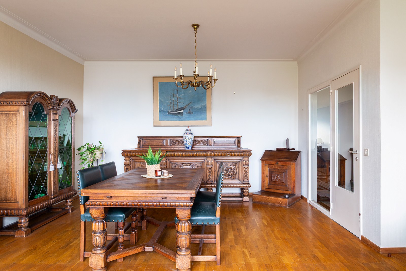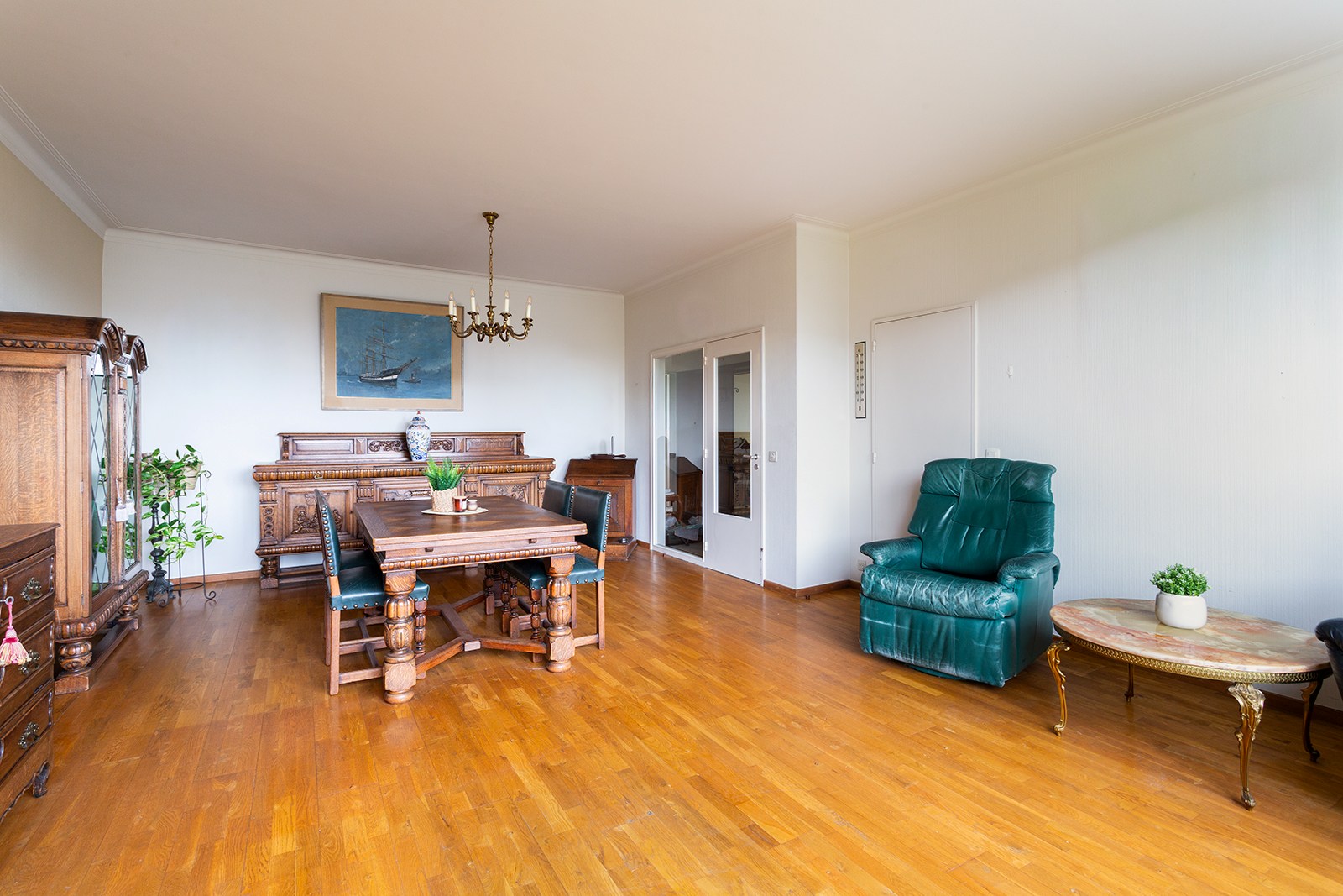 Het appartement biedt een ruime en lichtrijke leef- en eetkamer op parketvloer, wat zorgt voor een warme en gezellige sfeer. Grote ramen laten veel natuurlijk licht binnen en creëren een aangenaam gevoel van openheid.