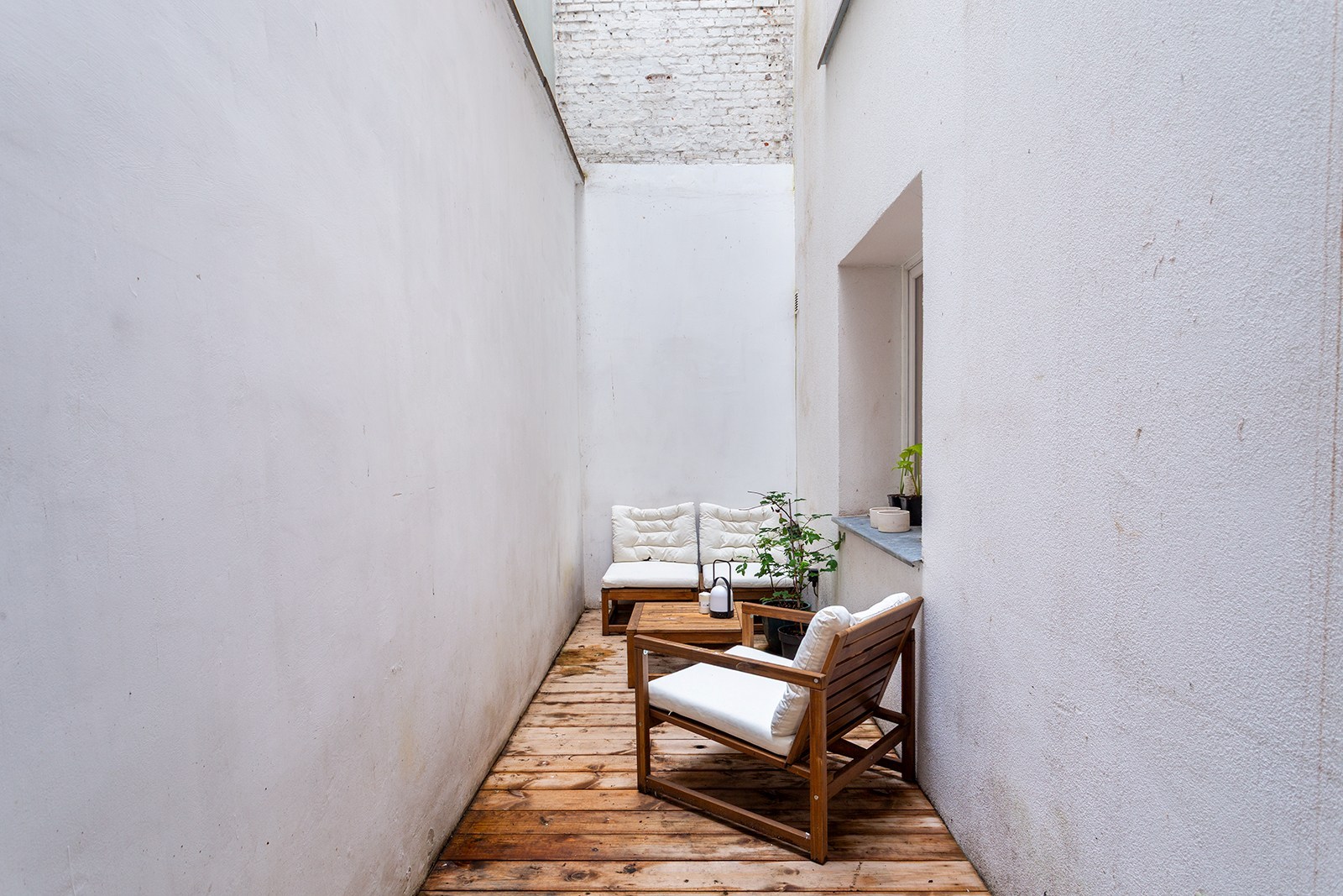 Dit instapklare gelijkvloers duplexappartement van 105 m² werd in 2022 volledig gerenoveerd en combineert moderne afwerking met een cosy sfeer. Het bevindt zich in een kleinschalig gebouw met slechts 4 appartementen. Op het gelijkvloers betreed je de woning via een inkomhal die toegang geeft tot links de vernieuwde, volledig ingerichte keuken en rechts de gezellige, lichtrijke woonkamer met grote ramen. Vanuit de woonkamer stap je zo op het charmante terras (10m²). Aansluitend bevindt zich een extra kamer, momenteel ingericht als bureau, van waaruit een trap naar de bovenverdieping leidt. Op de eerste verdieping vind je een knusse slaapkamer, gevolgd door een halve verdieping hoger waar zich de stijlvolle badkamer met regendouche, een apart toilet, een praktische wasruimte en de royale master bedroom bevinden. Verder beschikt het appartement over extra bergruimte in de kelder. Kortom, ideaal voor alleenstaanden, koppels en gezinnetjes!
