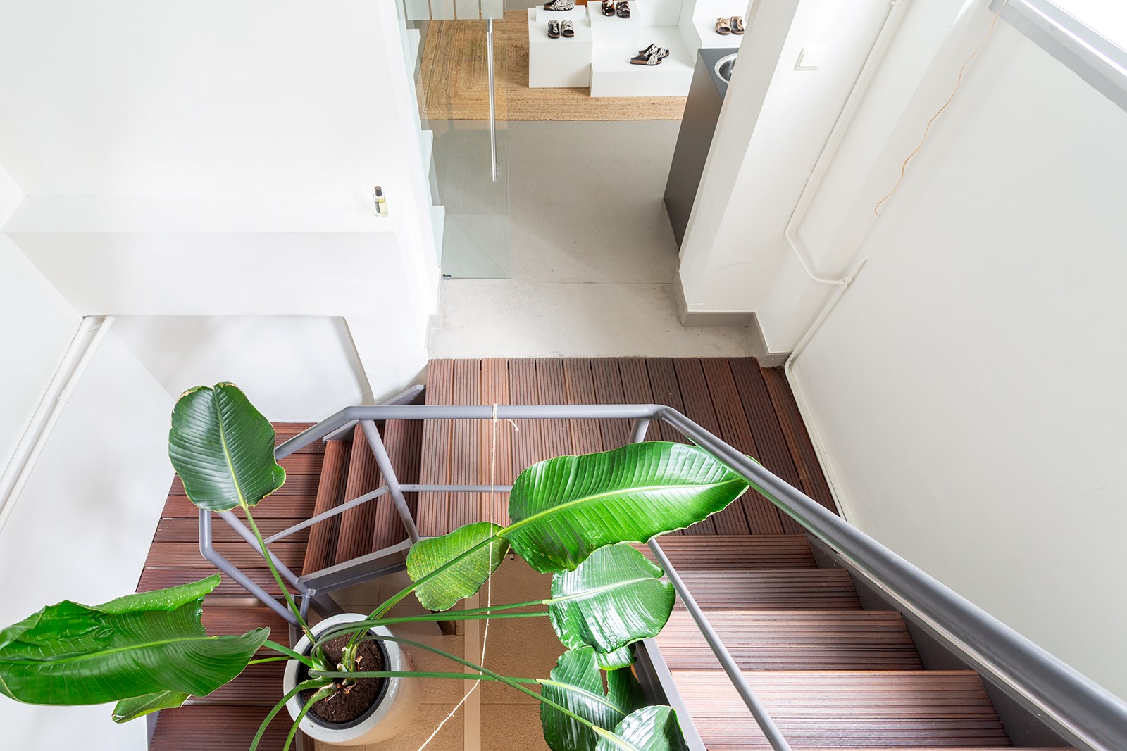 Loft 2 (192m²): We komen het loftencomplex binnen via deze loft. We komen in een grote ruimte op het gelijkvloers. Deze geeft aan de linkerkant toegang naar loft 1 en aan de rechterzijde naar loft 3. Met de trap bereiken we de 1e verdieping, een prachtige lichte ruimte met hoge plafonds en vele raampartijen.