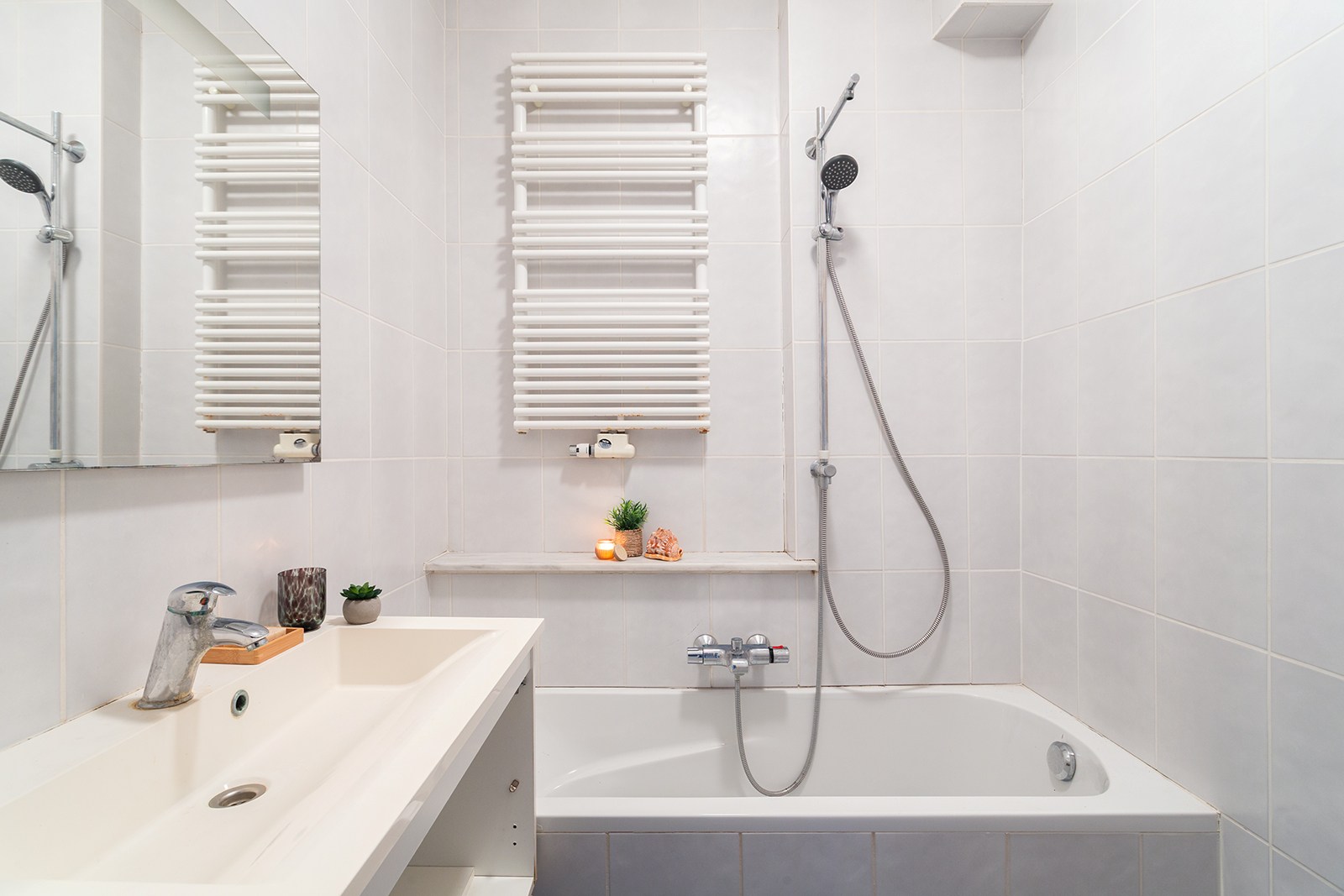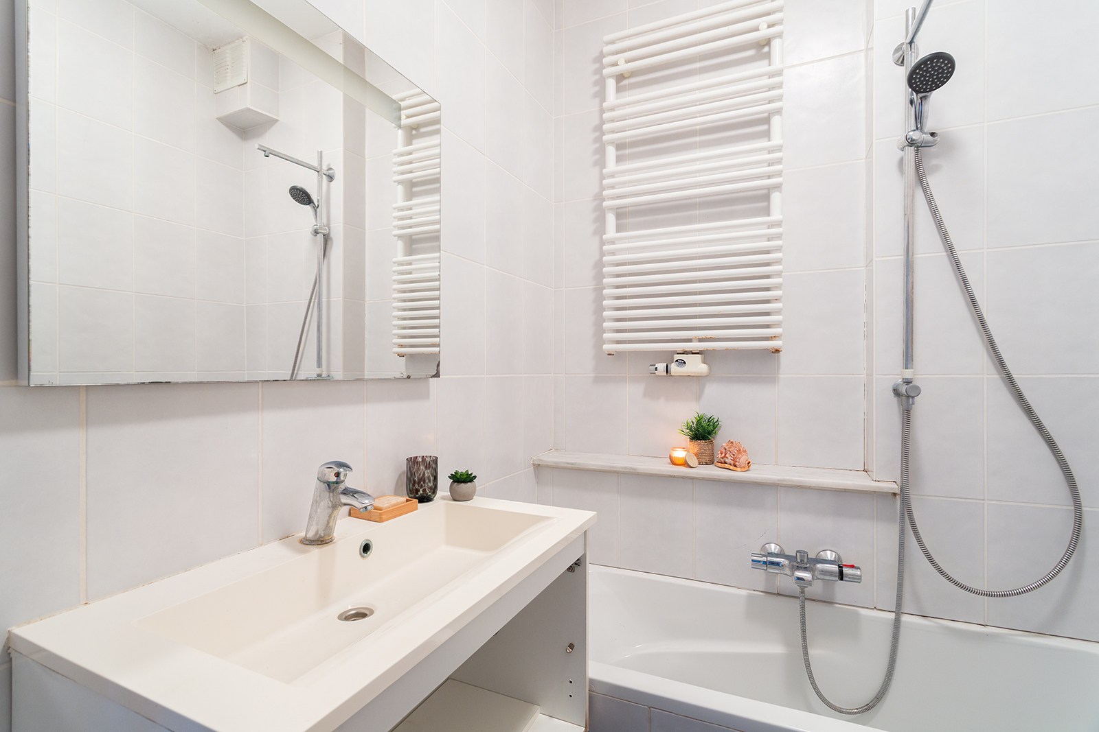 De badkamer is netjes onderhouden en uitgerust met een ligbad met douchefunctie, lavabo en extra opbergruimte. Verder is er een private berging aanwezig,.