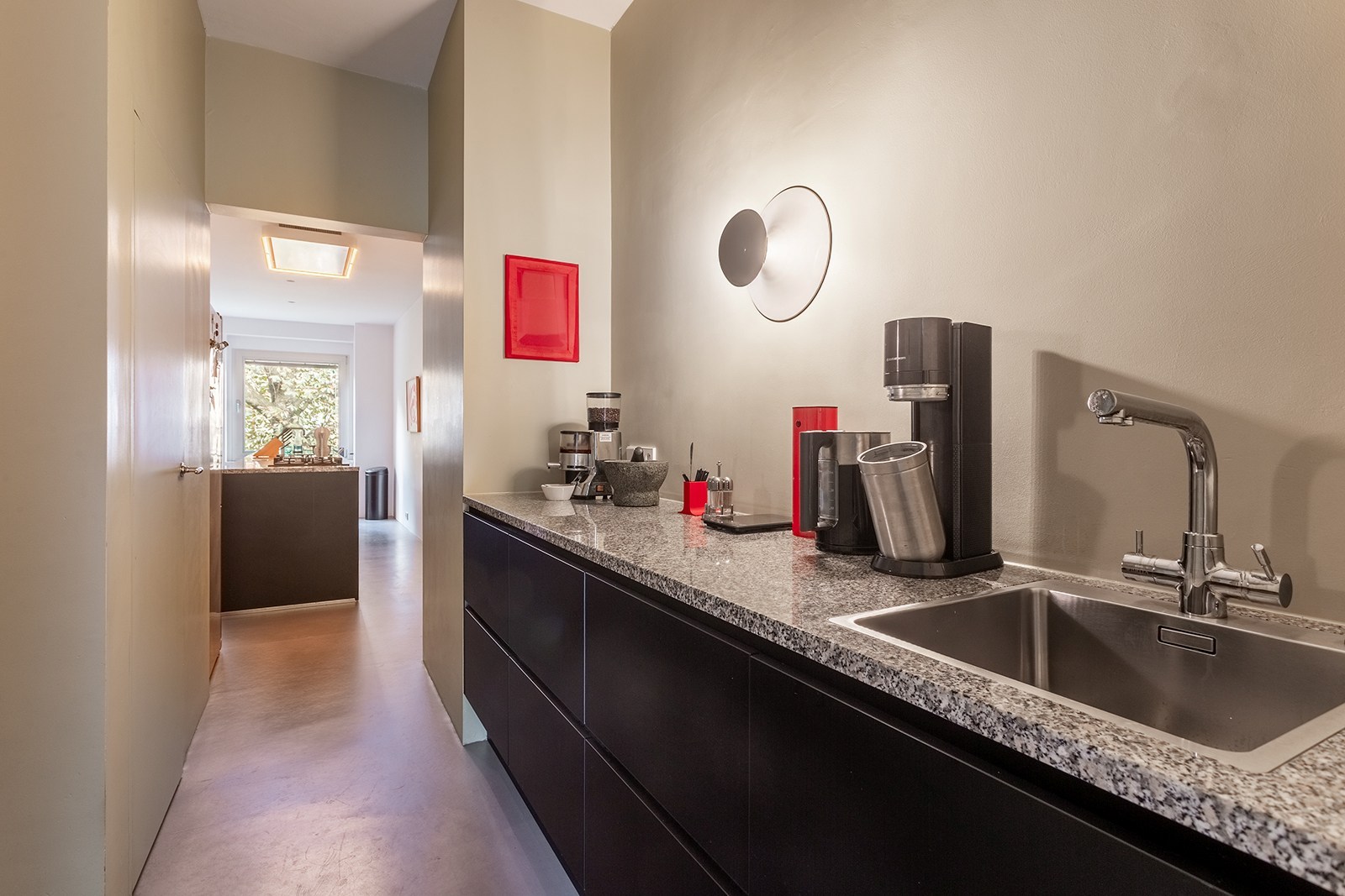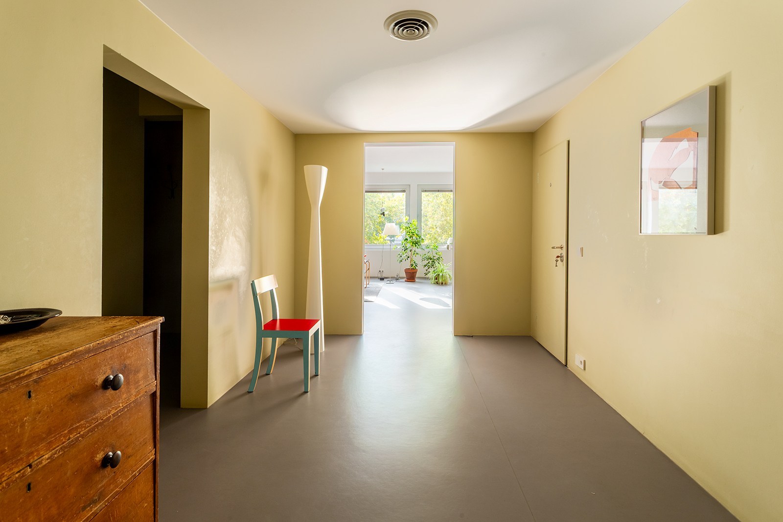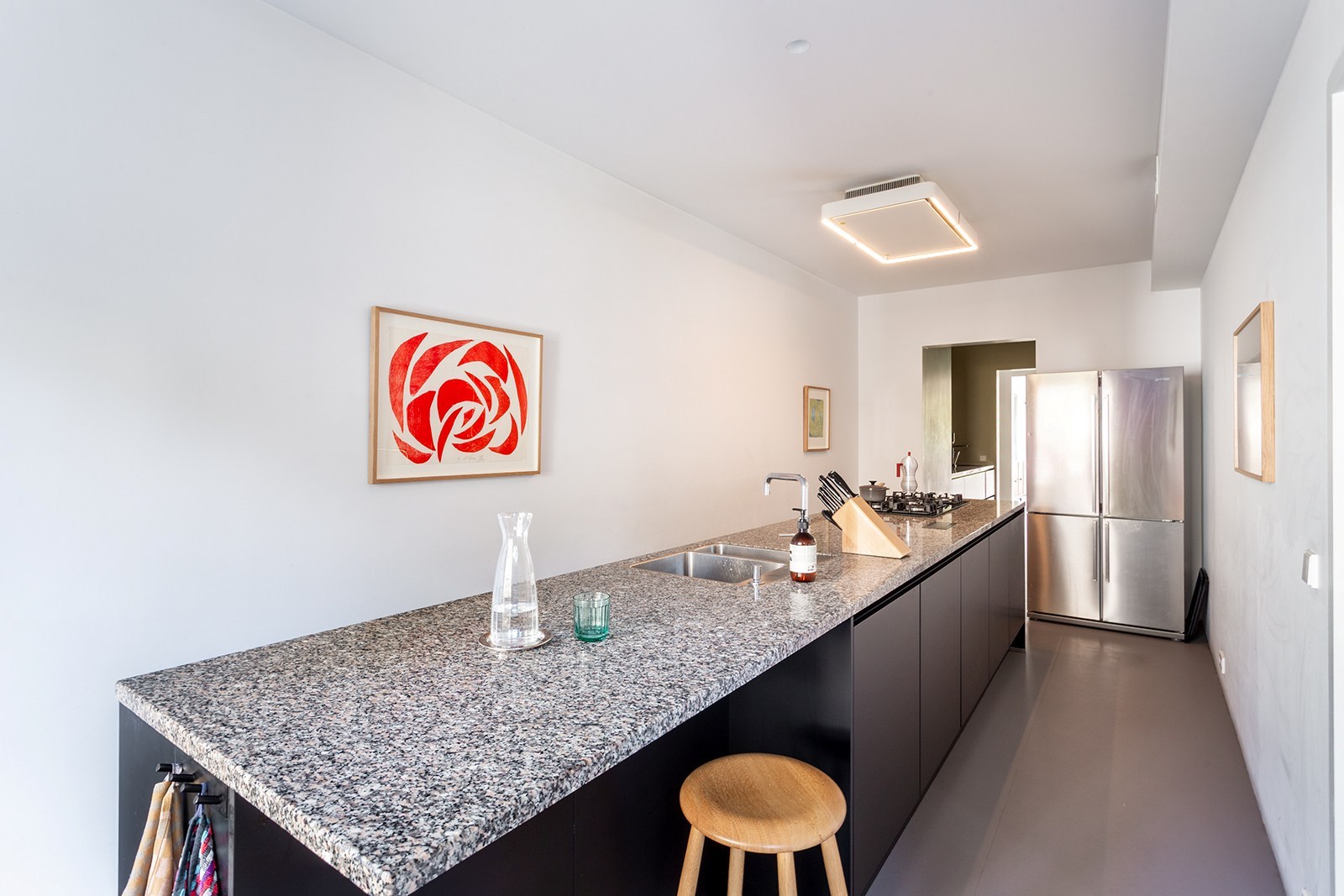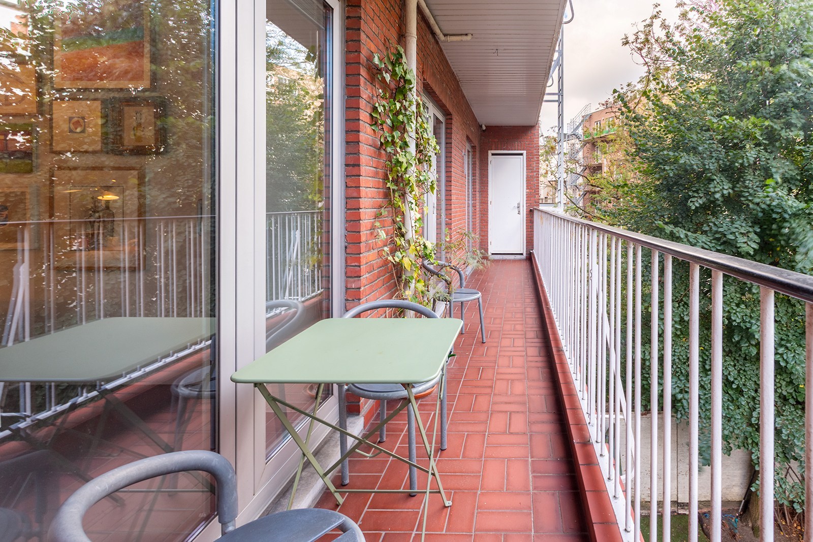 Dit appartement op de 2de verdieping onderging in 2018 een hoogwaardige renovatie onder architectuur van Wim De Vos. De focus lag op ‘licht, verbindingen en doorkijken’. Grote raampartijen, visuele doorzichten en een harmonieuze materiaalkeuze zorgen voor een gevoel van continuïteit en rust. De weloverwogen architecturale keuzes brengen samenhang en sereniteit: marmoleumvloeren die doorheen het hele appartement doorlopen, strategisch geplaatste openingen die zicht bieden van voor tot achter, en subtiele kleurnuances die meespelen met het natuurlijke daglicht.