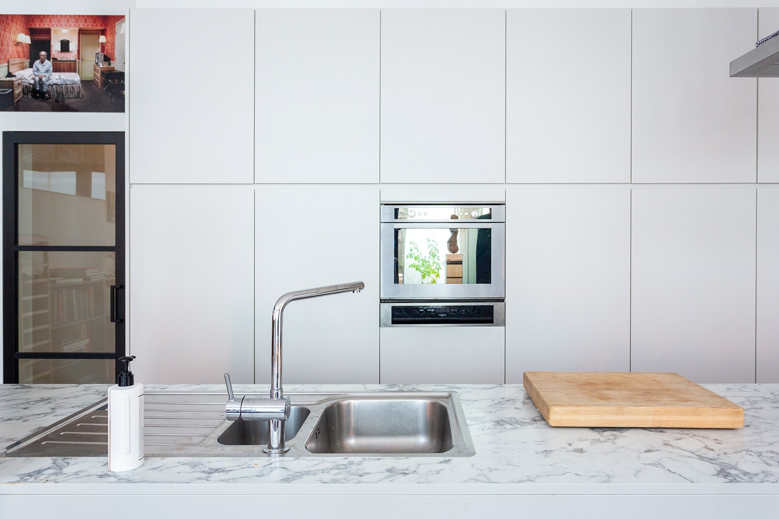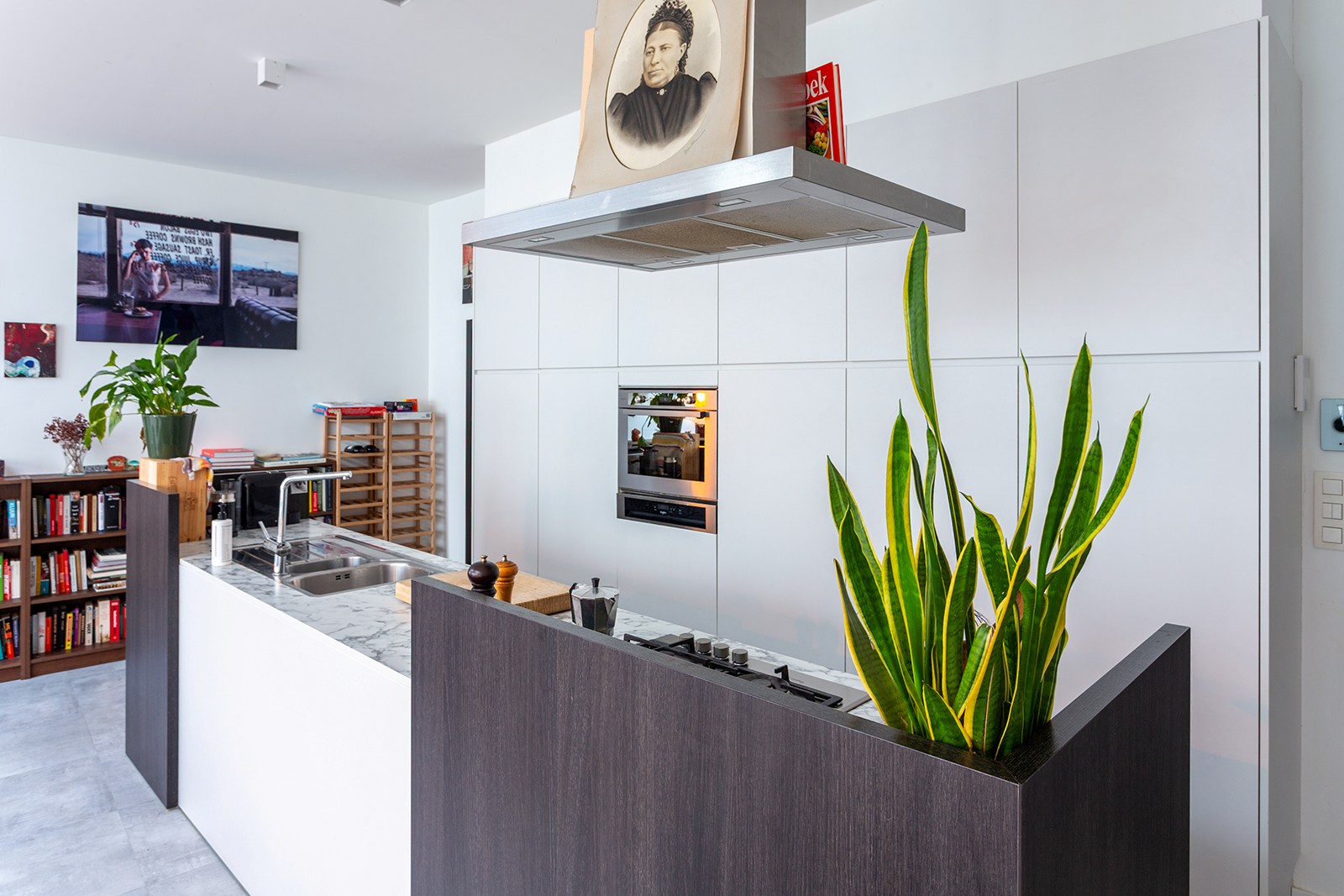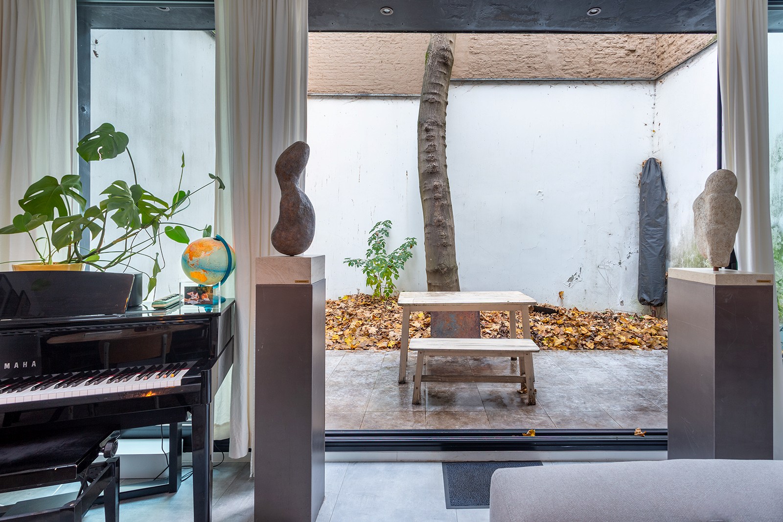 De open leefruimte met open leefkeuken biedt meer dan voldoende ruimte om een leuke zetel en toffe eetkamer te installeren. Via de grote schuiframen bereik je de charmante stadskoer. Een fijne extra troef midden in de stad.