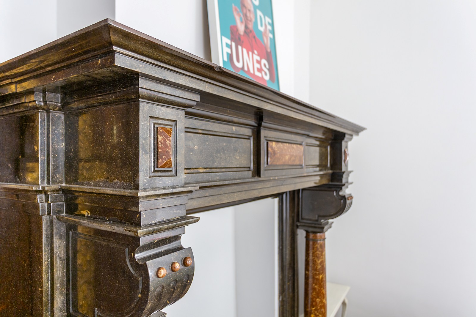 Het appartement valt op door zijn hoge plafonds, grote ramen en lichtkoepels, die zorgen voor een zachte, natuurlijke lichtinval. Authentieke elementen zoals de moulures aan het plafond en de originele schouw maken het plaatje compleet.