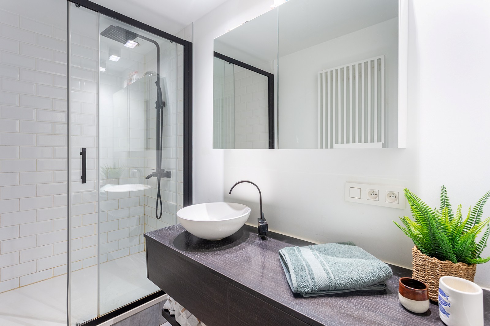 De badkamer is modern afgewerkt en voorzien van een ruime douche en wastafel (het toilet is apart).