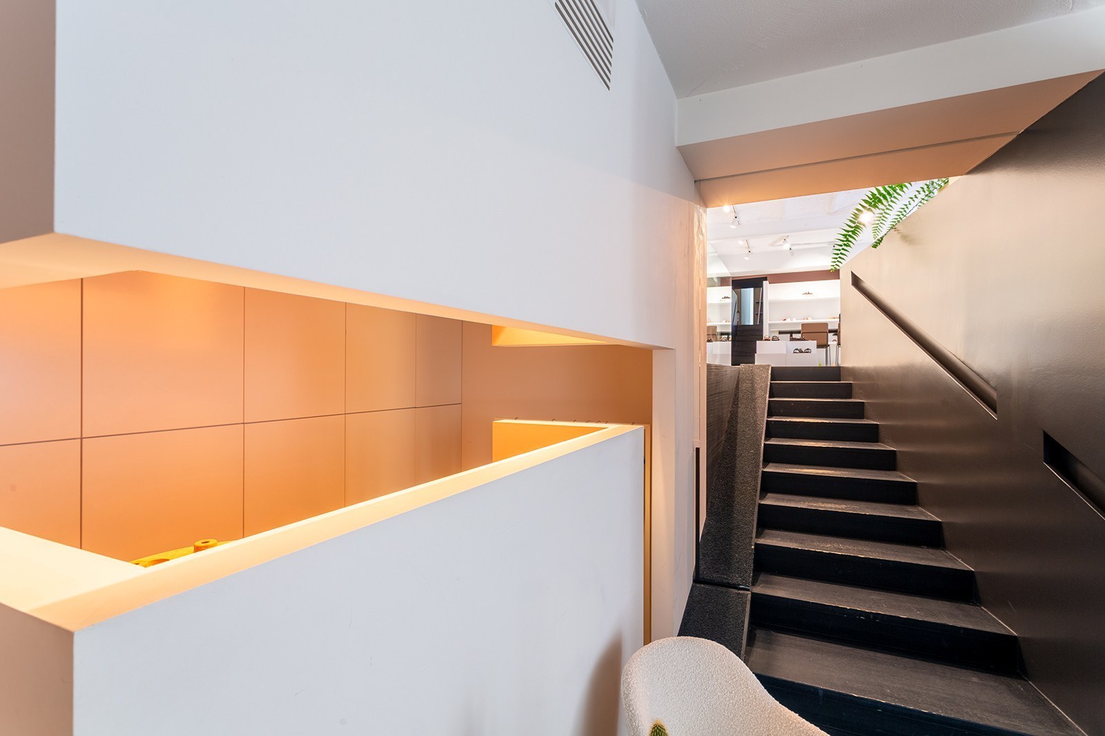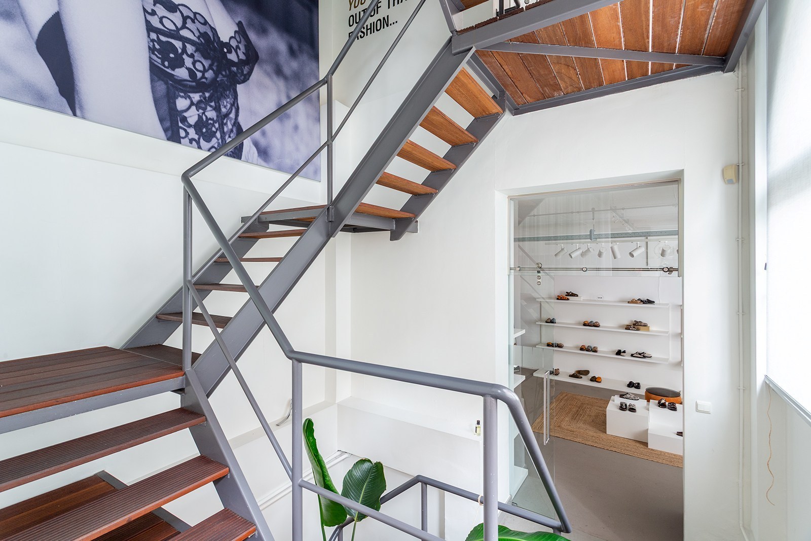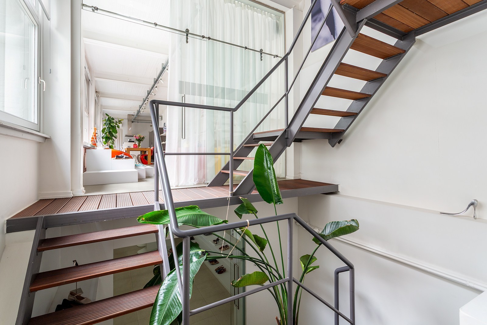 Loft 2 (192m²): We komen het loftencomplex binnen via deze loft. We komen in een grote ruimte op het gelijkvloers. Deze geeft aan de linkerkant toegang naar loft 1 en aan de rechterzijde naar loft 3. Met de trap bereiken we de 1e verdieping, een prachtige lichte ruimte met hoge plafonds en vele raampartijen.