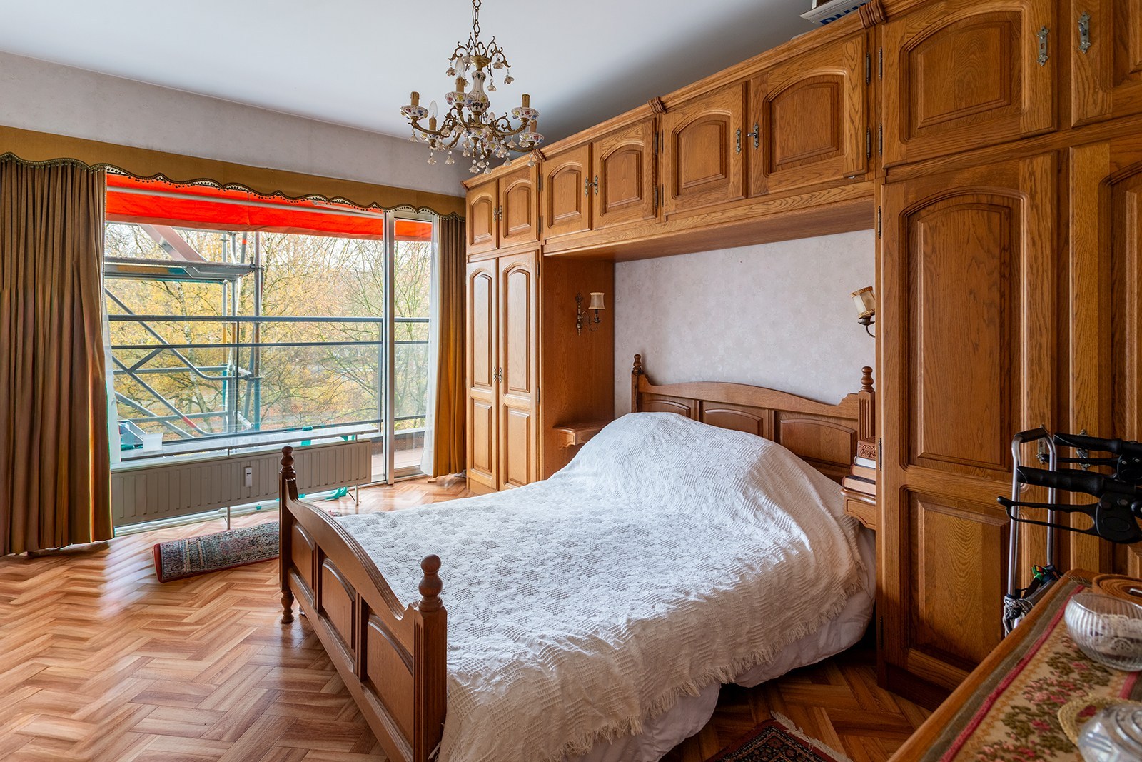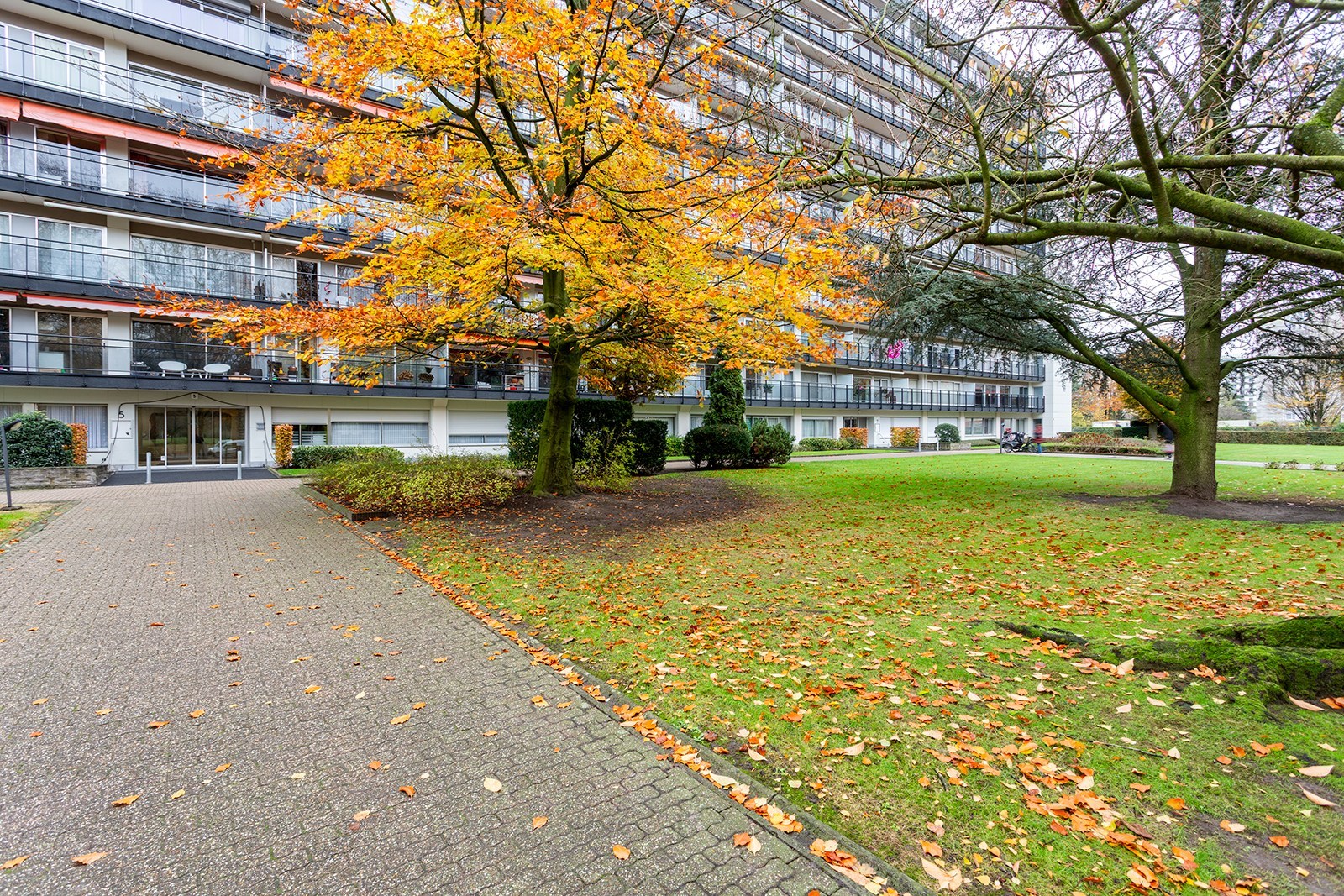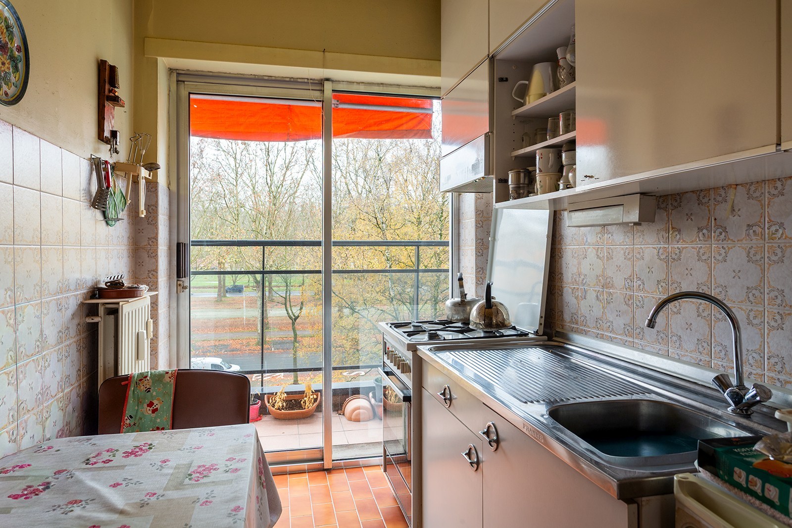 De leefruimte is afgewerkt met een parketvloer en geniet dankzij de grote ramen van veel lichtinval. Via de eetkamer en keuken kan je het ruime terras bereiken aan de voorzijde van het gebouw. De keuken sluit functioneel aan op de leefruimte en is voorzien van een tegelvloer.
