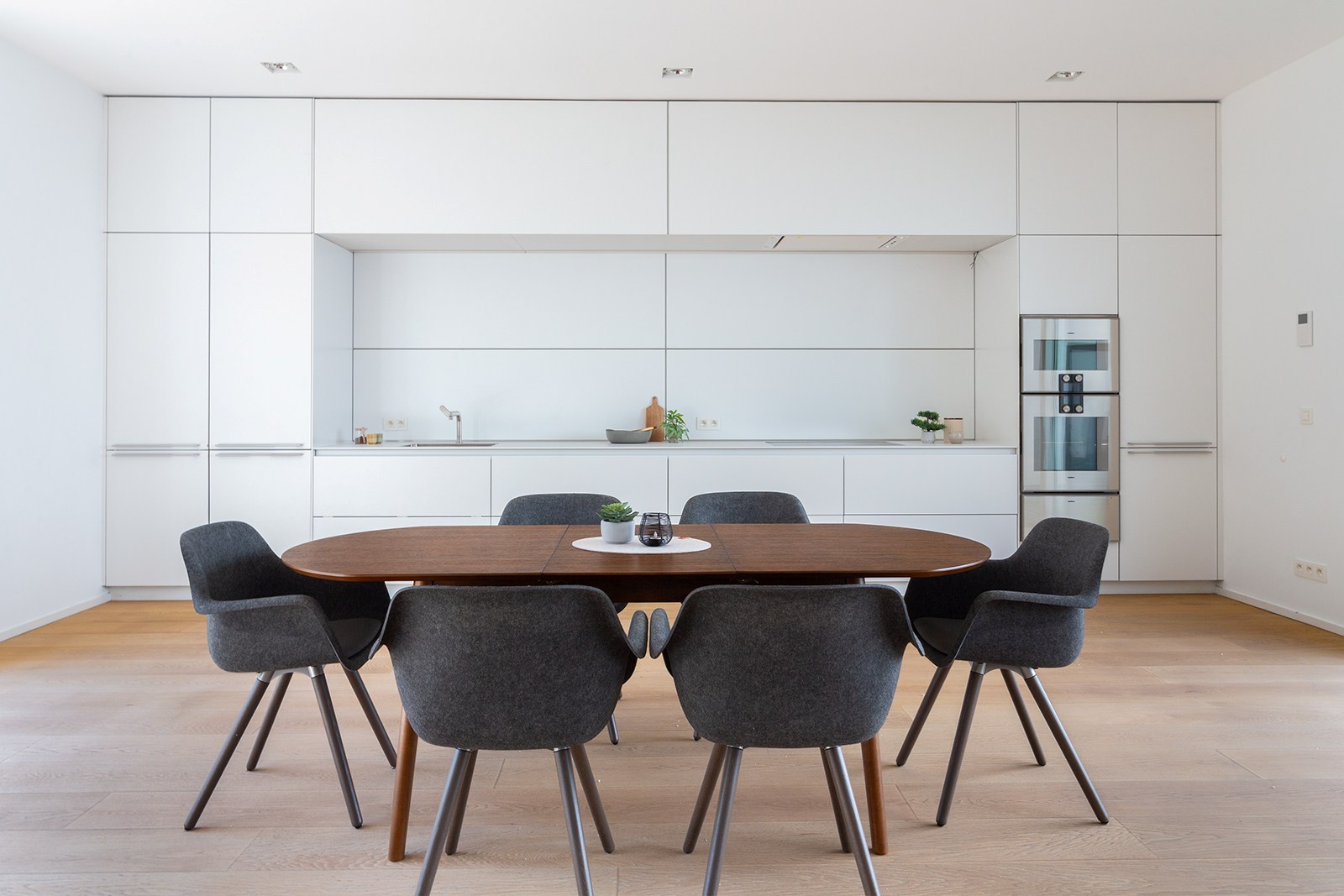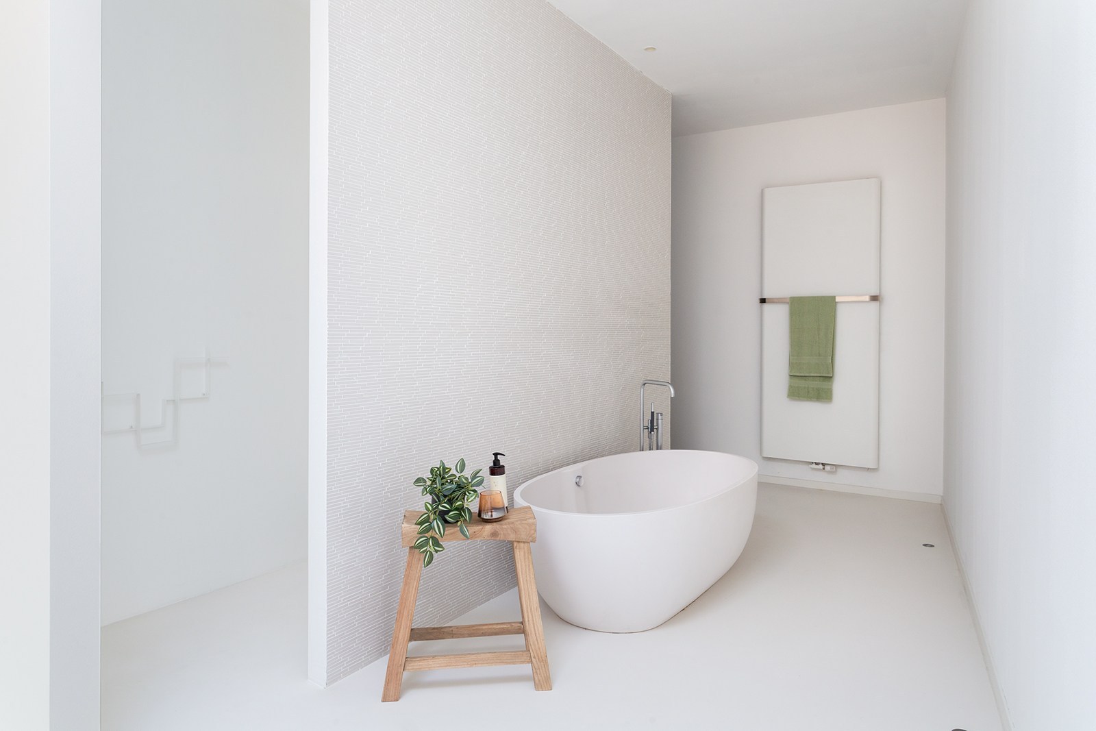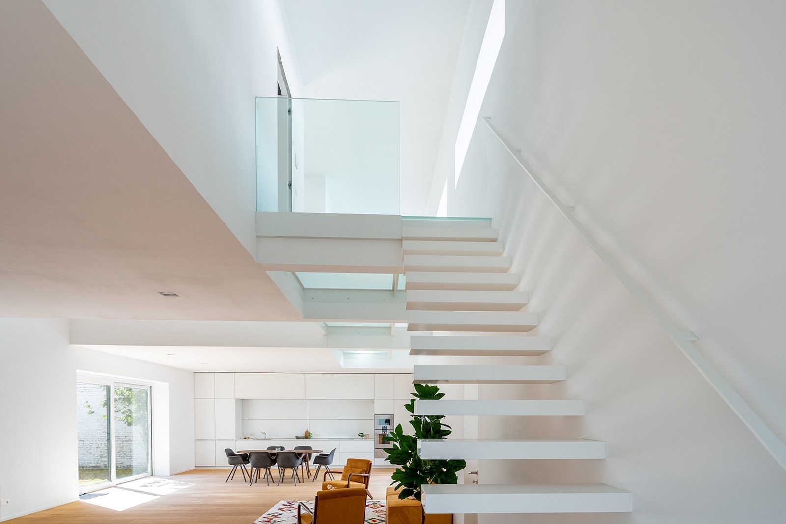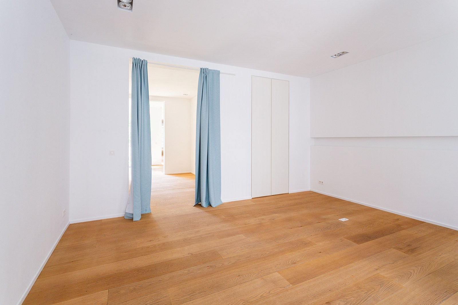 Een trap leidt naar de eerste verdieping, waar zich een ruime masterslaapkamer met dressing en een tweede slaapkamer bevinden. De badkamer is uitgerust met Vola-kraanwerk en omvat een inloopdouche, designbad, toilet en dubbele wastafel.