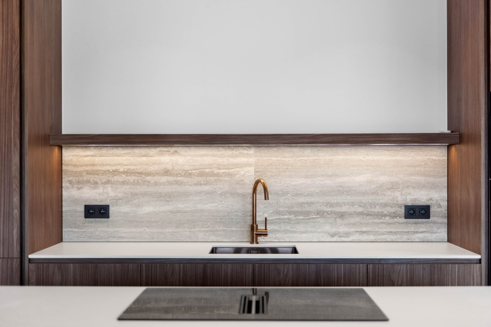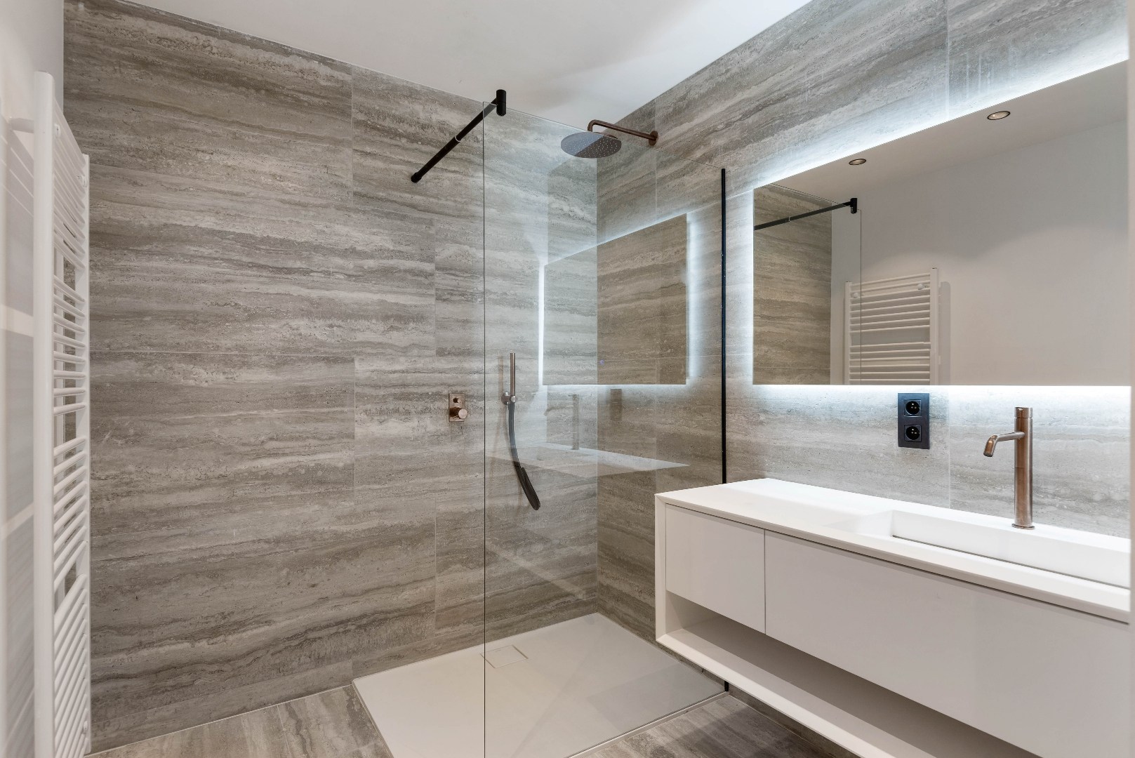 • Badkamers met travertin tegels en ruime inloopdouches.