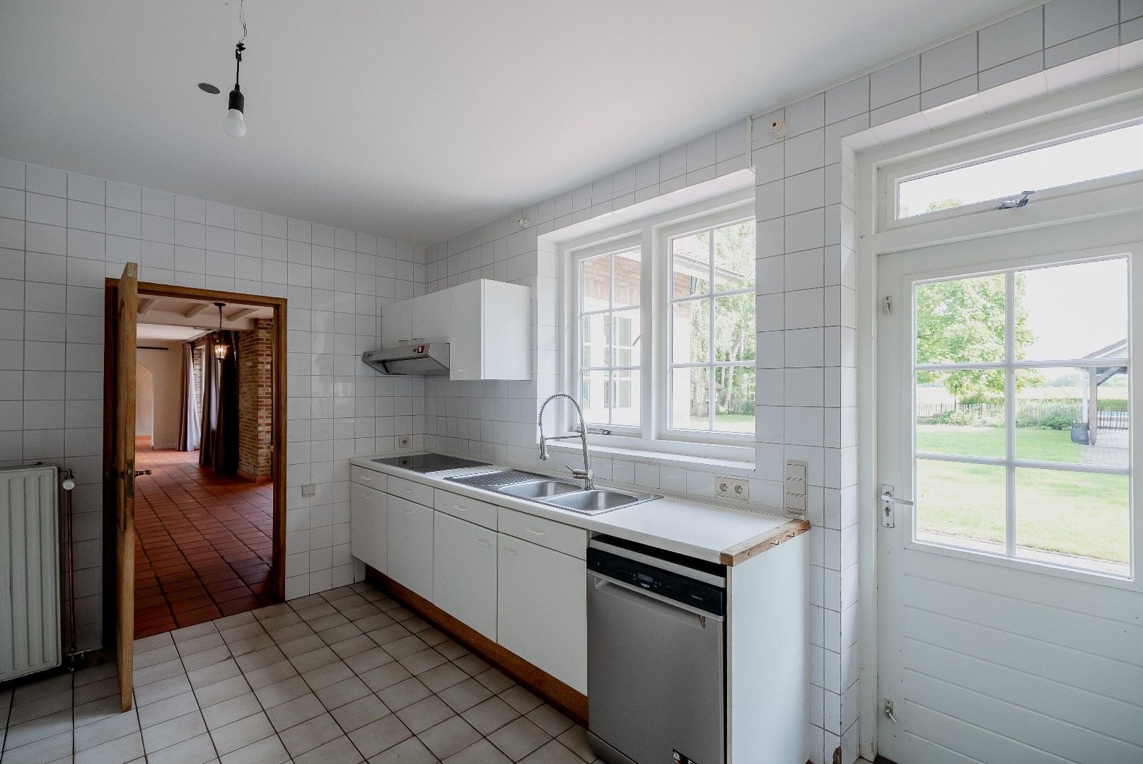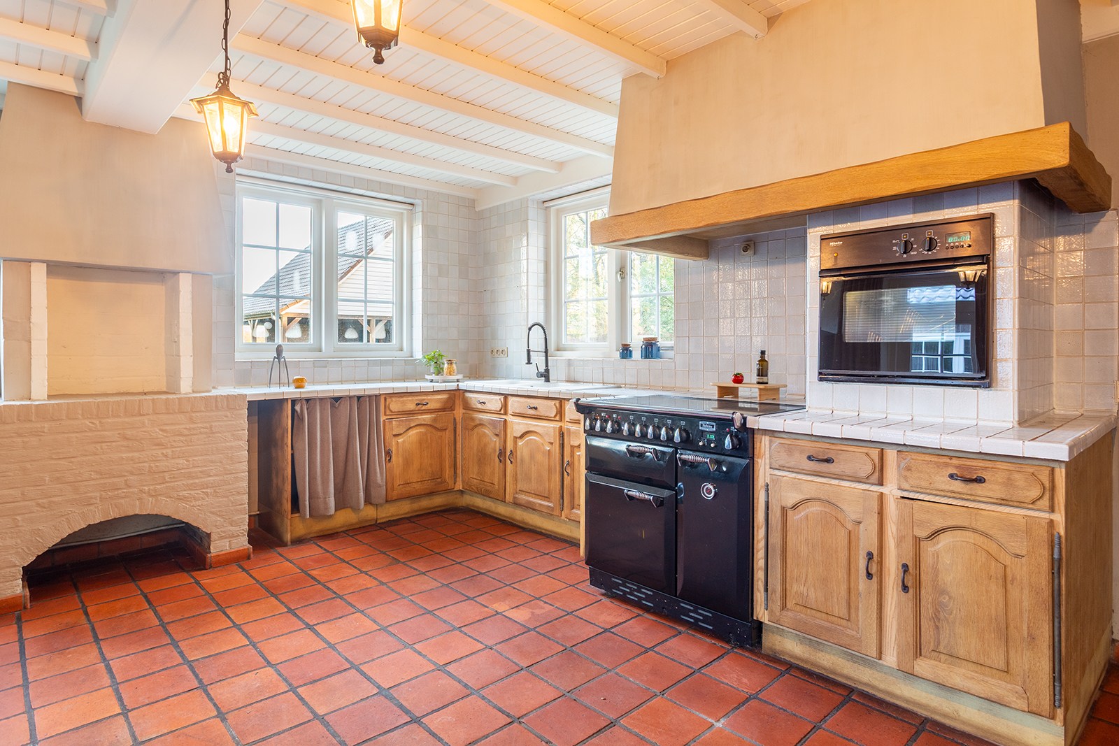 De open keuken van ca. 25 m² kijkt uit op de tuin en het zwembad, zodat je tijdens het koken altijd mee bent met wat er buiten gebeurt. Achter de keuken ligt een royale bijkeuken van ca. 25 m² met extra bergruimte, én een grote koelcel, ideaal voor wie graag organiseert, kookt of vaak gasten ontvangt.