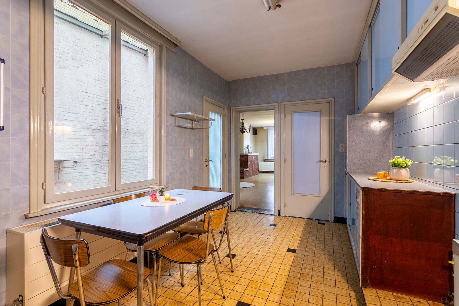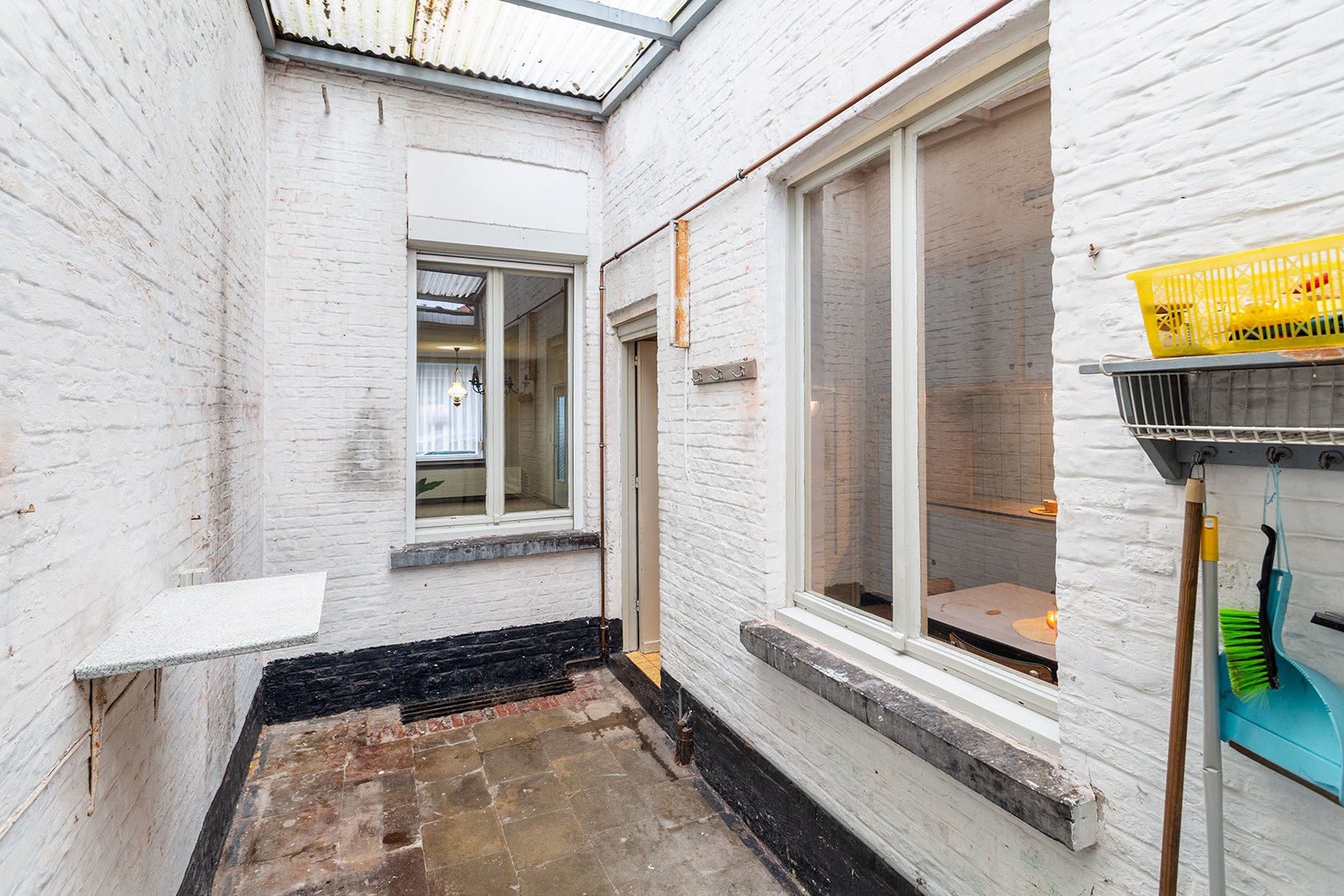 Achter deze charmante gevel bevindt zich een woning die volledig te renoveren is, maar tegelijk een uitzonderlijke kans biedt om ze volledig naar eigen smaak en noden in te richten. Via de inkomhal betreedt u de woning, die toegang biedt tot de lichtrijke leefruimte en de gesloten keuken. Vanuit de keuken bereikt u de overdekte stadskoer.