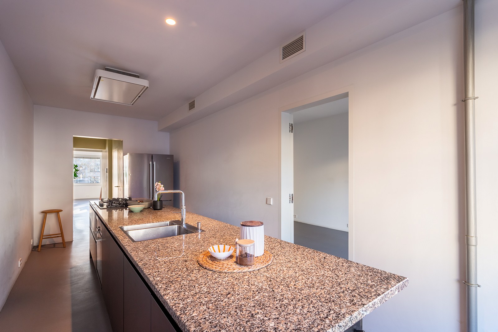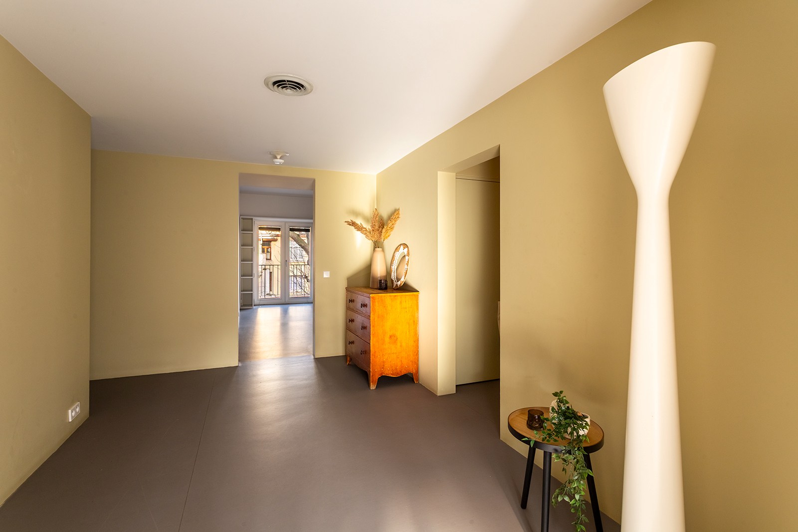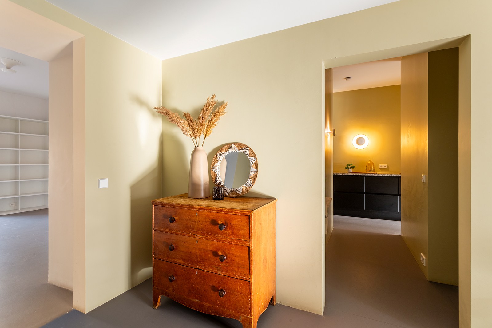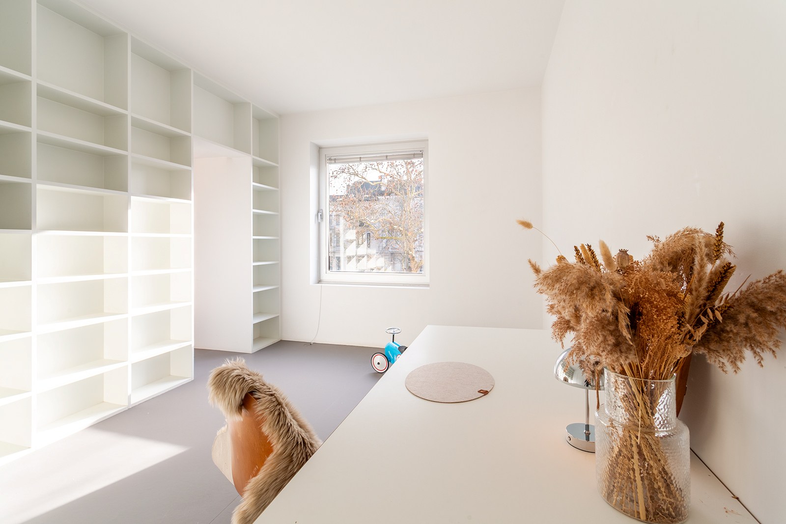 Dit appartement op de 2de verdieping onderging in 2018 een hoogwaardige renovatie onder architectuur van Wim De Vos. De focus lag op ‘licht, verbindingen en doorkijken’. Grote raampartijen, visuele doorzichten en een harmonieuze materiaalkeuze zorgen voor een gevoel van continuïteit en rust. De weloverwogen architecturale keuzes brengen samenhang en sereniteit: marmoleumvloeren die doorheen het hele appartement doorlopen, strategisch geplaatste openingen die zicht bieden van voor tot achter, en subtiele kleurnuances die meespelen met het natuurlijke daglicht.