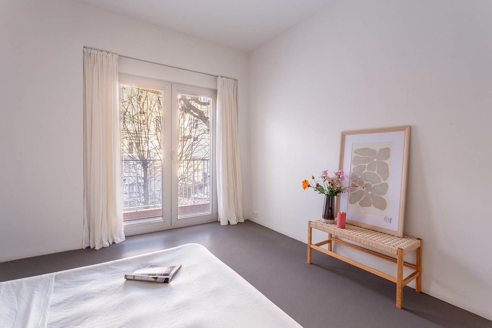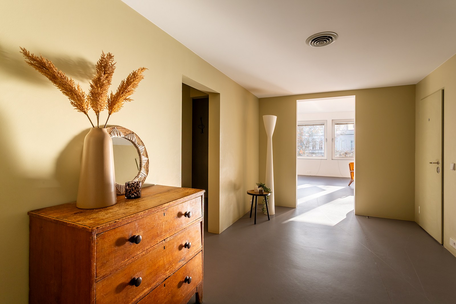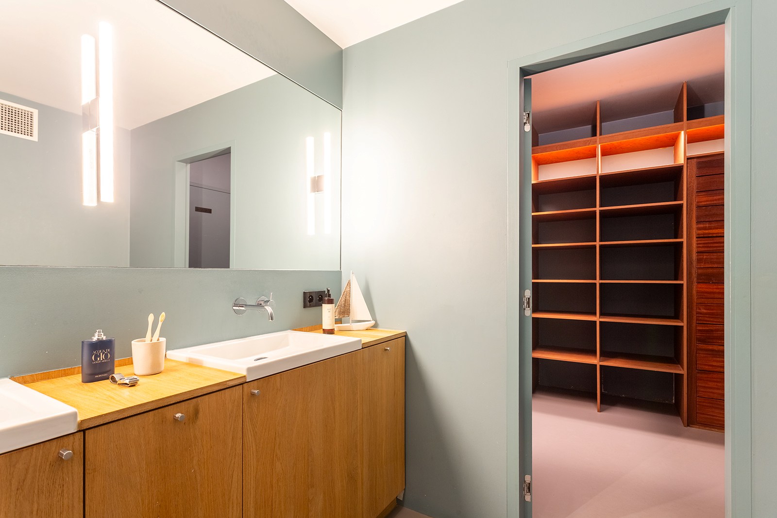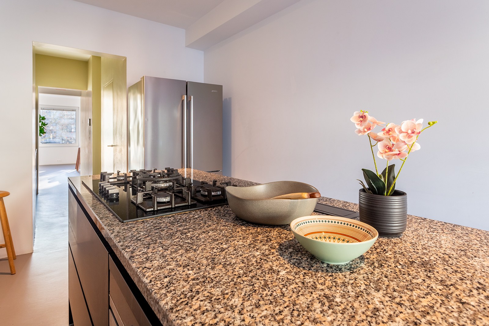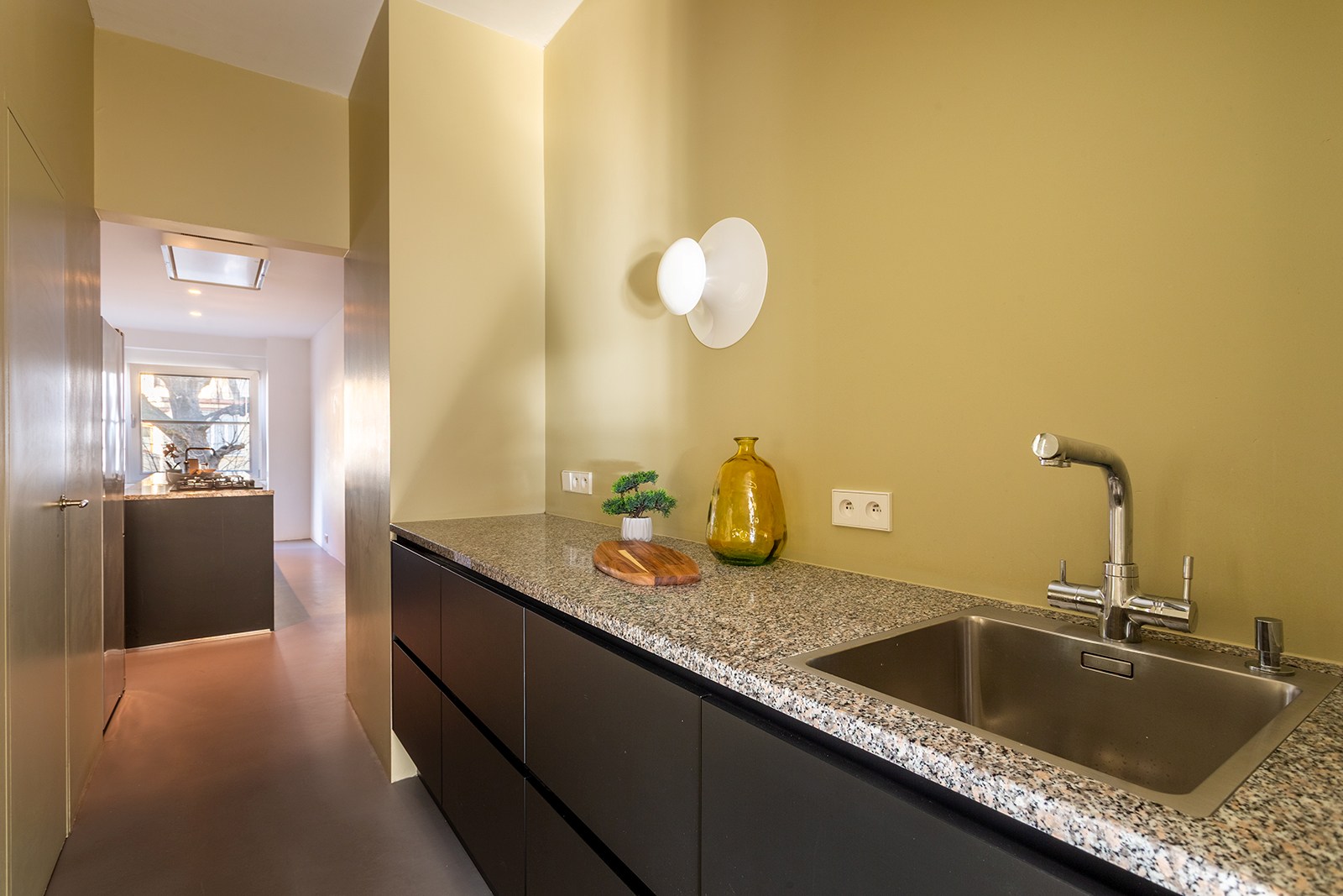 Dit appartement op de 2de verdieping onderging in 2018 een hoogwaardige renovatie onder architectuur van Wim De Vos. De focus lag op ‘licht, verbindingen en doorkijken’. Grote raampartijen, visuele doorzichten en een harmonieuze materiaalkeuze zorgen voor een gevoel van continuïteit en rust. De weloverwogen architecturale keuzes brengen samenhang en sereniteit: marmoleumvloeren die doorheen het hele appartement doorlopen, strategisch geplaatste openingen die zicht bieden van voor tot achter, en subtiele kleurnuances die meespelen met het natuurlijke daglicht.