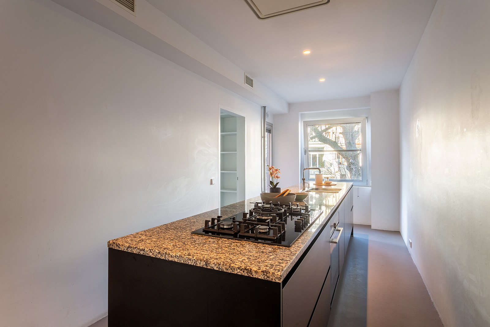De royale inkomhal verwelkomt je met een aparte vestiaire en een gastentoilet. De ruime leefruimte strekt zich uit langs de voorzijde van het gebouw en baadt in het licht. Een stijlvolle, maatgemaakte bibliotheekwand vormt de doorgang naar slaapkamer één of een kantoorruimte. De eetkeuken mét bijkeuken is een echte blikvanger met haar natuurstenen werkblad, slimme opbergoplossingen en zicht op de binnentuin. Aansluitend vind je een praktische berging en een apart bureau, dat evengoed dienst kan doen als extra slaapkamer. Achteraan liggen twee rustige slaapkamers met zicht op groen, een ruime dressing en een luxueuze badkamer.