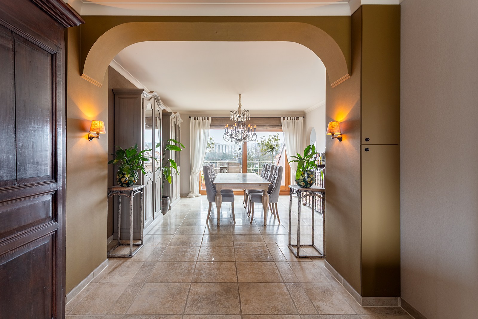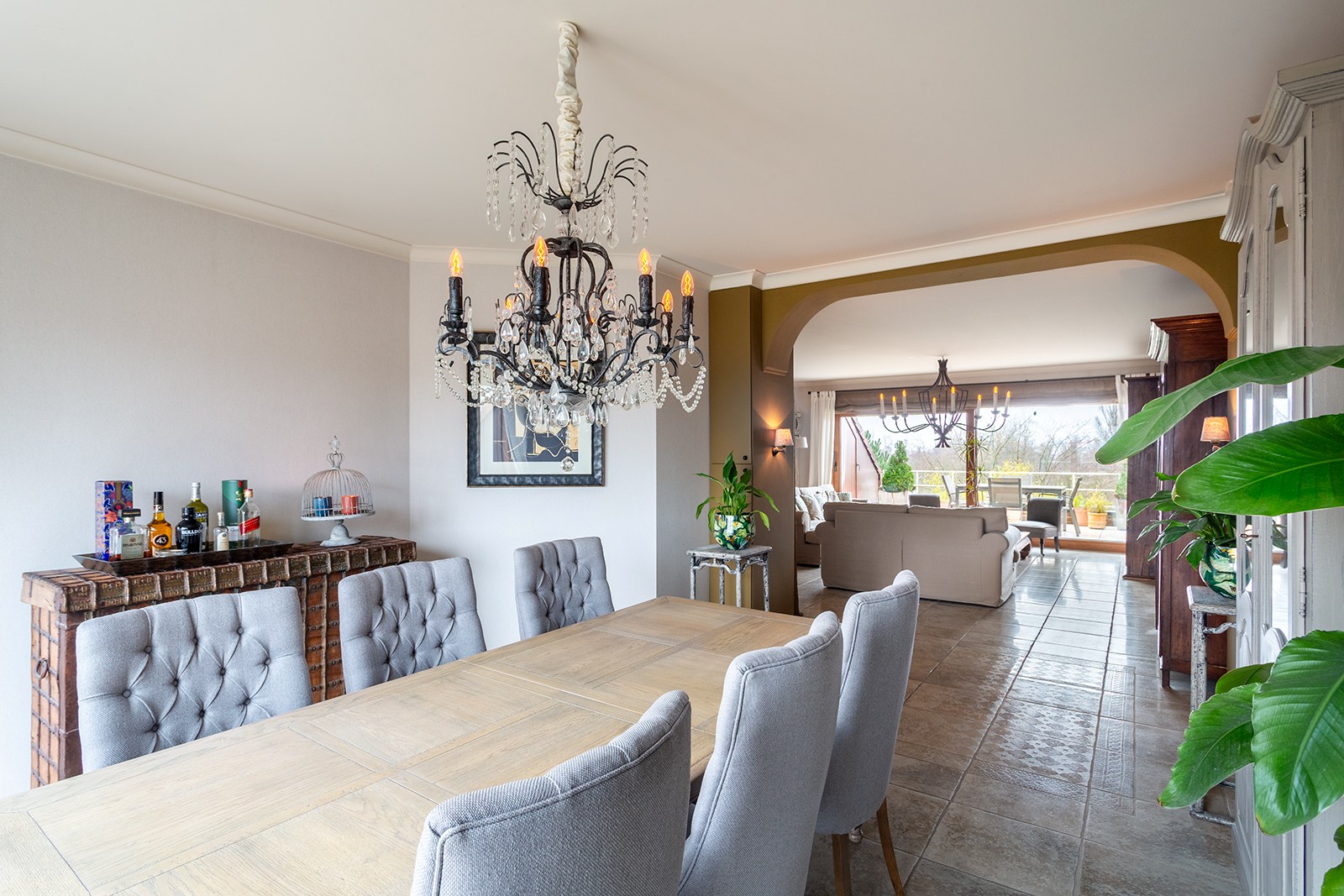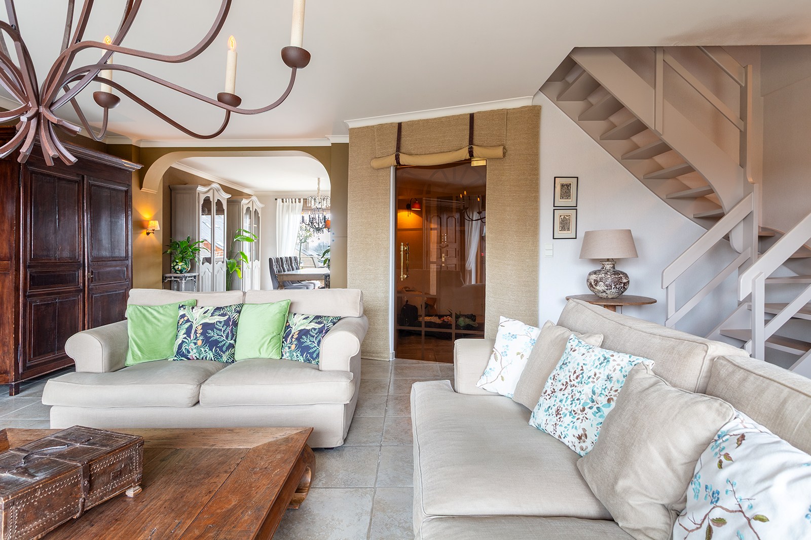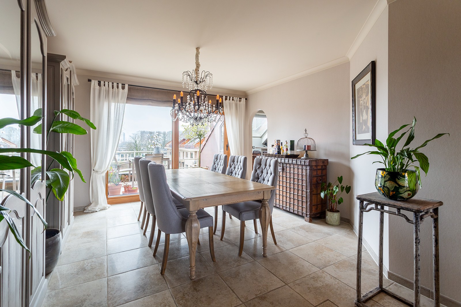 Inkomhal met apart gastentoilet en ingemaakte kasten. Ruime woonkamer met tegelvloer, bestaande uit een gezellige leefruimte met toegang tot het terras met uitzicht op het Sint-Annabos. Op het terras bevindt zich tevens een extra ruime berging. De eetkamer sluit naadloos aan op de leefruimte en geeft toegang tot een tweede terras met uitzicht op de binnentuin van de residentie. De open, volledig ingerichte keuken is voorzien van kasten en toestellen, waaronder een koelkast, combi-oven, inductiekookplaat en dampkap.
