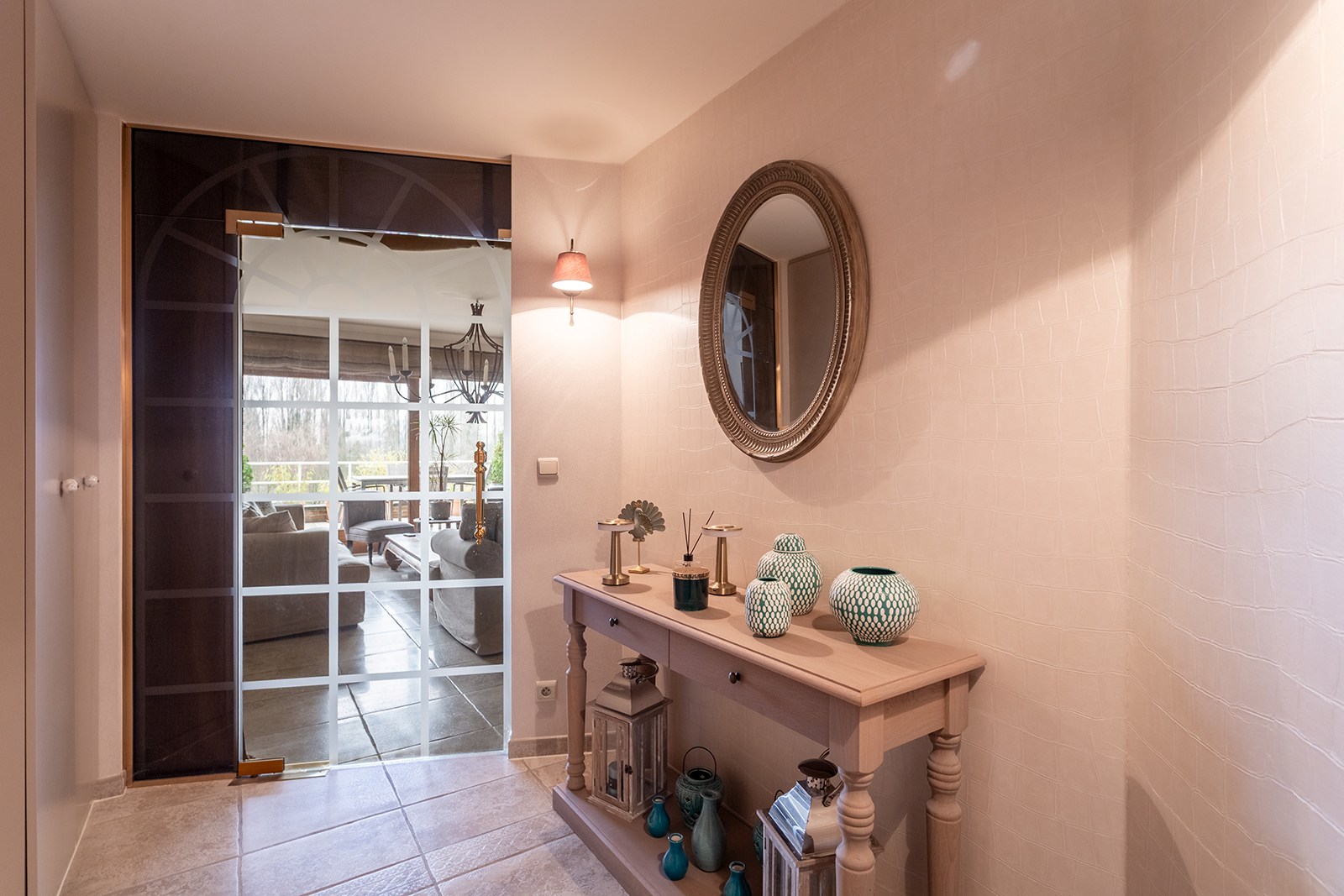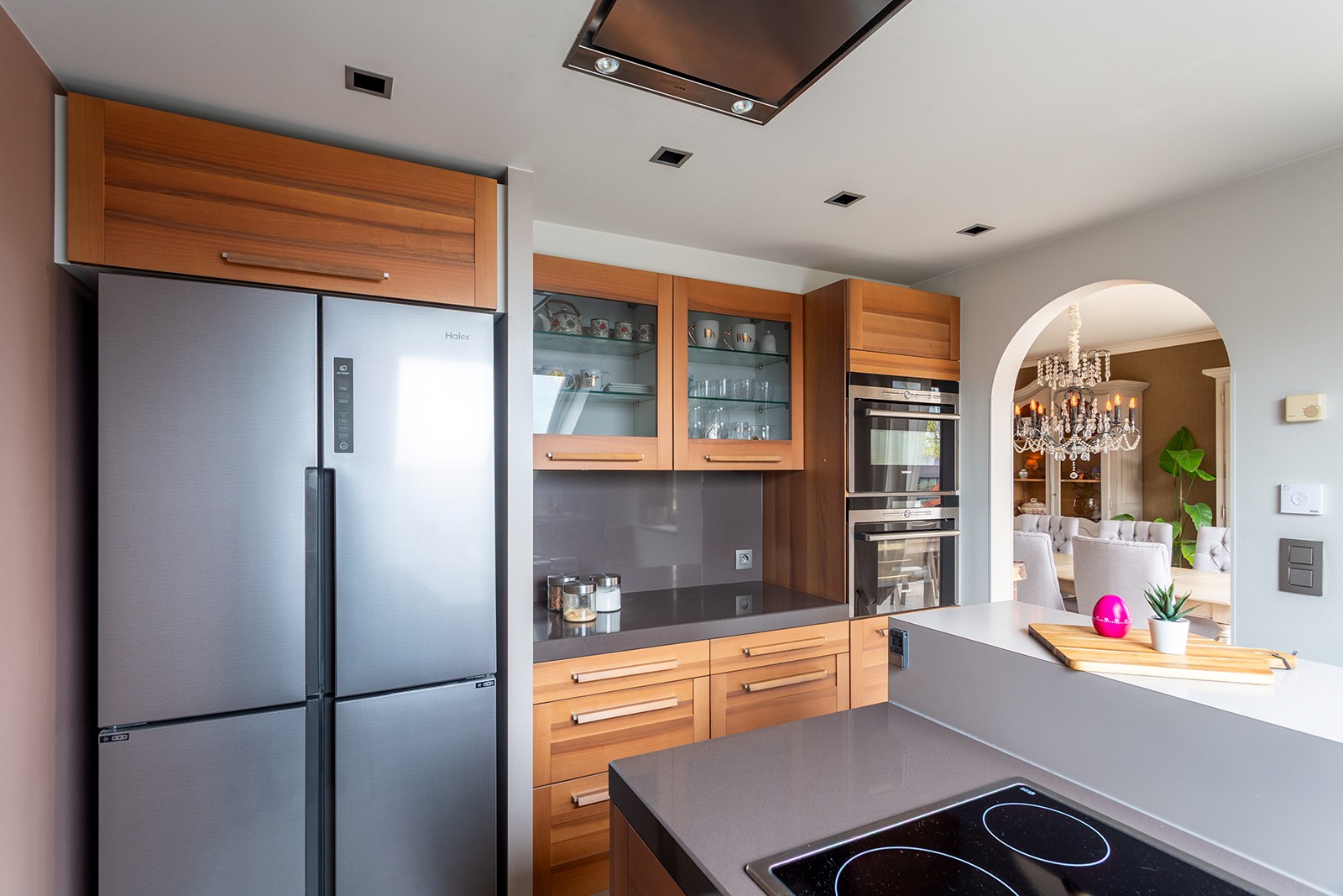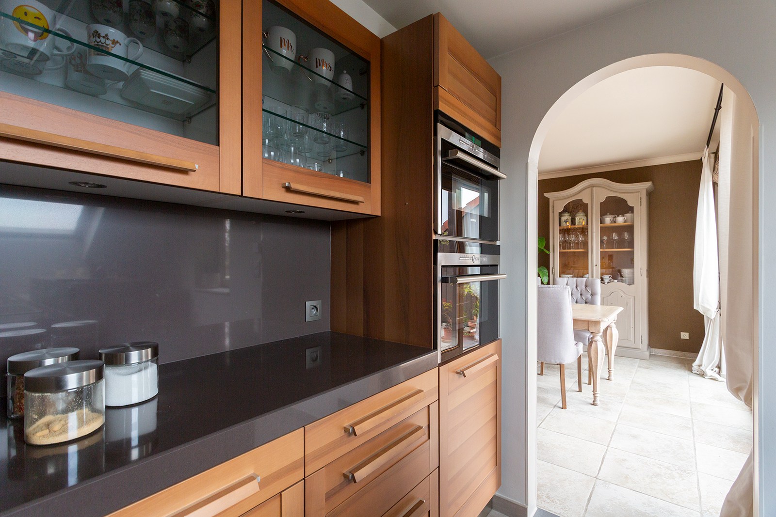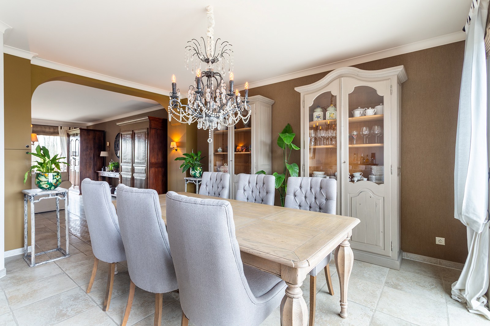 Inkomhal met apart gastentoilet en ingemaakte kasten. Ruime woonkamer met tegelvloer, bestaande uit een gezellige leefruimte met toegang tot het terras met uitzicht op het Sint-Annabos. Op het terras bevindt zich tevens een extra ruime berging. De eetkamer sluit naadloos aan op de leefruimte en geeft toegang tot een tweede terras met uitzicht op de binnentuin van de residentie. De open, volledig ingerichte keuken is voorzien van kasten en toestellen, waaronder een koelkast, combi-oven, inductiekookplaat en dampkap.