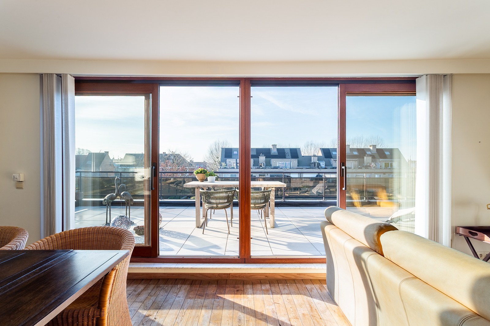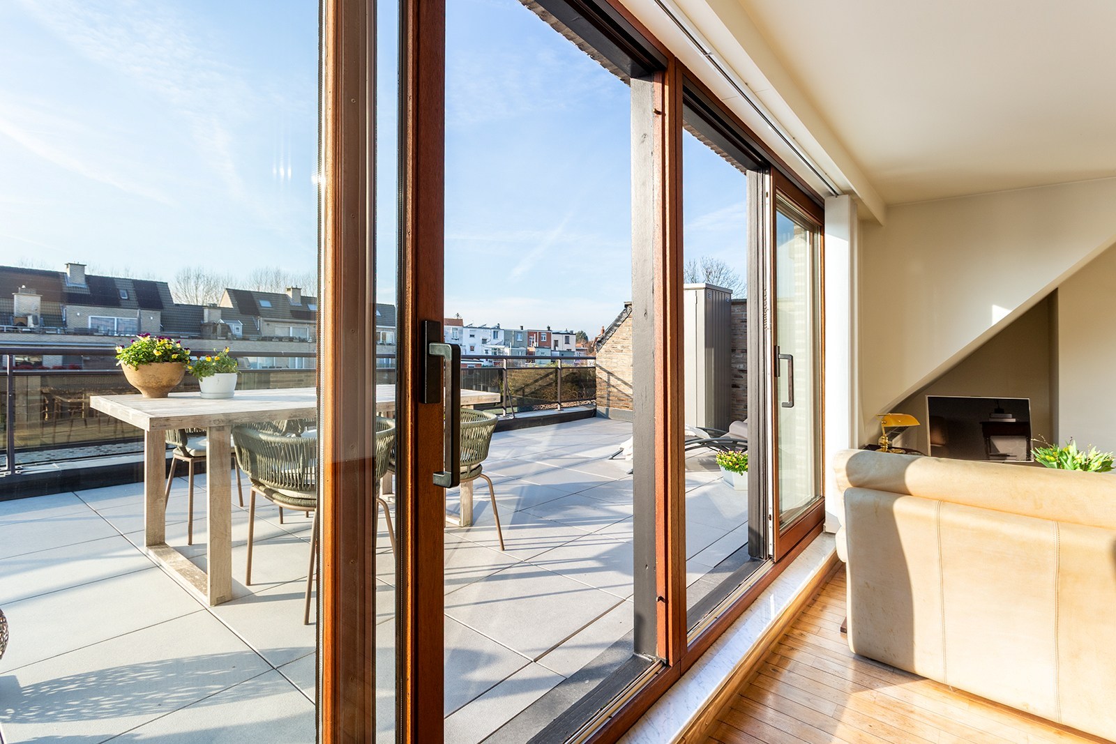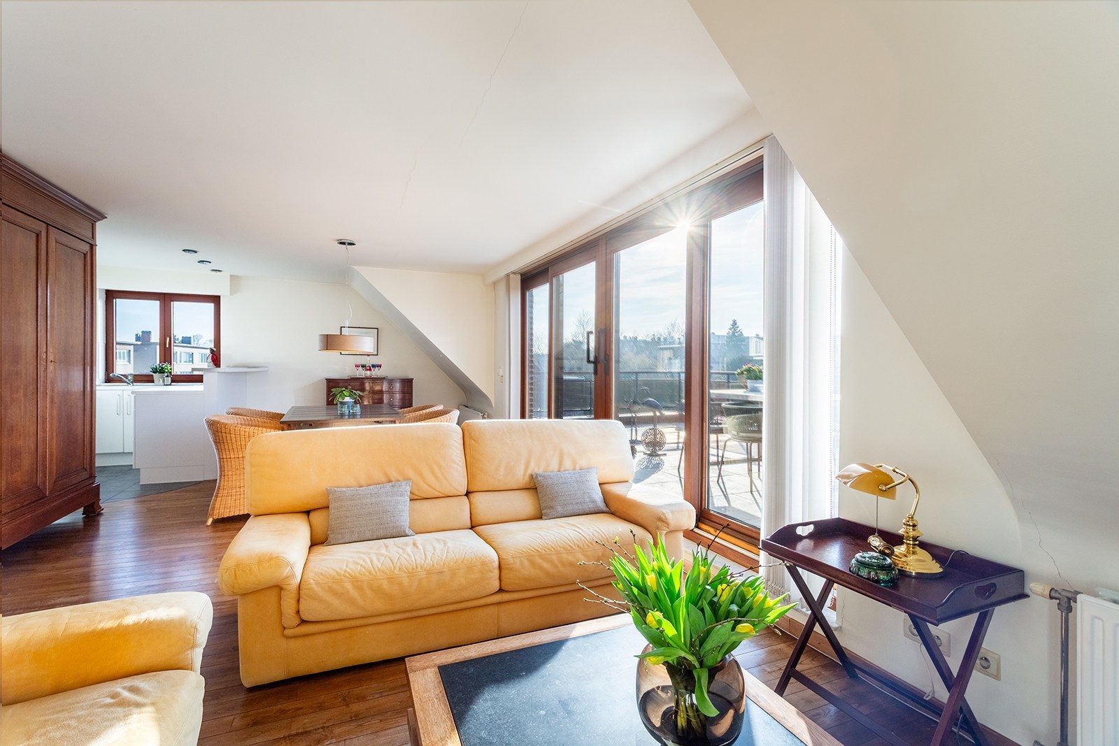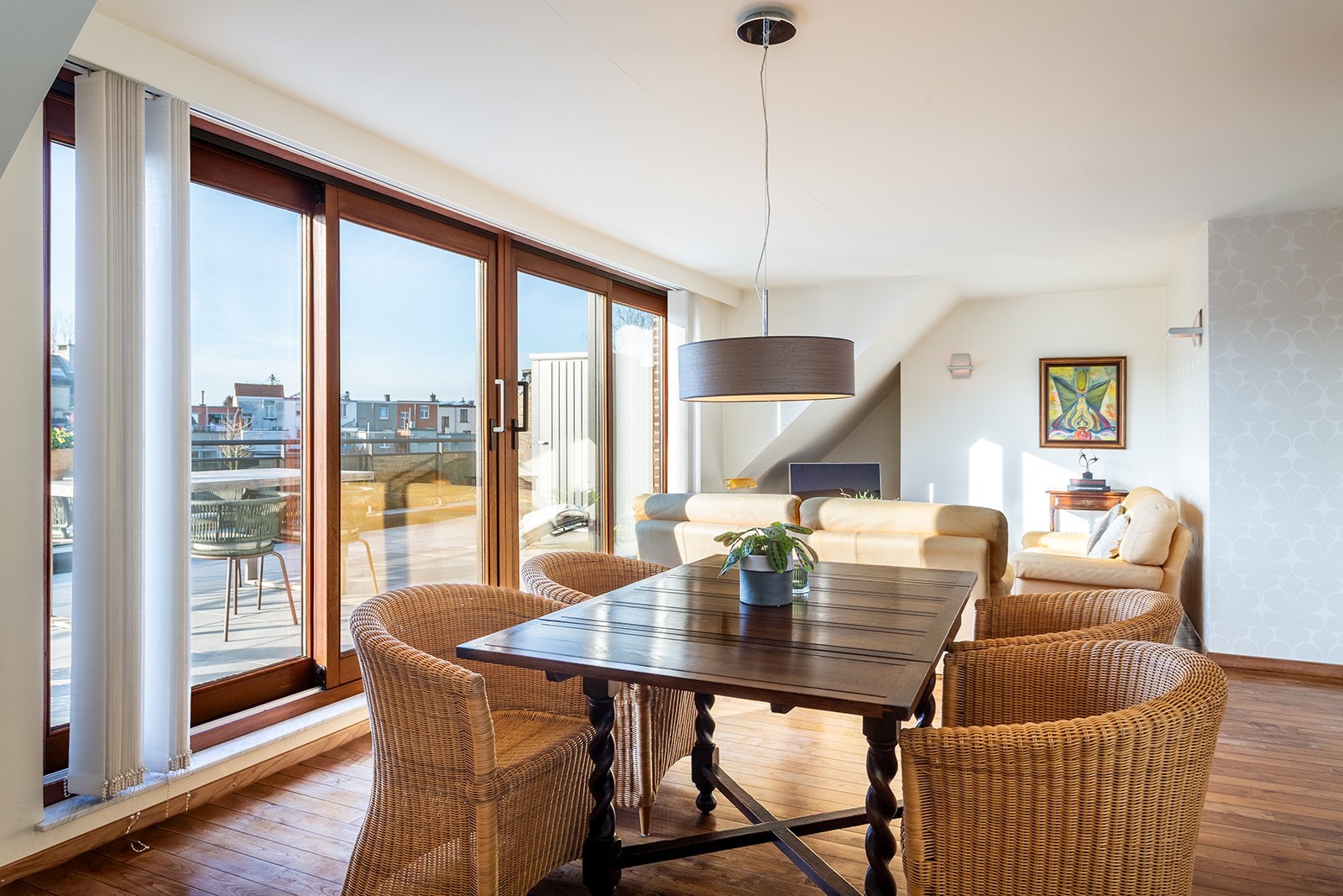 De lichtrijke leefruimte met open keuken vormt het hart van het appartement. Dankzij de grote raampartijen geniet je hier van veel natuurlijk licht en een aangename open sfeer. Vanuit de leefruimte heb je directe toegang tot het uitzonderlijk ruime terras.