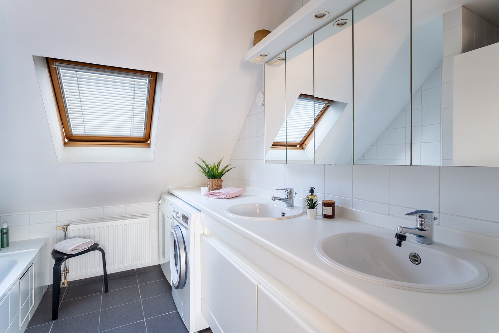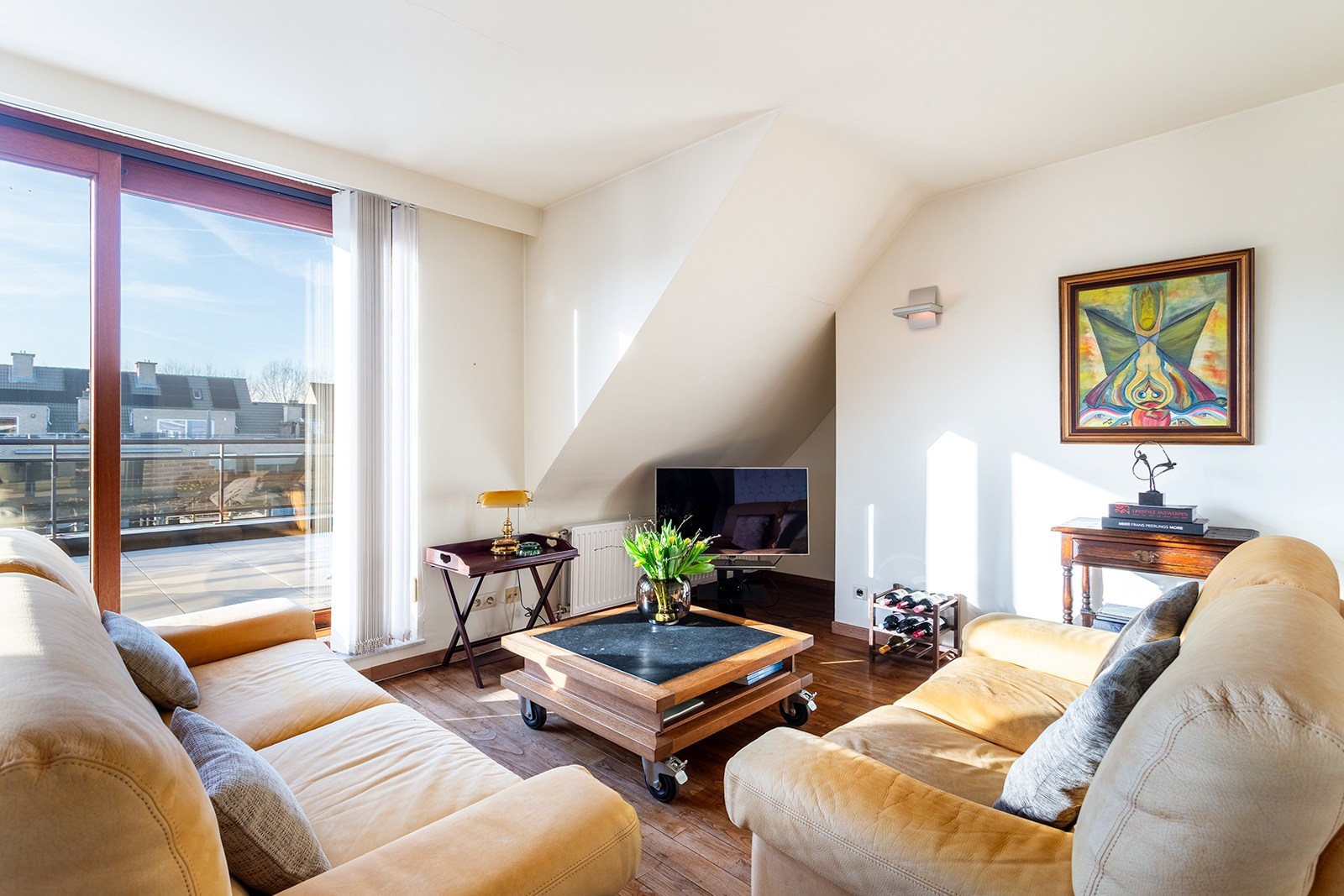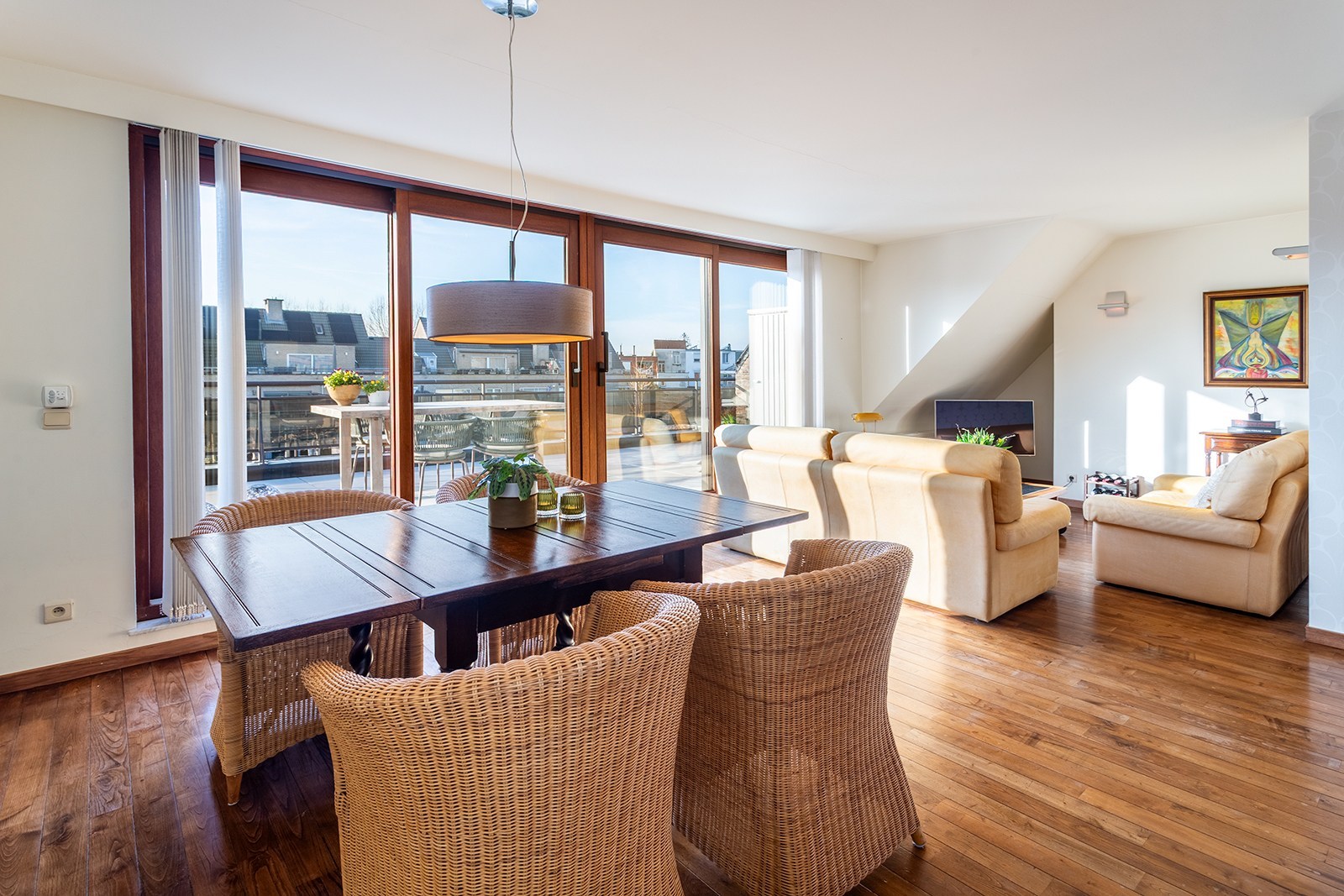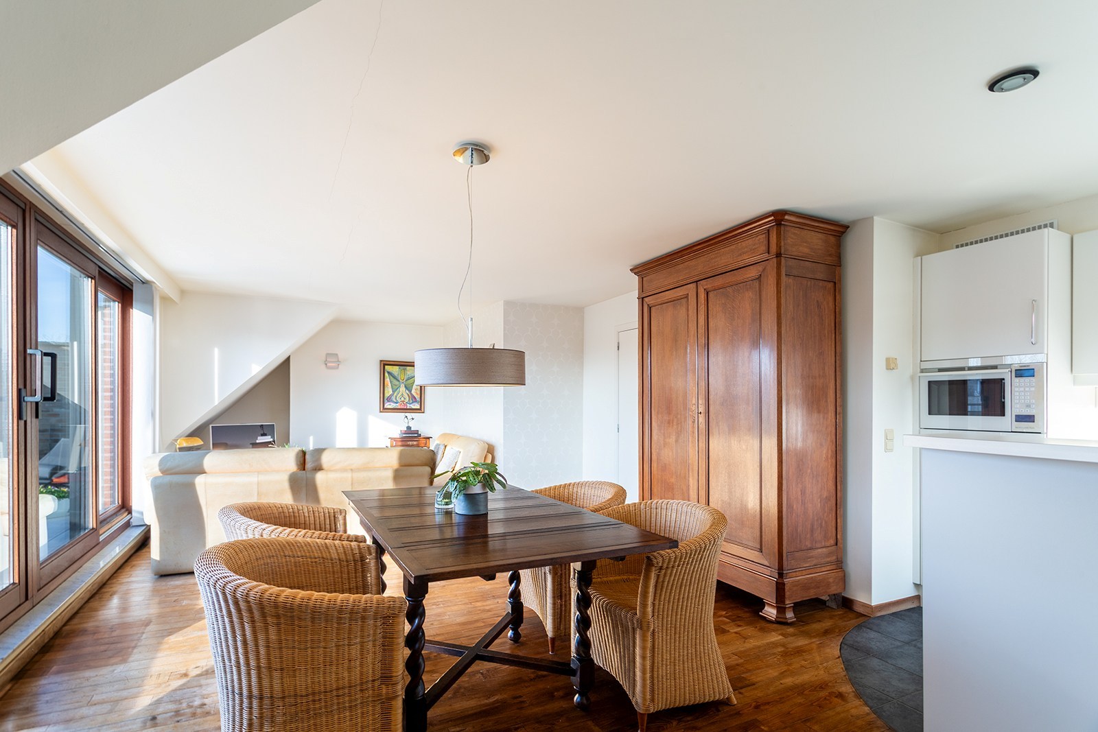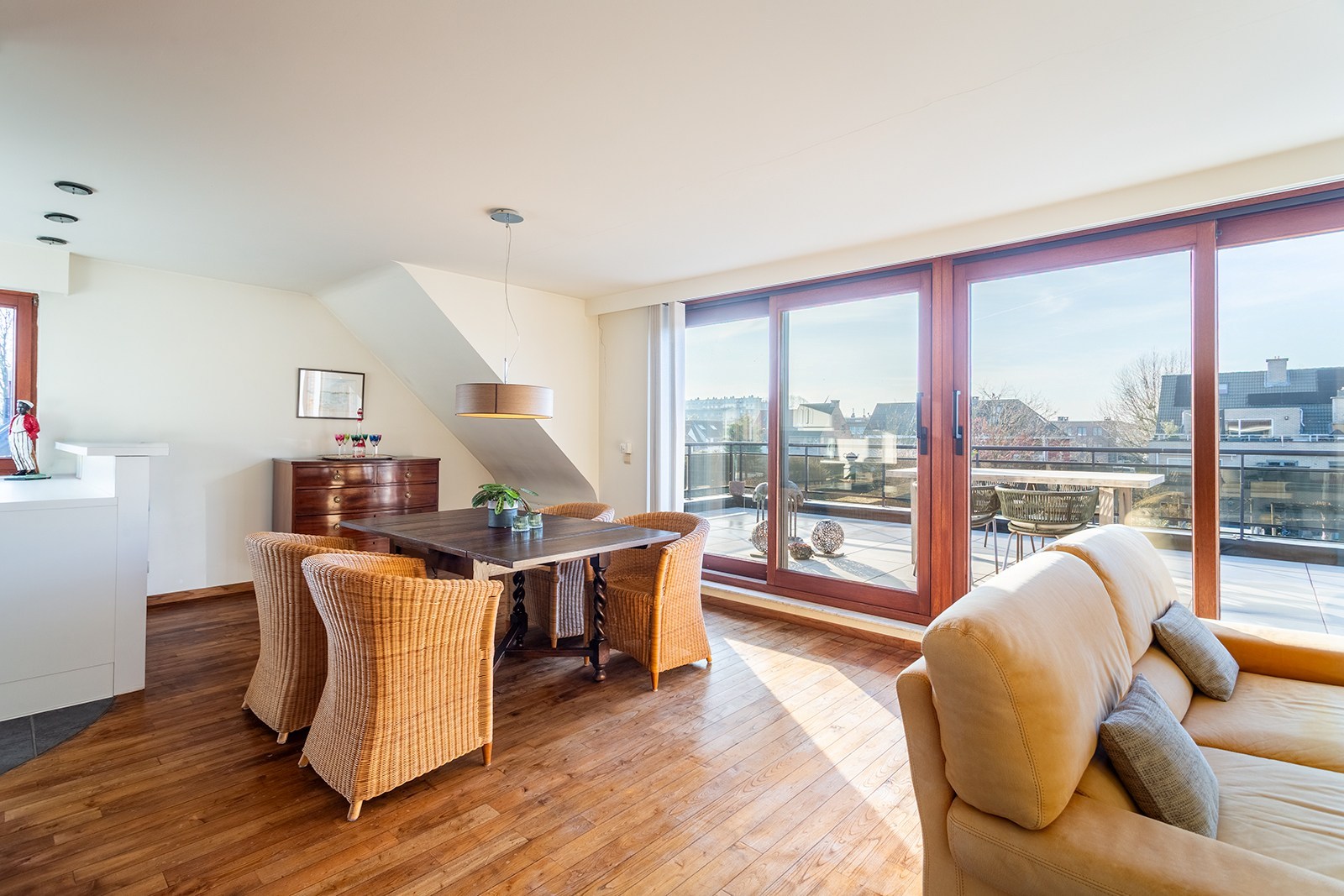 De lichtrijke leefruimte met open keuken vormt het hart van het appartement. Dankzij de grote raampartijen geniet je hier van veel natuurlijk licht en een aangename open sfeer. Vanuit de leefruimte heb je directe toegang tot het uitzonderlijk ruime terras.