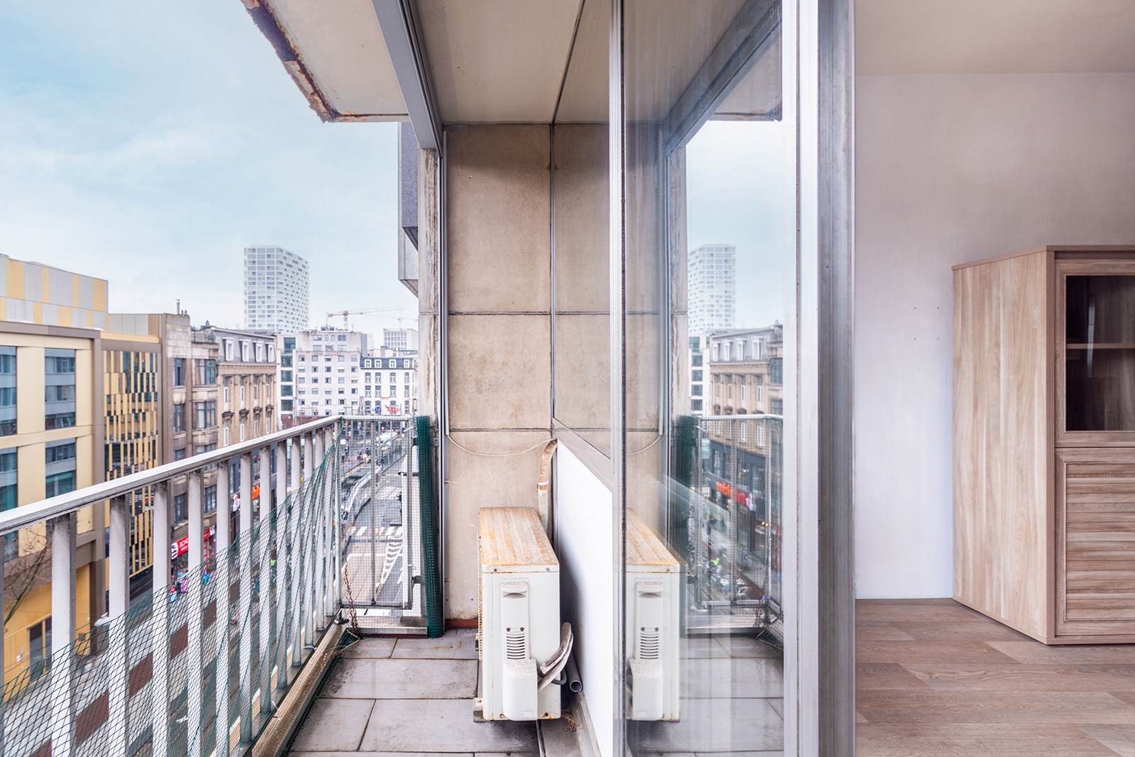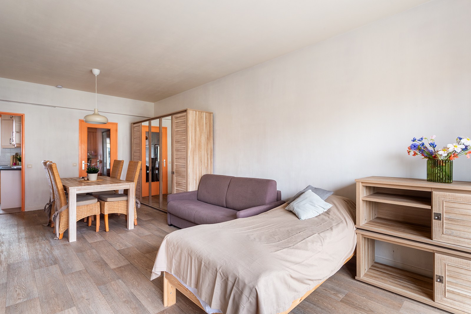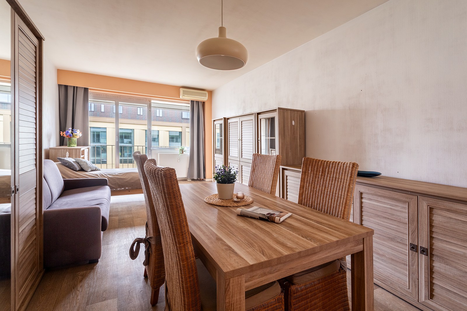 De studio is bereikbaar via de lift en bevindt zich op de 4de verdieping. Bij het betreden kom je in de inkomhal met ruimte voor een wasmachine en droogkast. De leefruimte biedt voldoende plaats voor een eetgedeelte en een zit-/slaapgedeelte en geeft toegang tot het aansluitende terras.