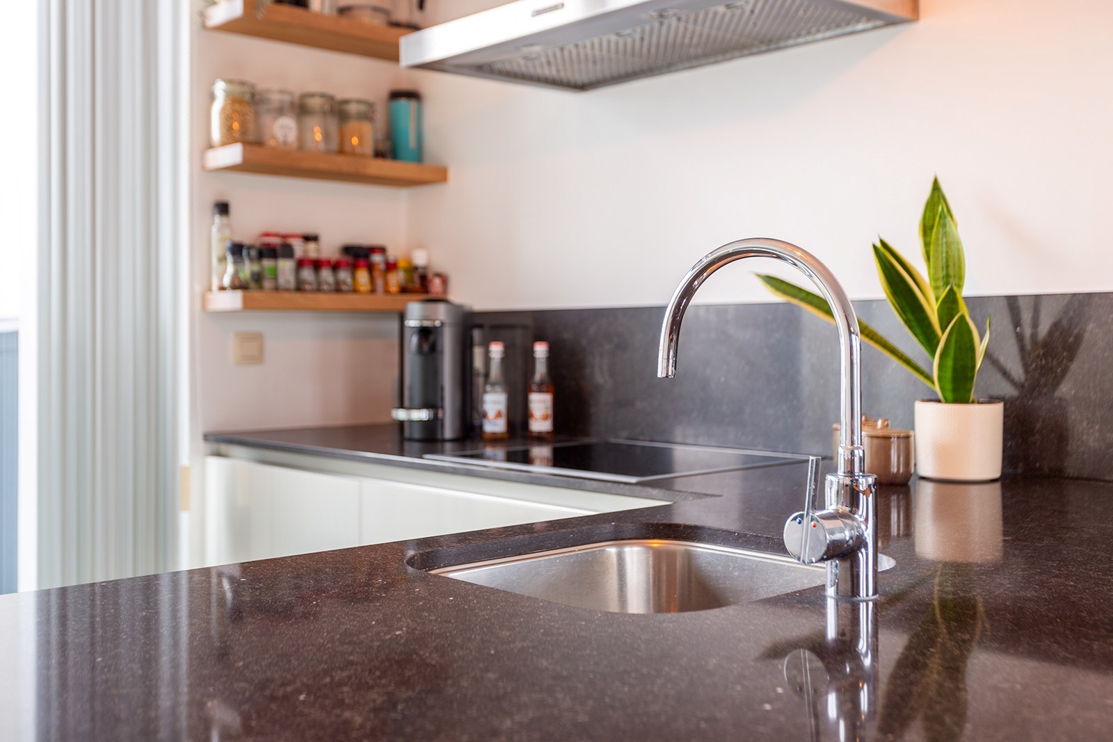 De open keuken is volledig ingericht en voorzien van kwalitatieve toestellen en een ruim werkblad, ideaal voor wie graag kookt en gasten ontvangt. Aansluitend bevindt zich een aparte bureauruimte, die eveneens perfect kan worden ingericht als extra slaapkamer.