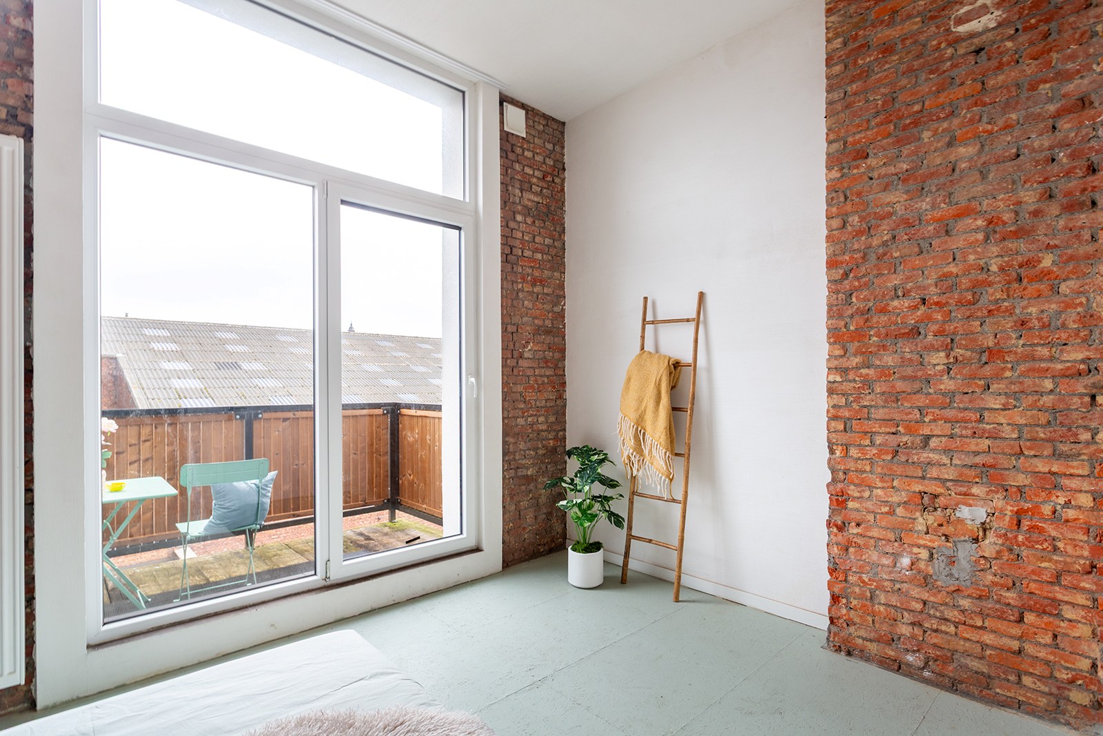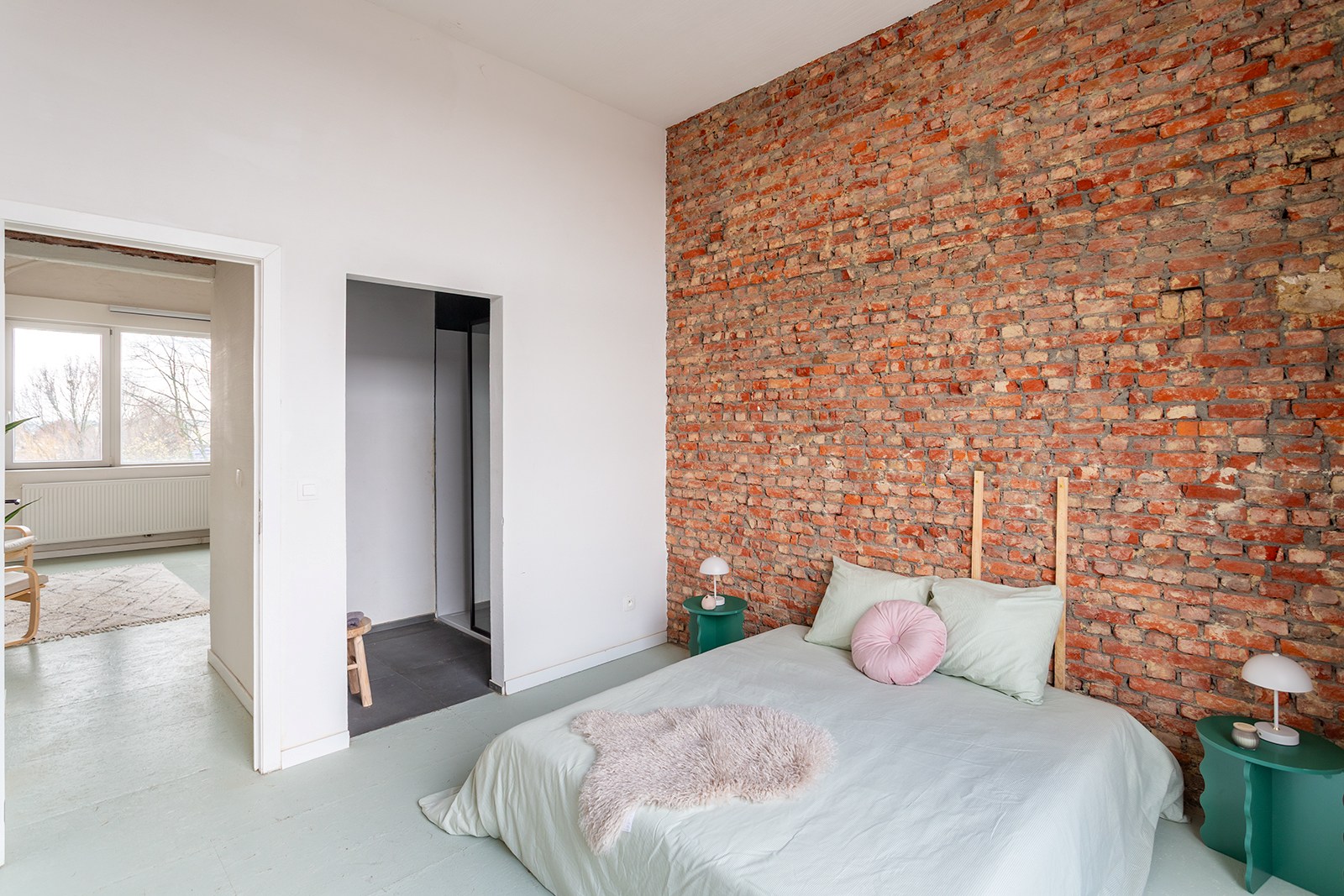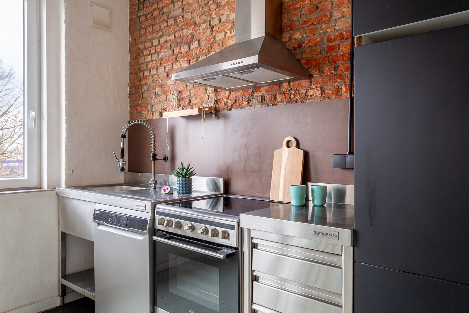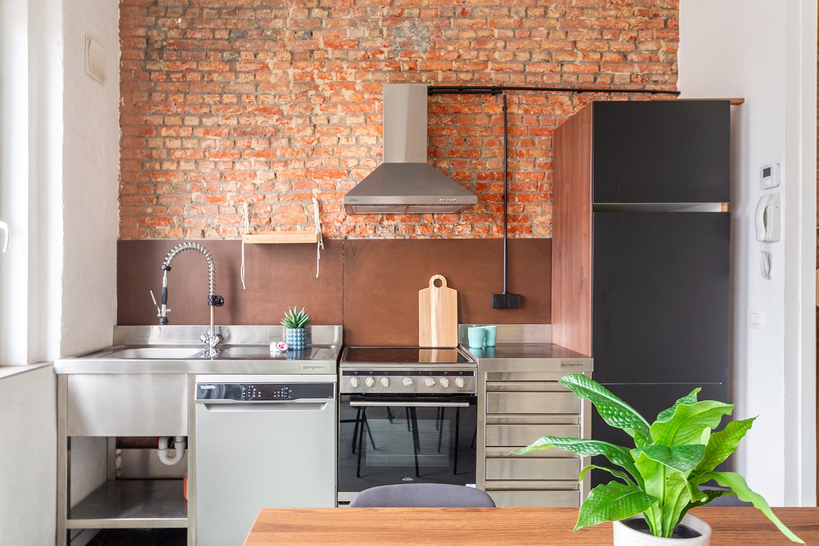 De lichtrijke leefruimte met open keuken biedt een aangename woon- en eetruimte. De keuken is volledig uitgerust en praktisch ingericht voor dagelijks gebruik. De karaktervolle bakstenen accenten geven het geheel een warme en eigentijdse uitstraling.