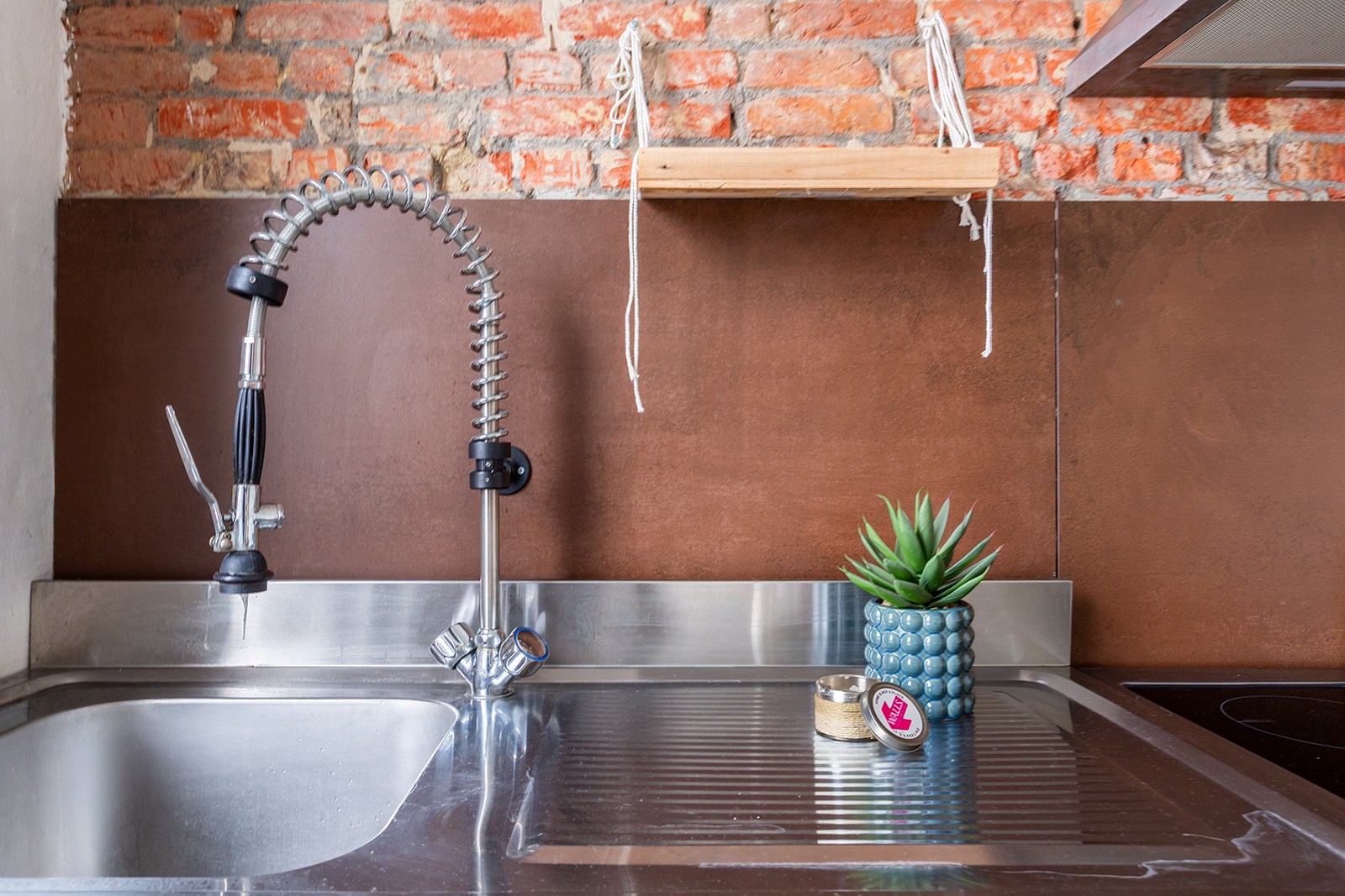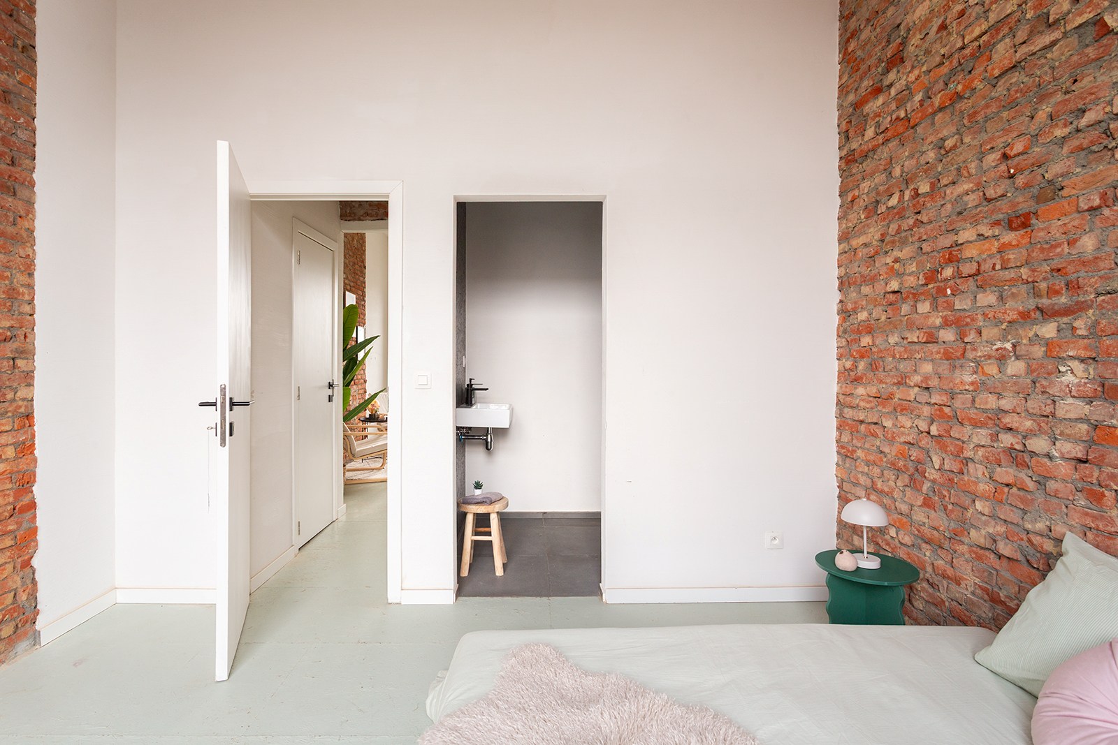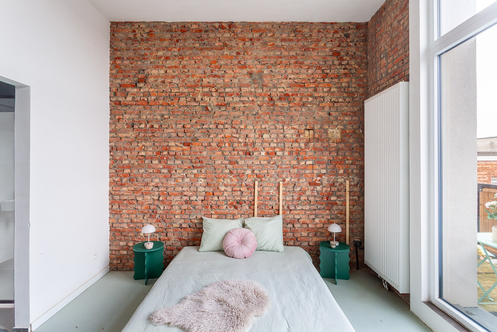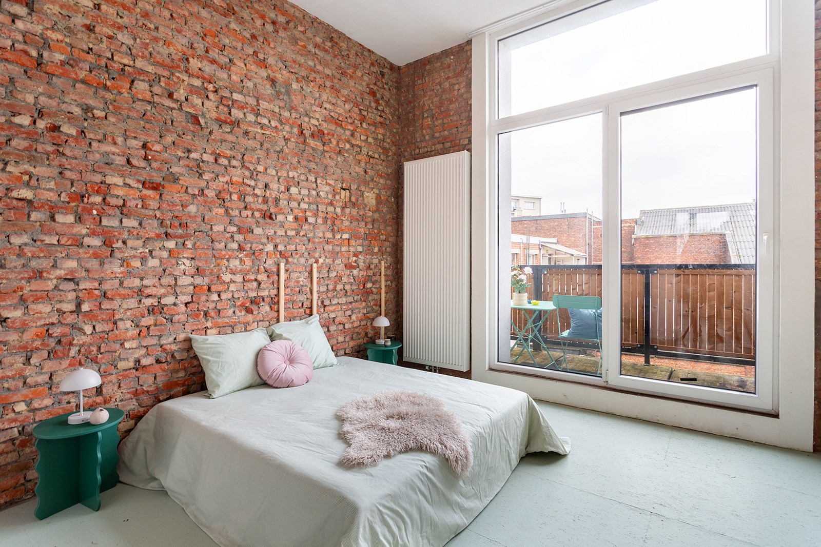 De lichtrijke leefruimte met open keuken biedt een aangename woon- en eetruimte. De keuken is volledig uitgerust en praktisch ingericht voor dagelijks gebruik. De karaktervolle bakstenen accenten geven het geheel een warme en eigentijdse uitstraling.