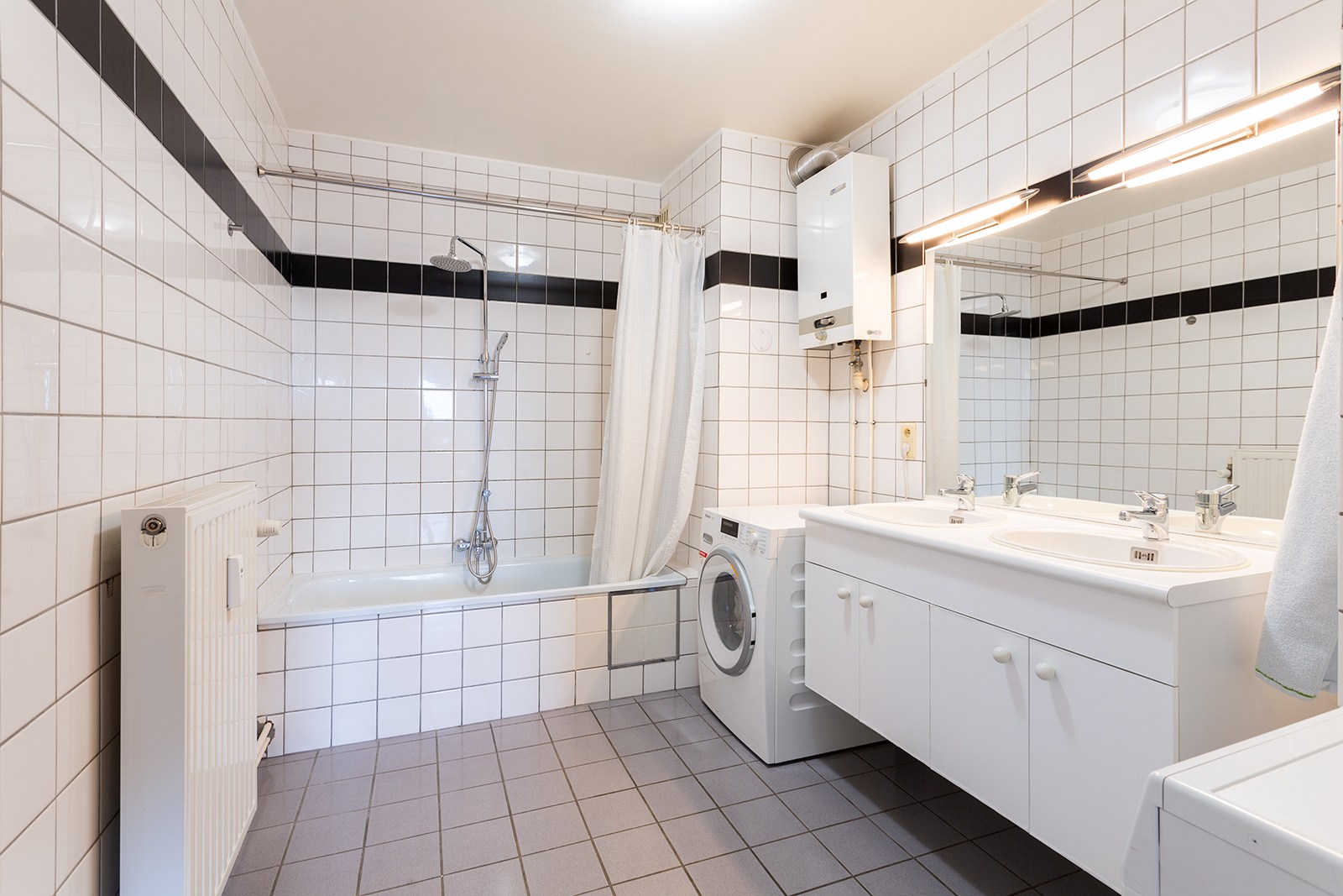 Aan de achterzijde van het appartement vinden we een apart gastentoilet en een ruime badkamer met een dubbel lavabomeubel, een ligbad met douchefunctie en aansluitingen voor een wasmachine en droogkast.