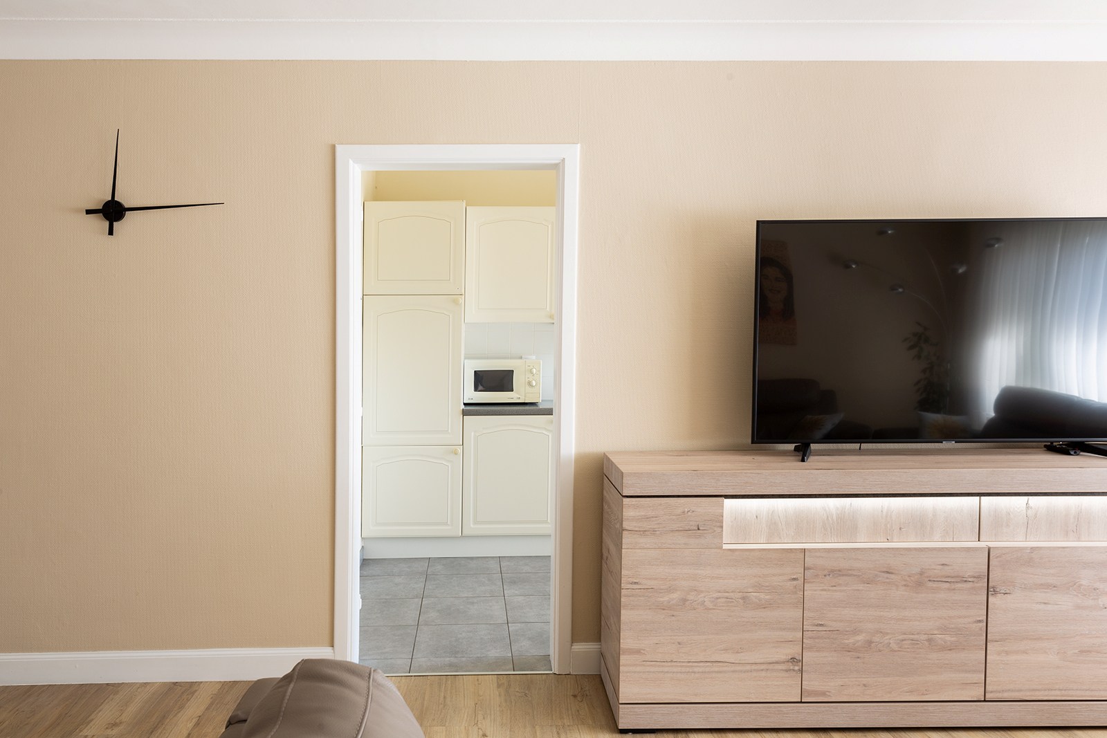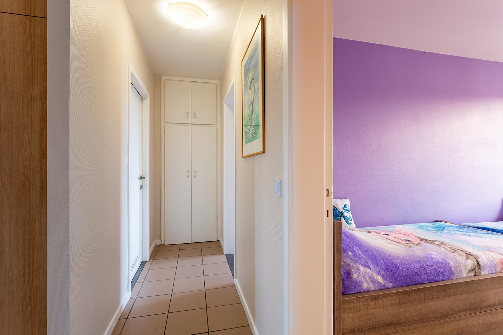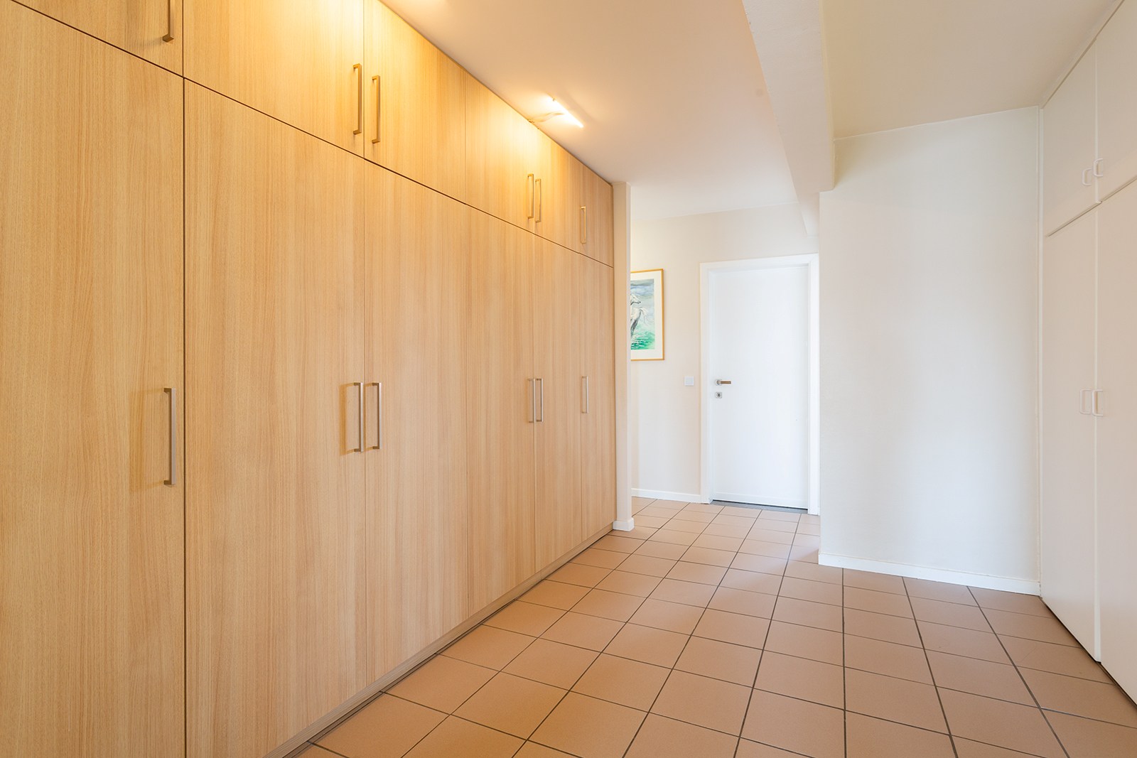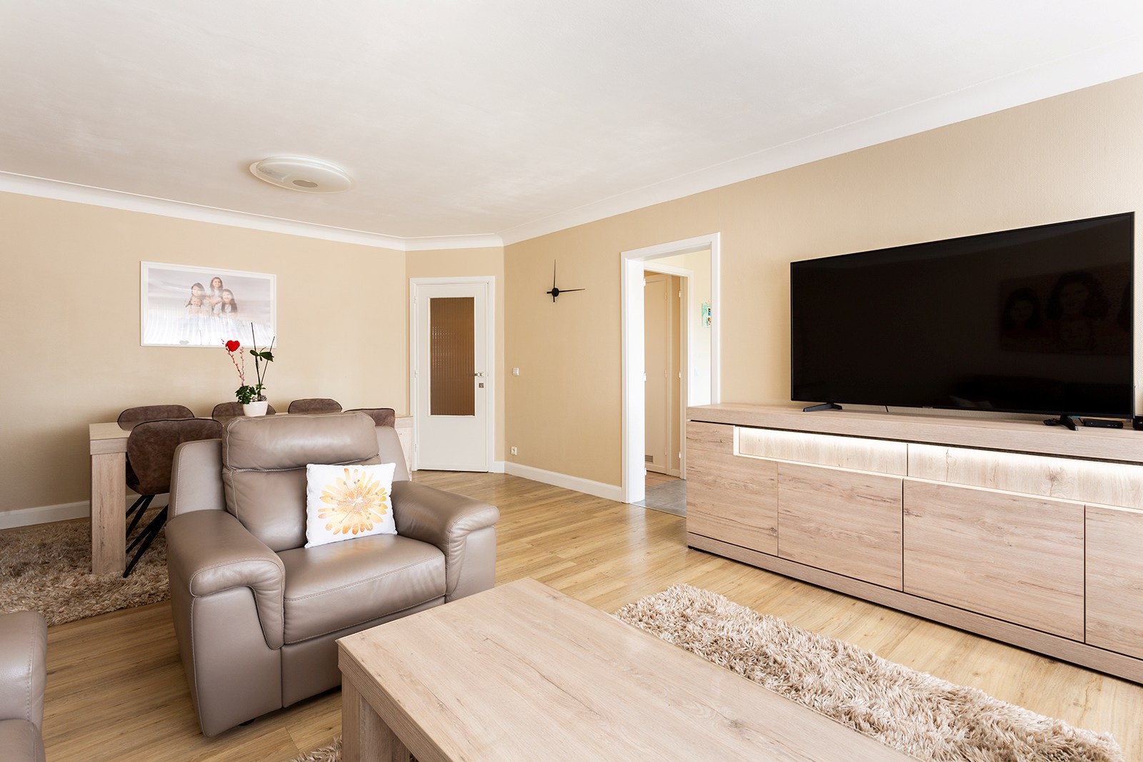 Via de ruime inkomhal, voorzien van talrijke ingebouwde kasten (ideaal als vestiaire en extra bergruimte), krijg je toegang tot alle ruimtes van het appartement. De hal leidt naar de ruime en lichtrijke leefruimte. Aansluitend bevindt zich de keuken, uitgerust met alle comfort en met toegang tot het terras.