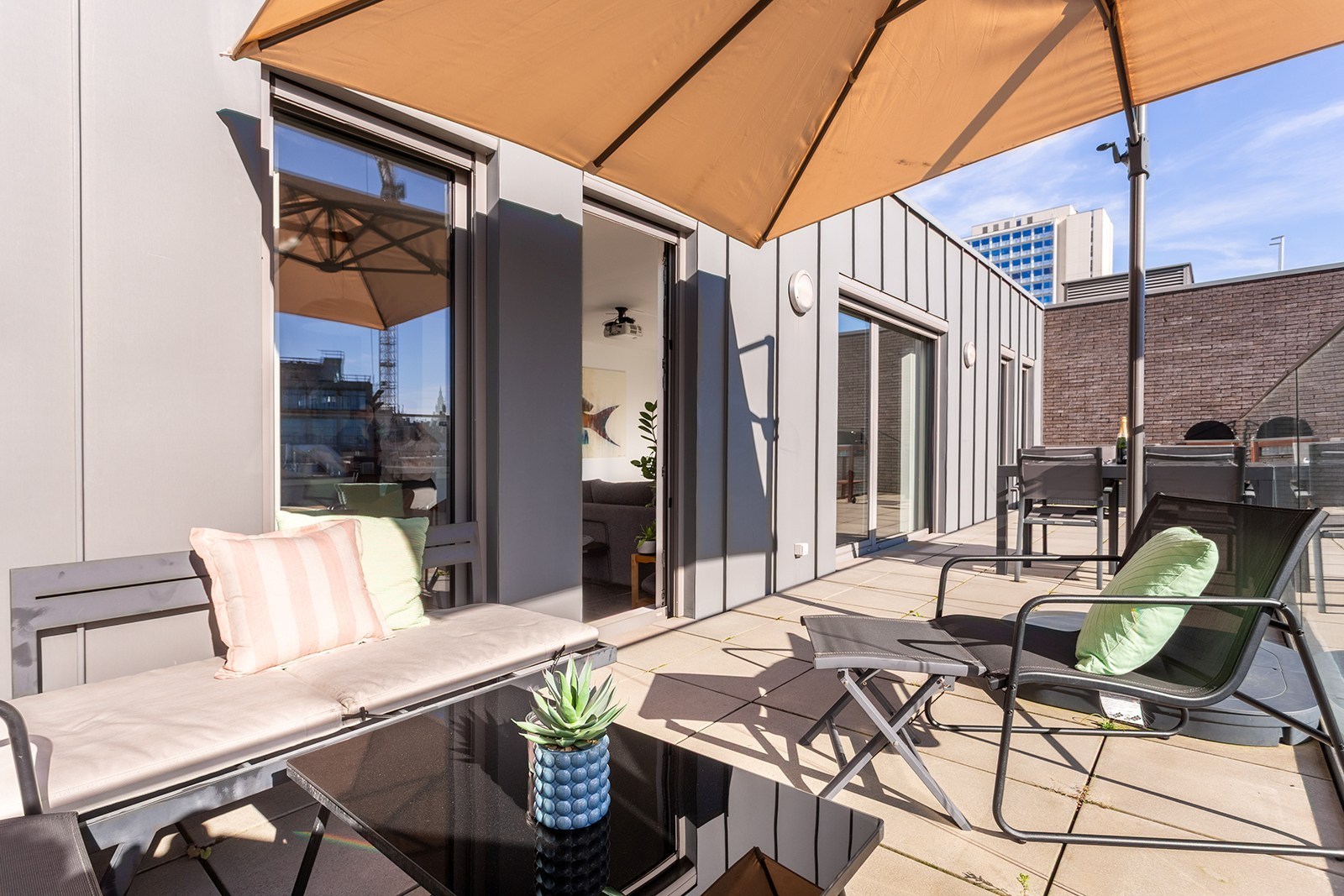 Deze instapklare penthouse bevindt zich op de bovenste verdieping van een recente en verzorgde residentie. We betreden het appartement via de inkomhal voorzien van bergruimte. De lichtrijke leefruimte geeft via grote raampartijen toegang tot twee ruime zonneterrassen aan weerszijden van het appartement. Hierdoor geniet u de hele dag door van natuurlijk licht en een prachtig panoramisch uitzicht over de stad.