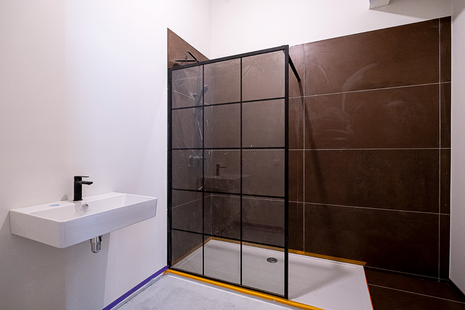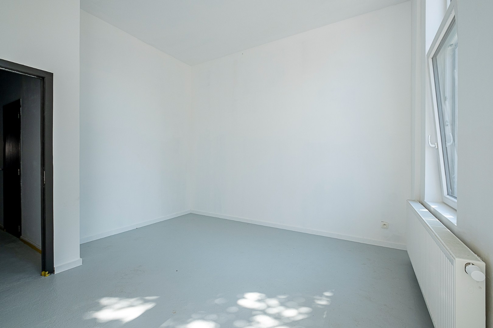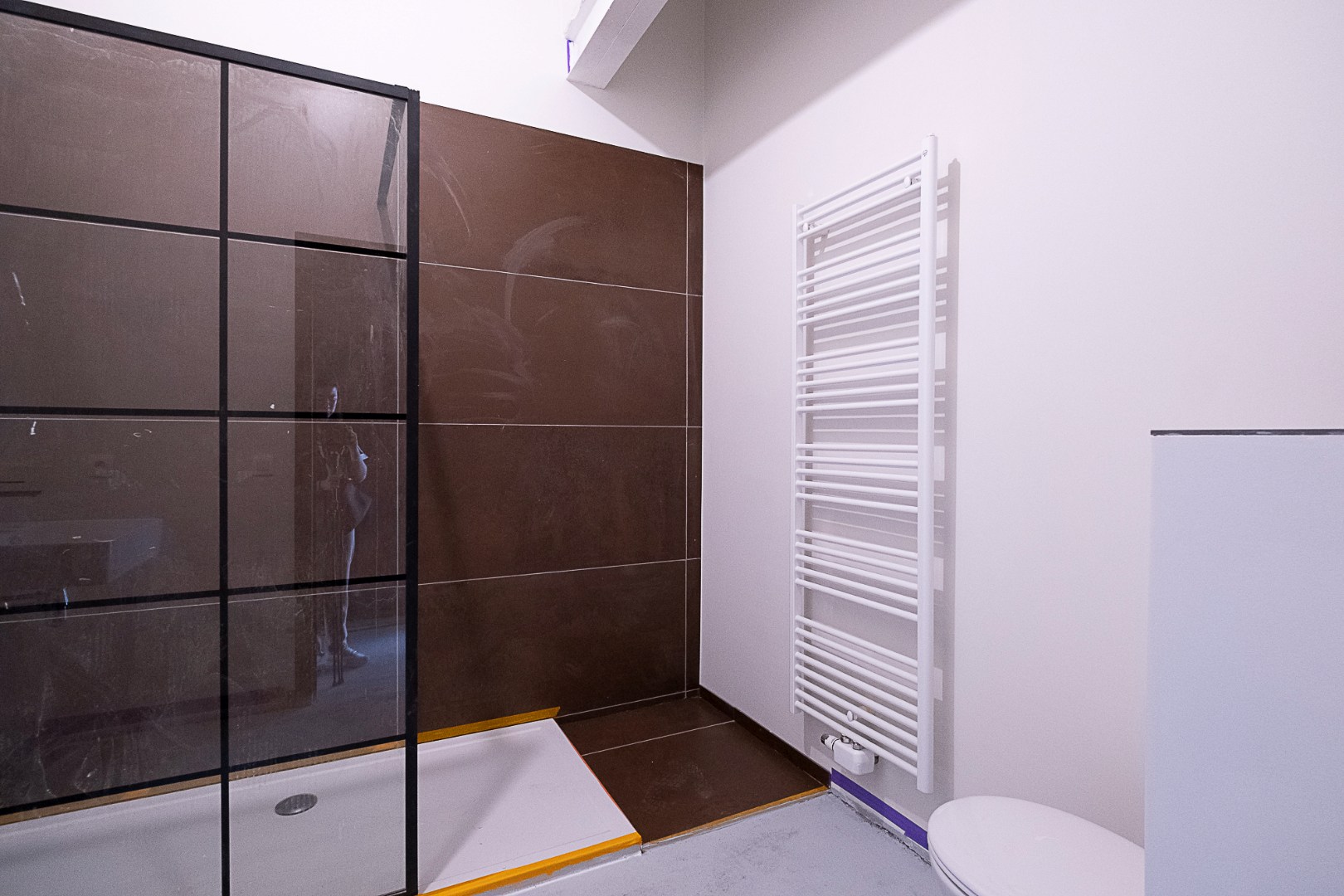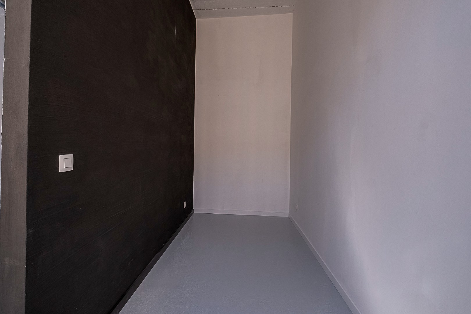 Bij het betreden van het appartement kom je in een lichtrijke leefruimte met open keuken. De grote raampartijen en dakkoepels zorgen voor een aangename natuurlijke lichtinval. De strakke afwerking en metalen accenten geven het appartement een unieke, hedendaagse uitstraling. De open keuken is praktisch ingericht, ideaal voor wie houdt van een minimalistische en functionele leefomgeving.