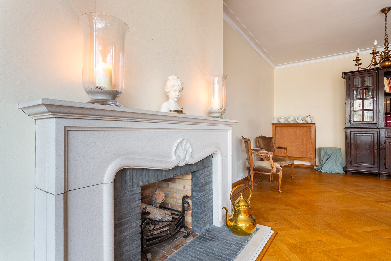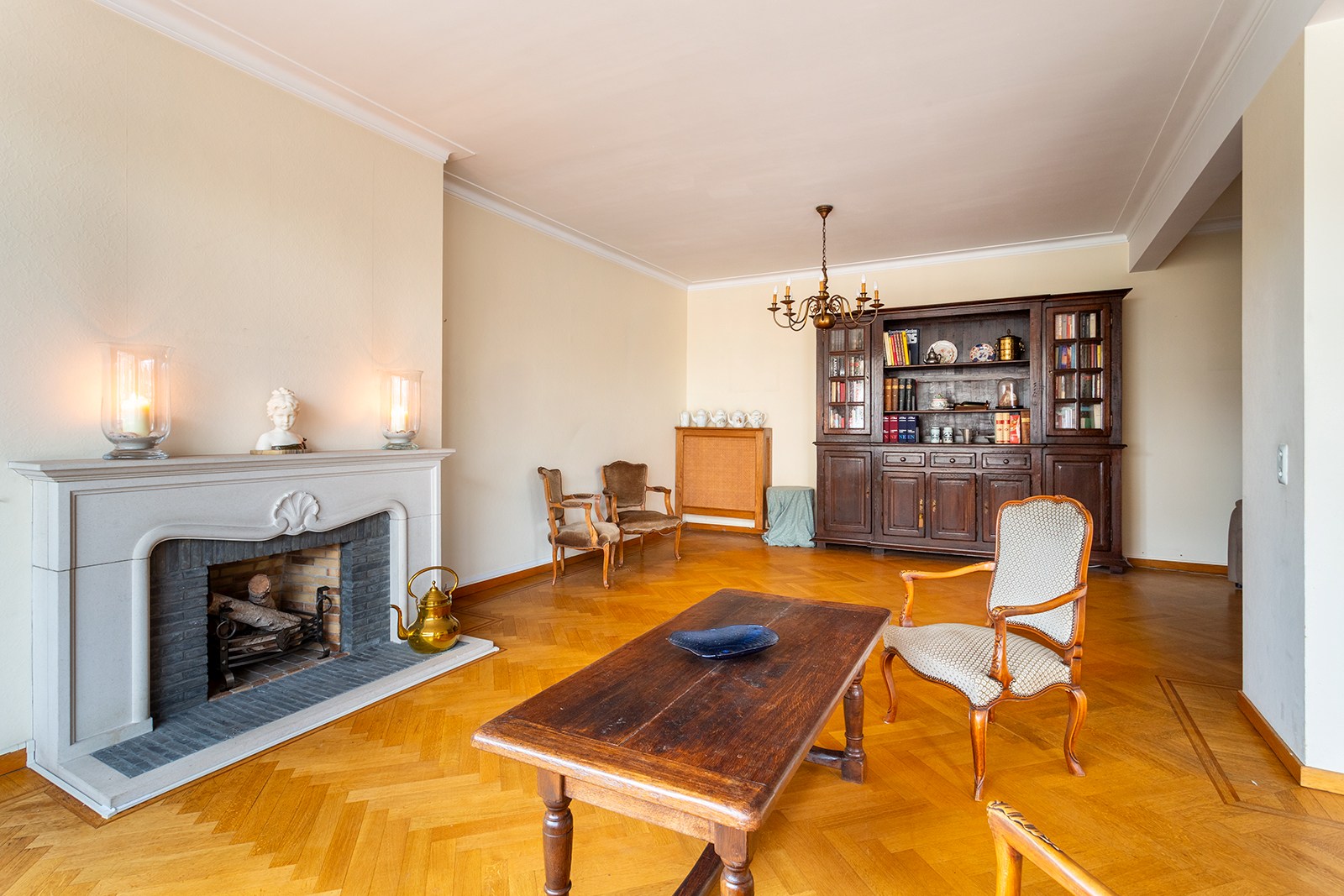 Bij het betreden kom je in een ruime inkomhal met voldoende vestiaireruimte. De royale leefruimte aan de voorzijde valt meteen op door de grote raampartijen over de volledige breedte, wat zorgt voor een aangename lichtinval doorheen de dag. Authentieke elementen zoals de parketvloer en de charmante schouw geven het geheel een warme uitstraling. Vanuit de leefruimte heb je bovendien directe toegang tot het eerste terras.